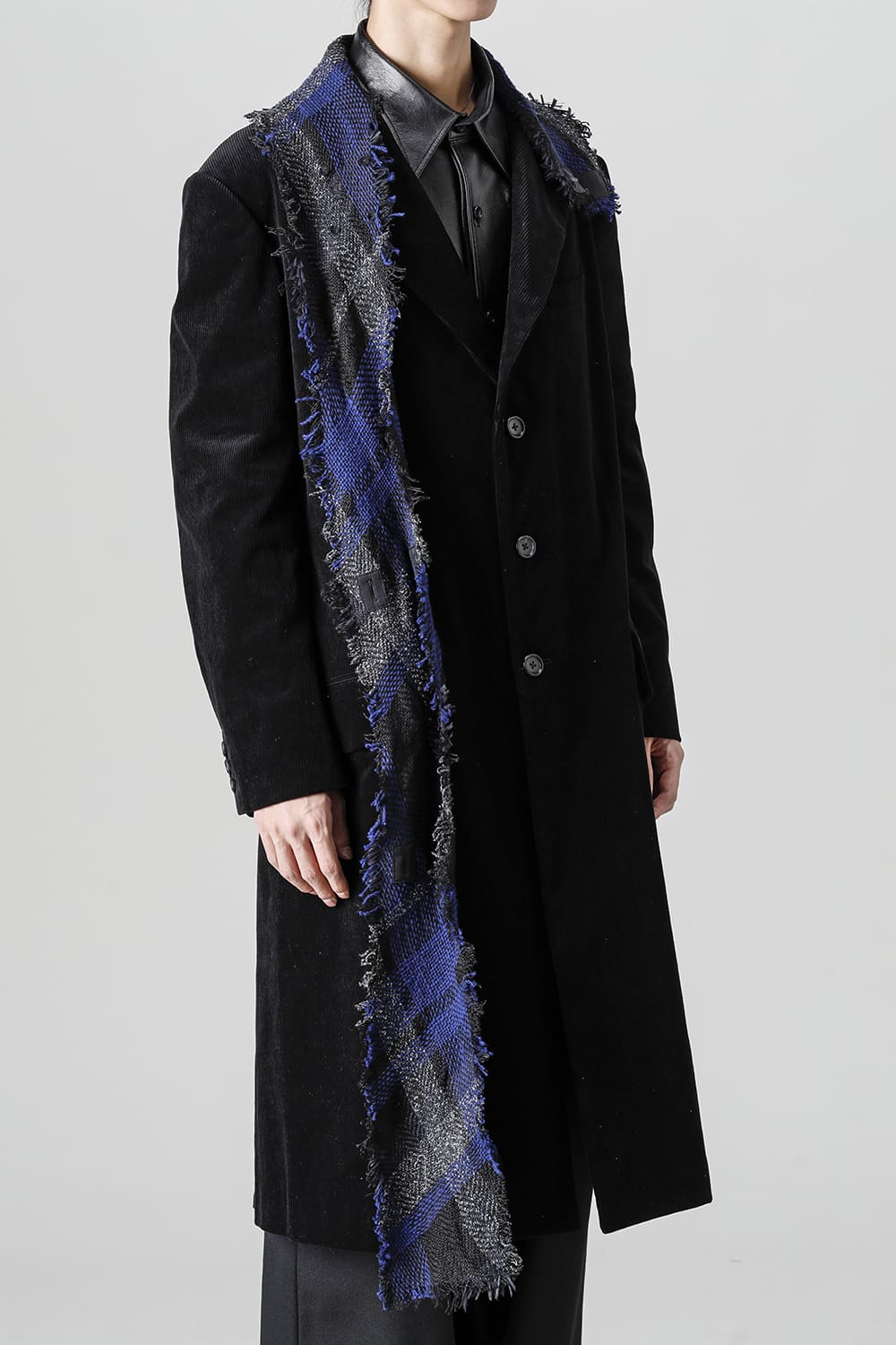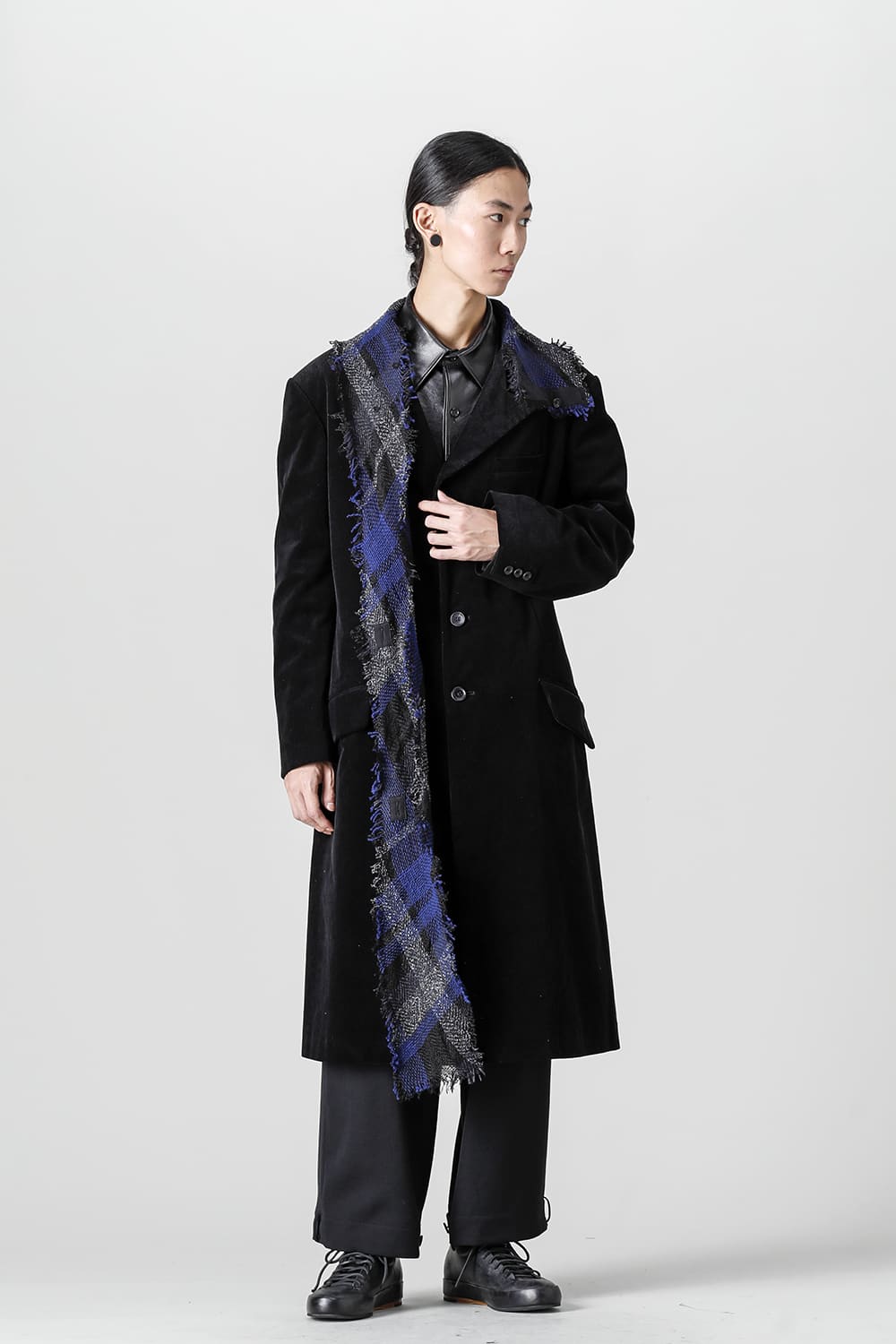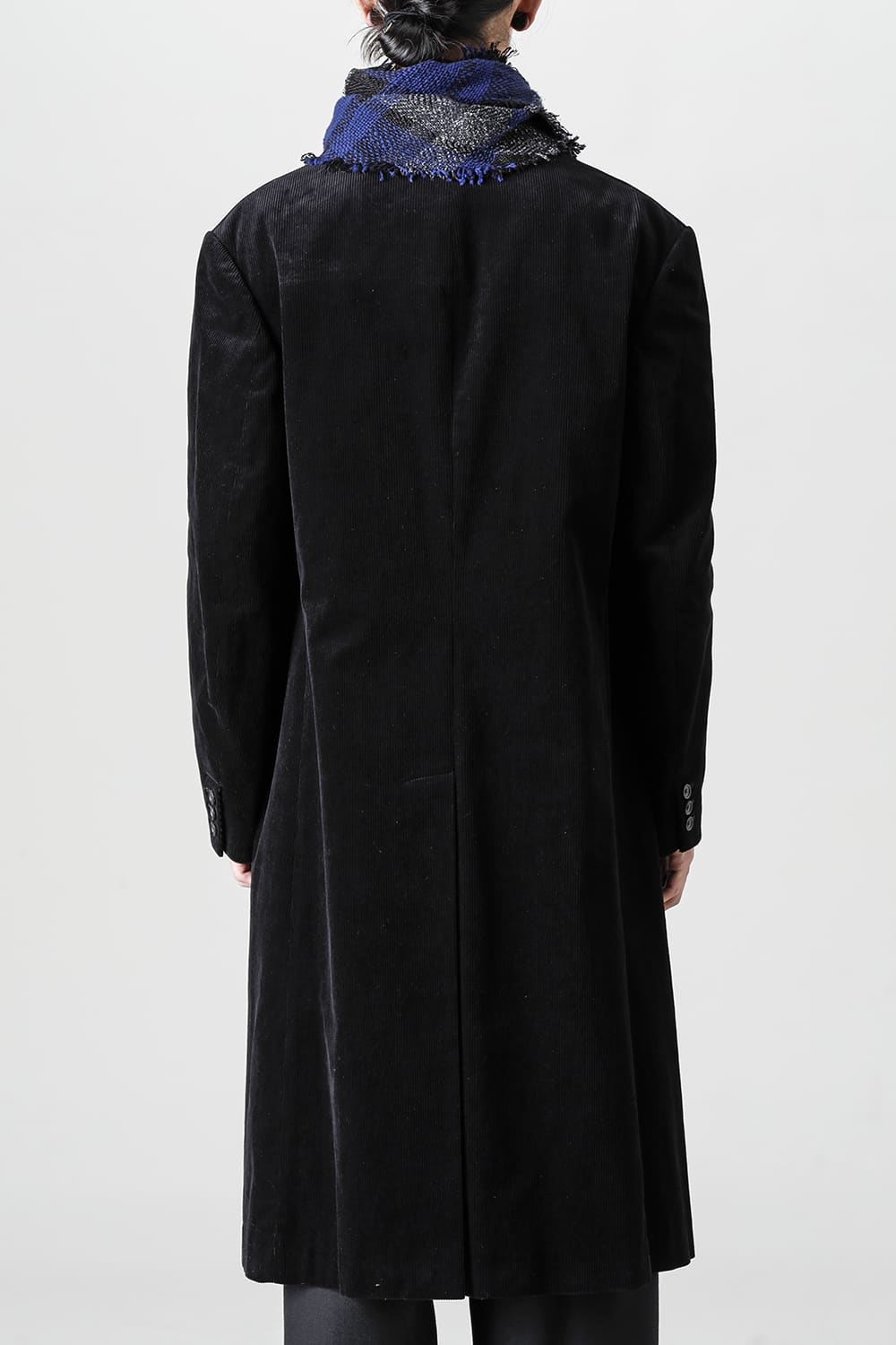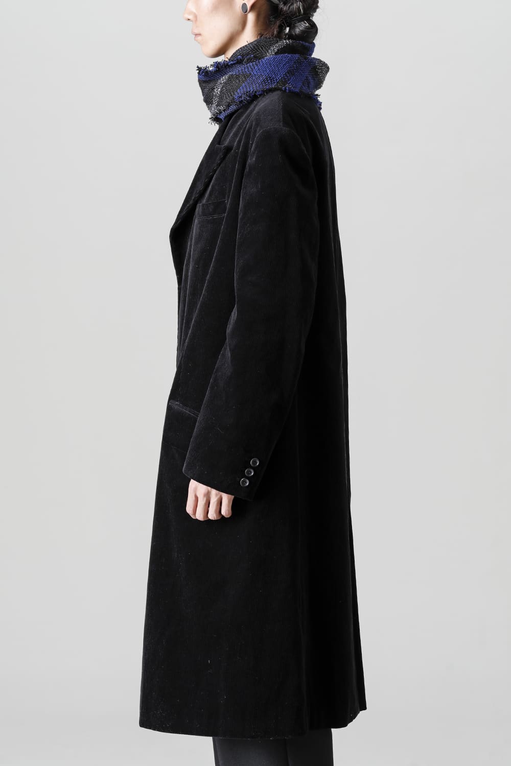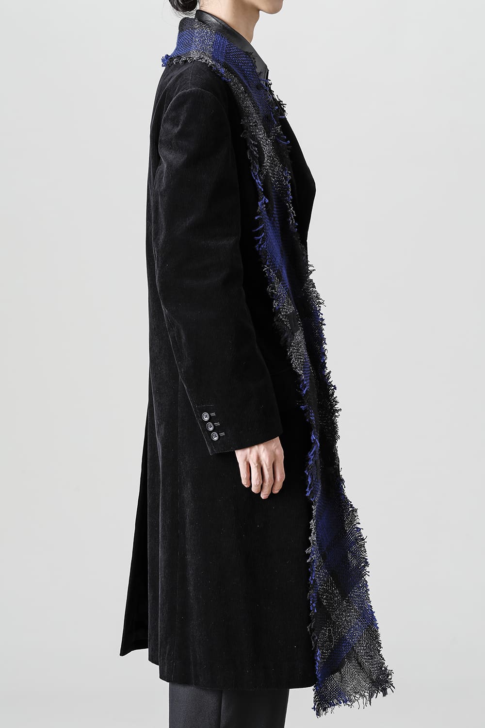 黒のコーデュロイ生地が上品なベーシックなピークドラペルロングジャケットをベースに、鮮やかなブルーが目を引くチェック柄のスカーフを取り付けたデザイン。