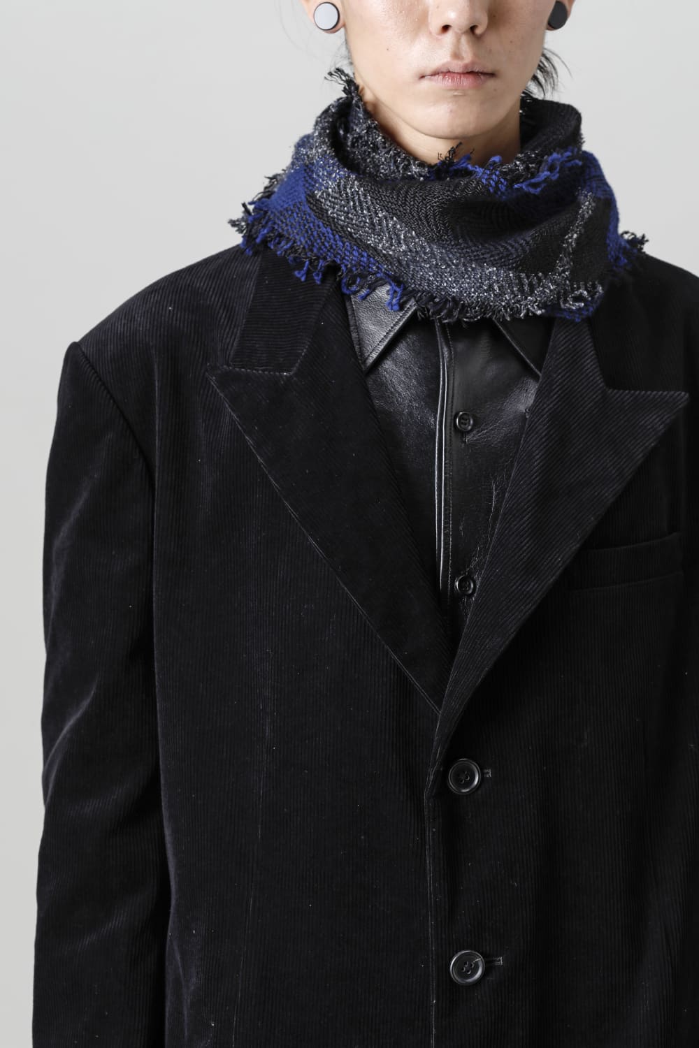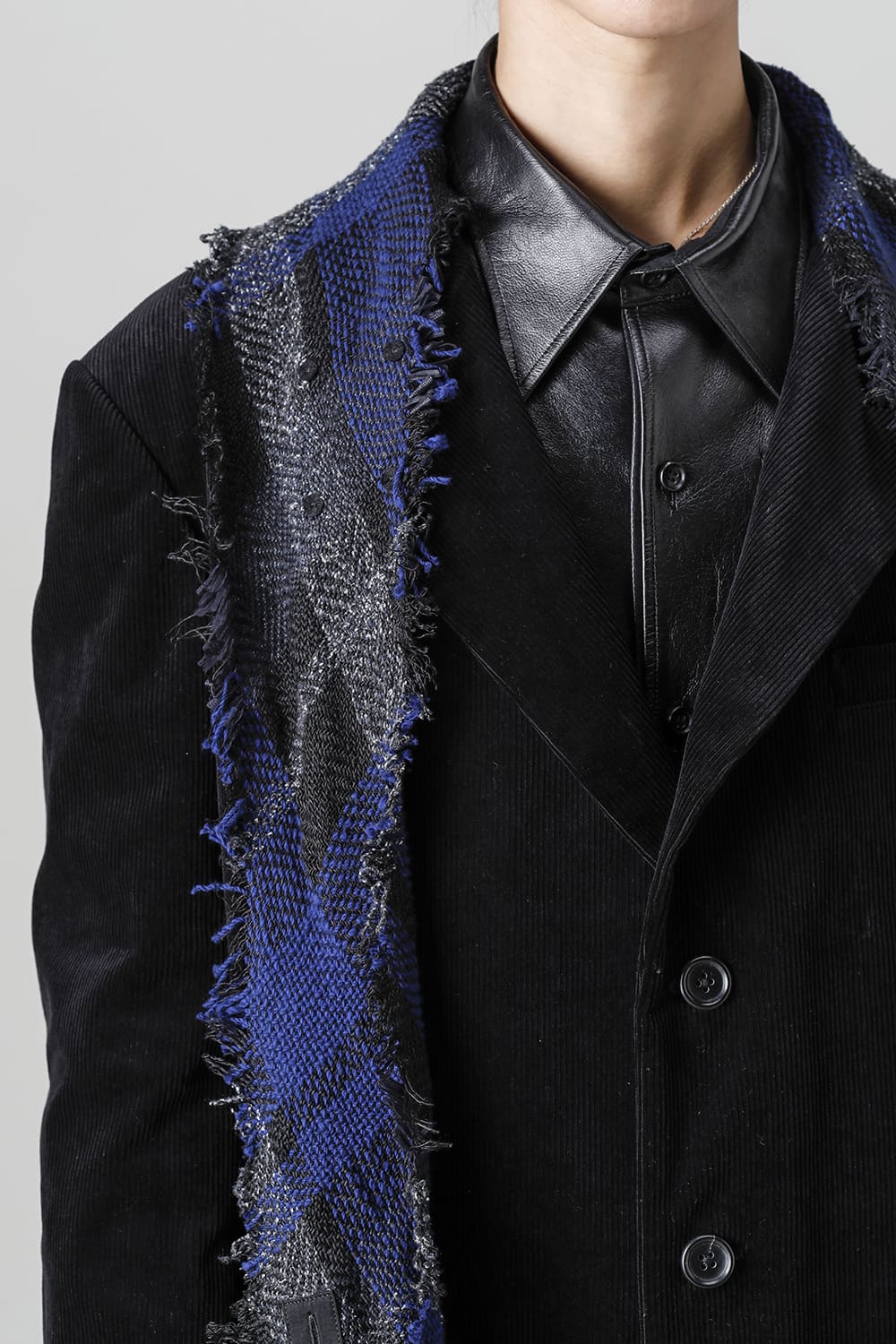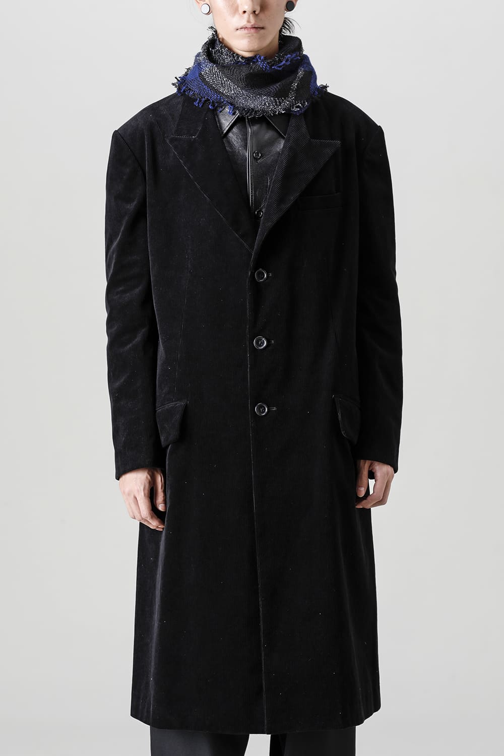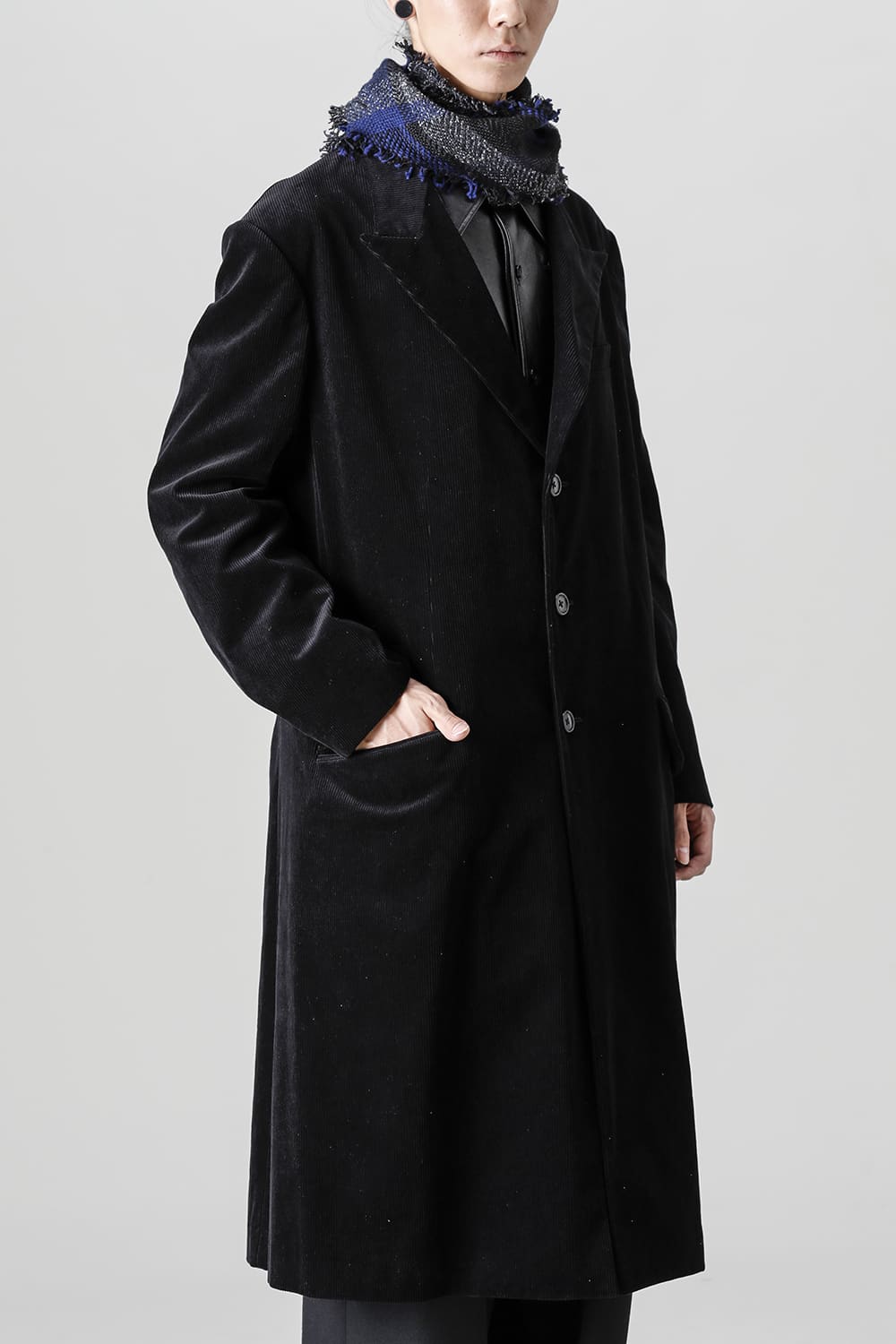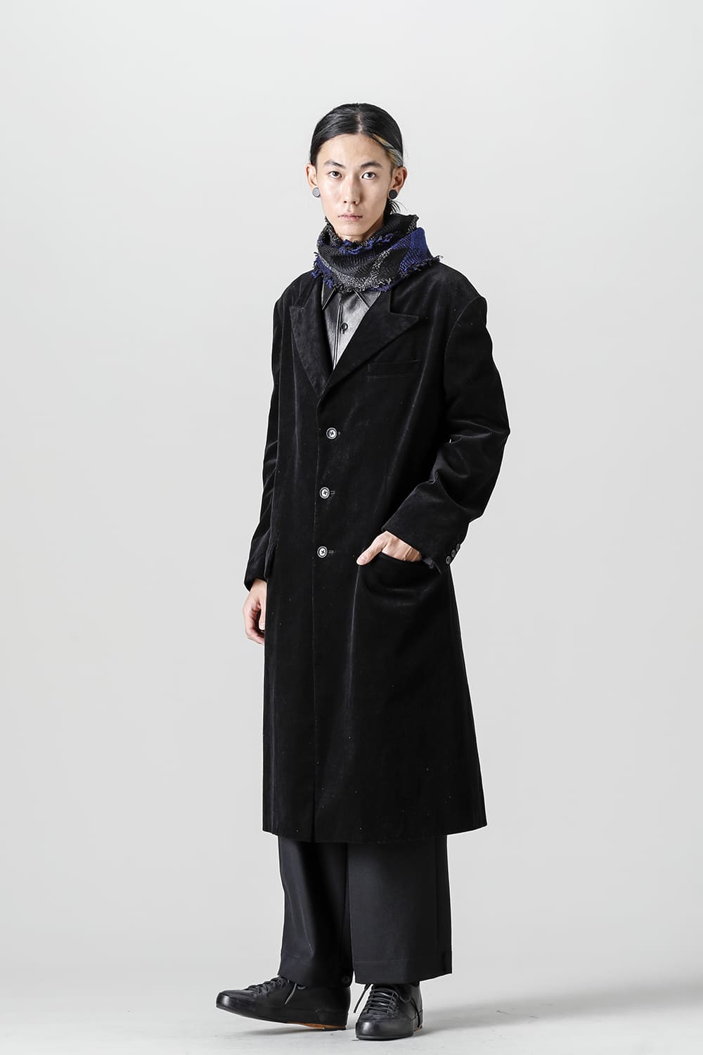 黒のコーデュロイ生地が上品なベーシックなピークドラペルロングジャケットをベースに、鮮やかなブルーが目を引くチェック柄のスカーフを取り付けたデザイン。