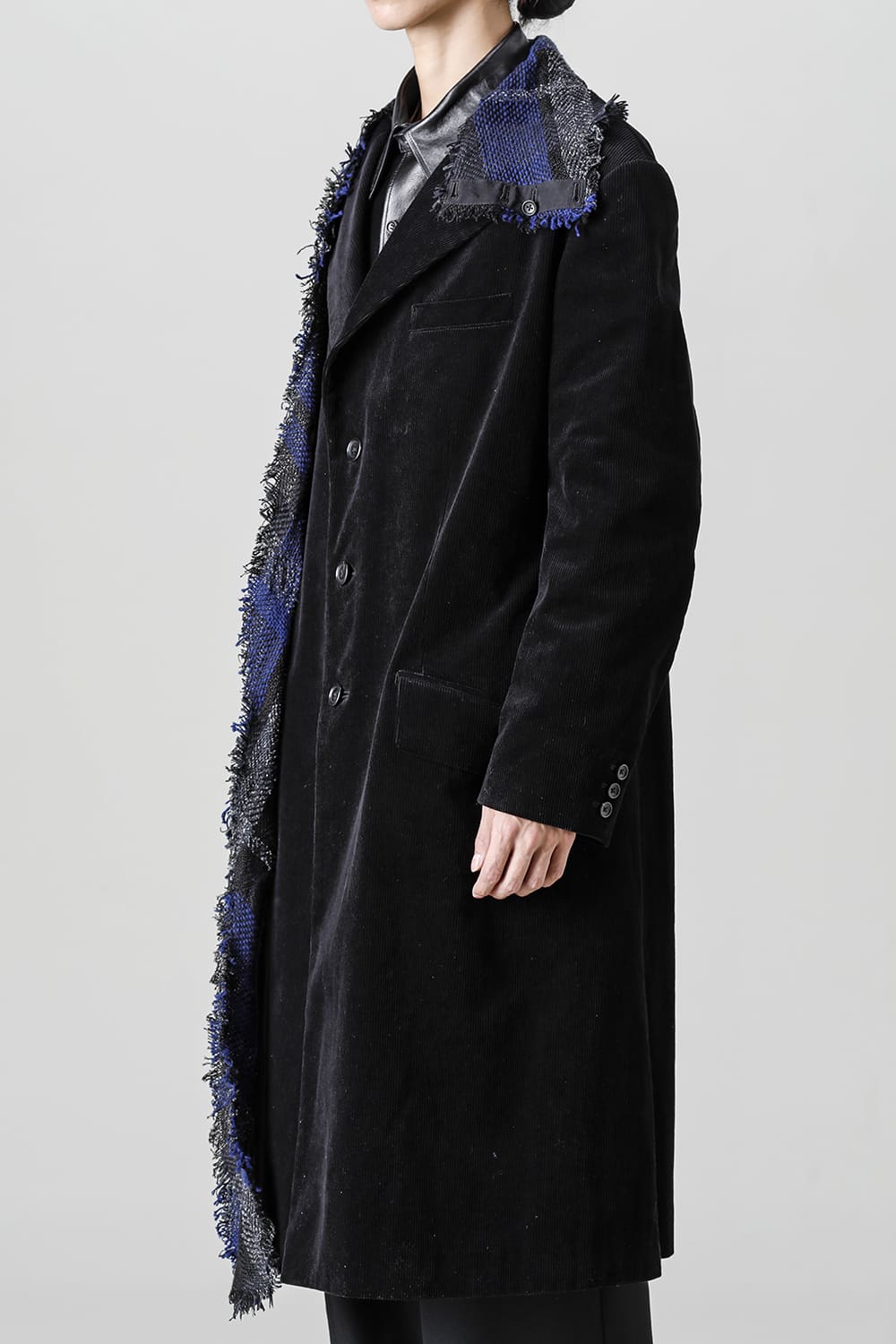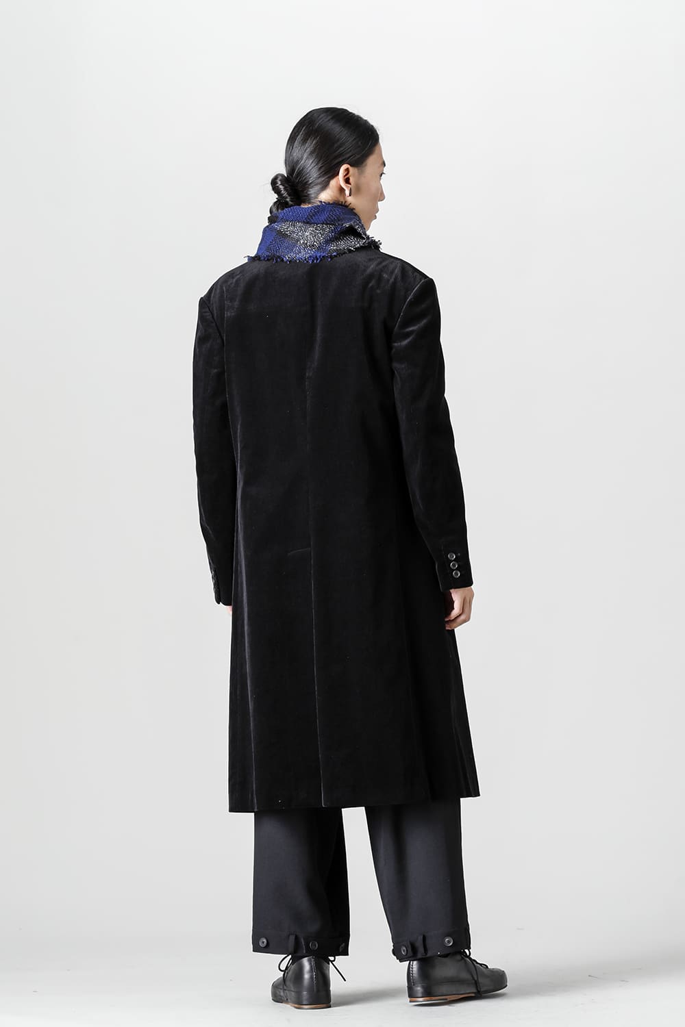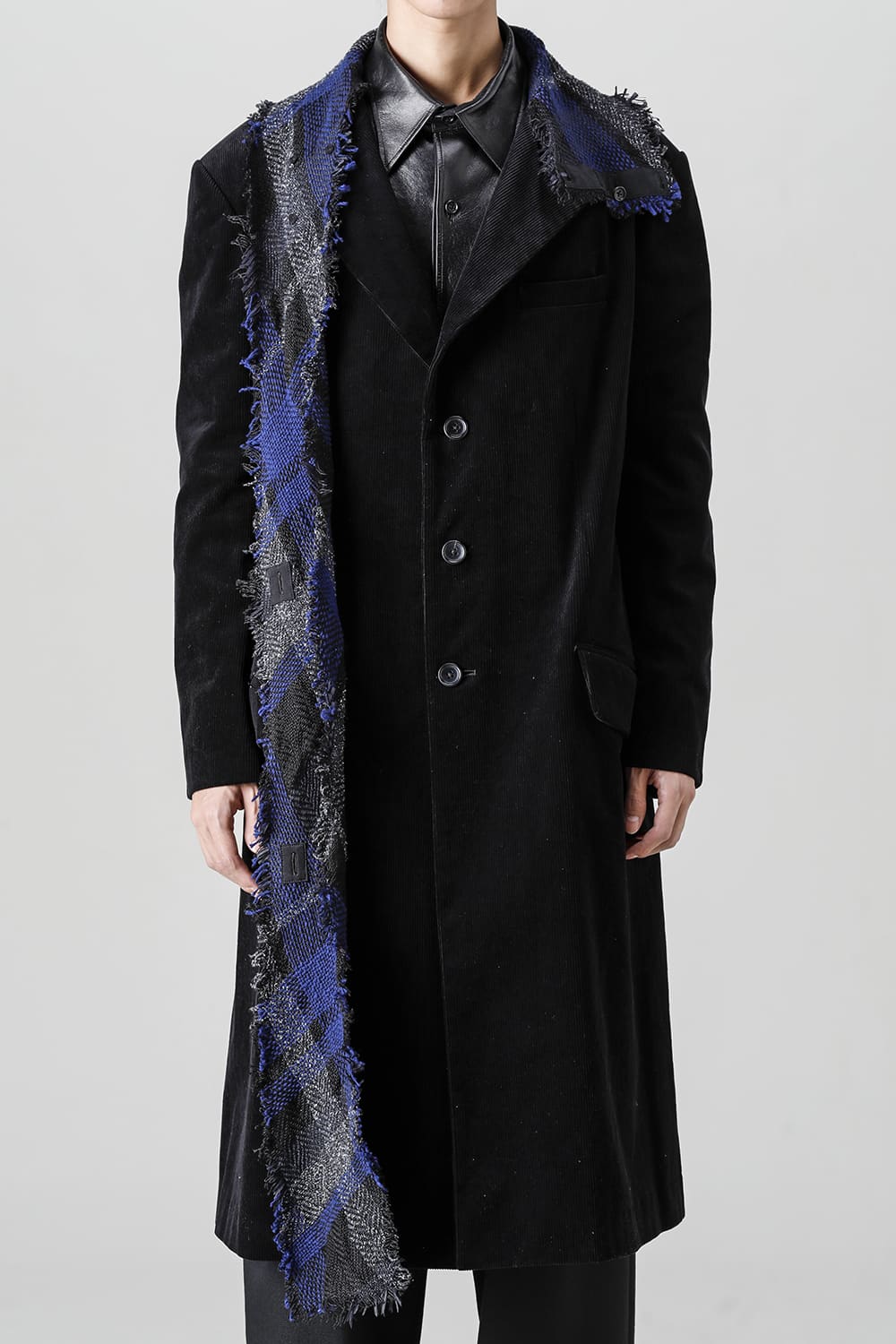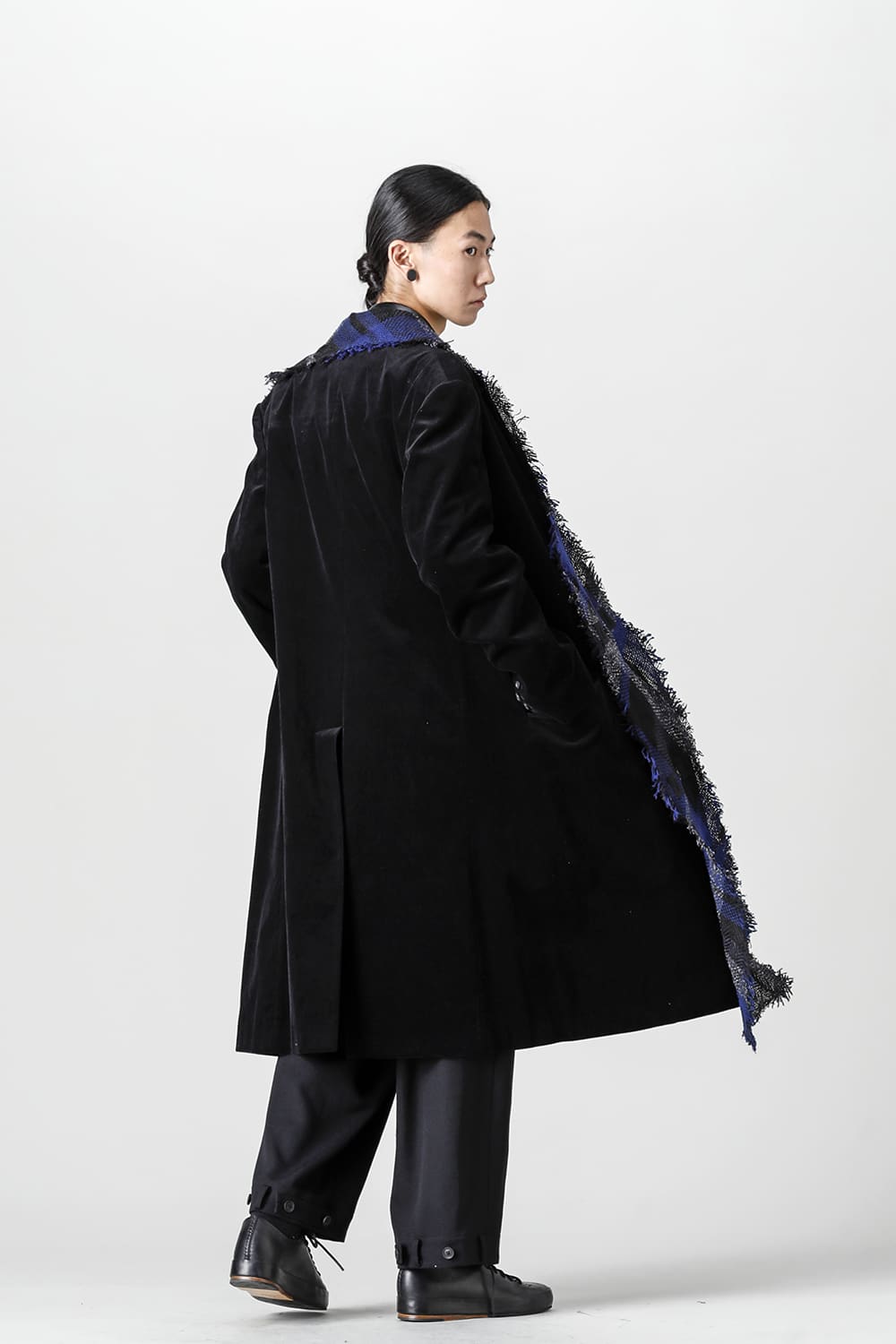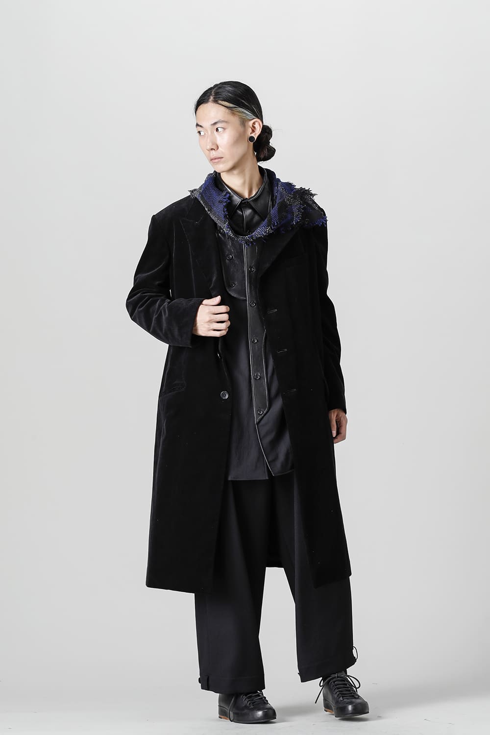 黒のコーデュロイ生地が上品なベーシックなピークドラペルロングジャケットをベースに、鮮やかなブルーが目を引くチェック柄のスカーフを取り付けたデザイン。