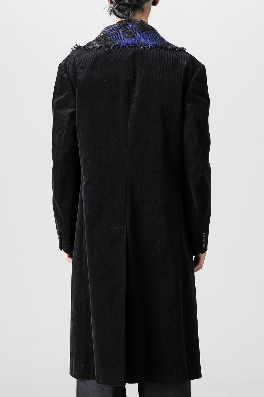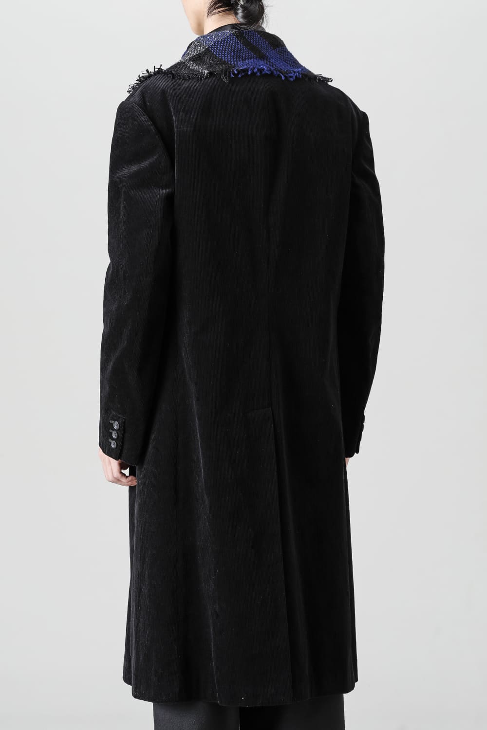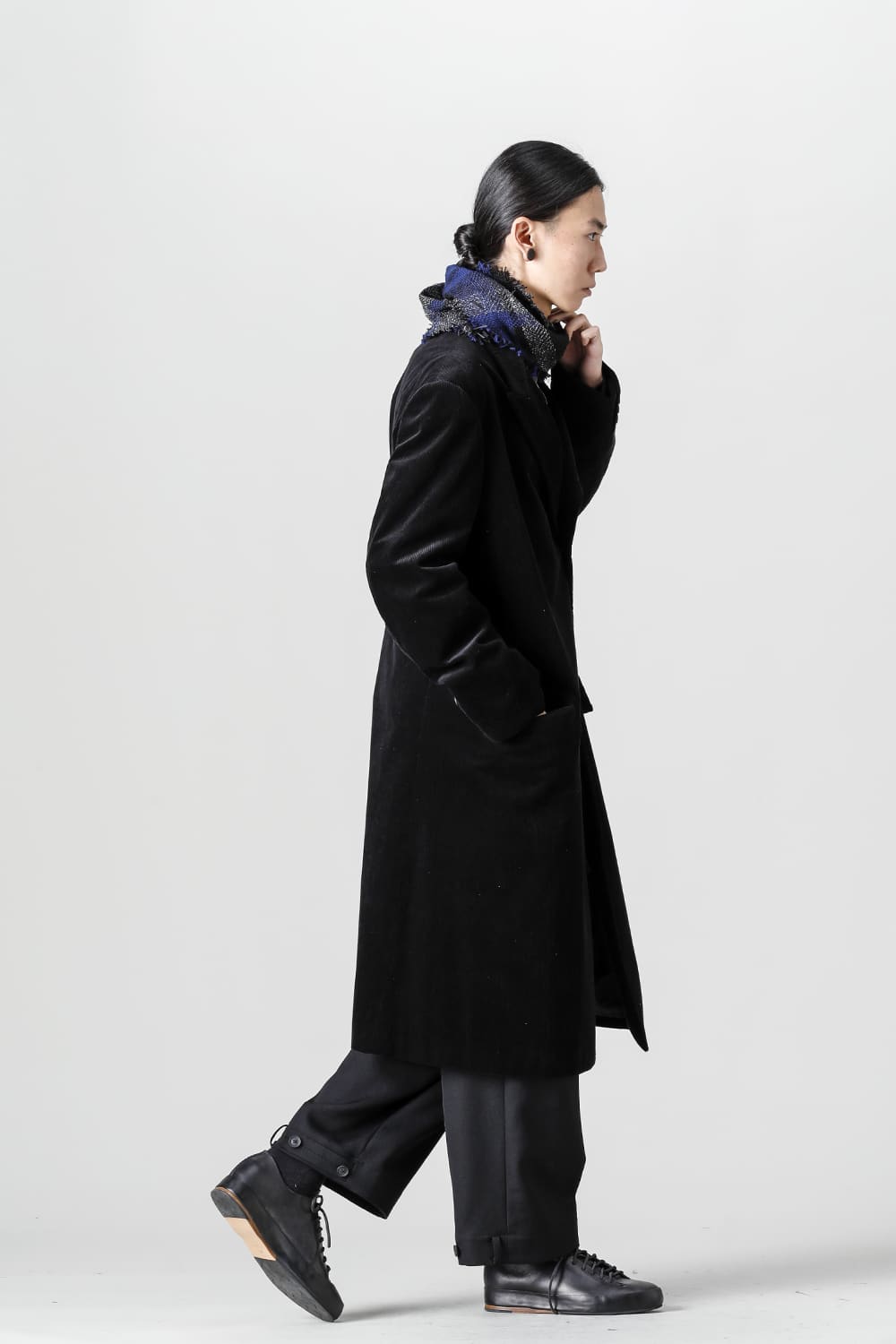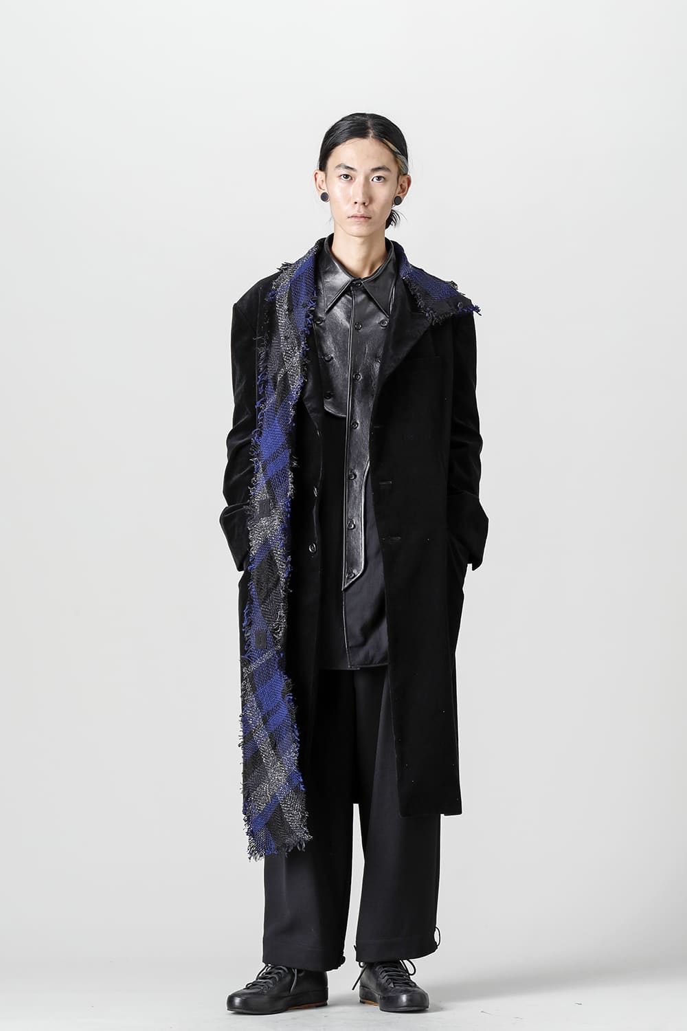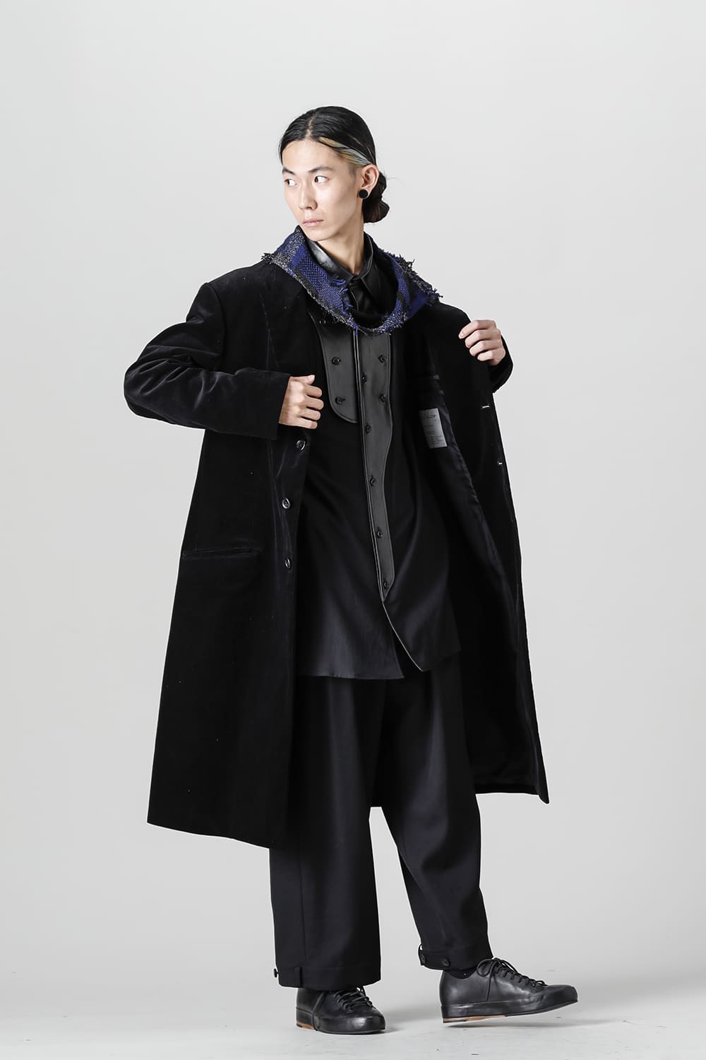 黒のコーデュロイ生地が上品なベーシックなピークドラペルロングジャケットをベースに、鮮やかなブルーが目を引くチェック柄のスカーフを取り付けたデザイン。