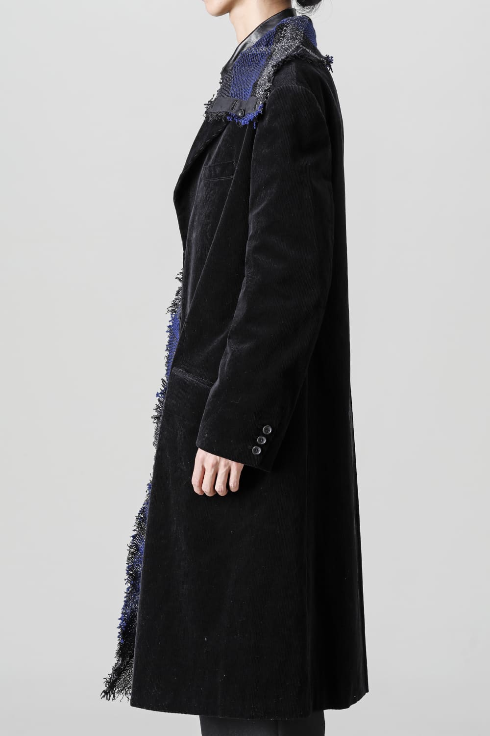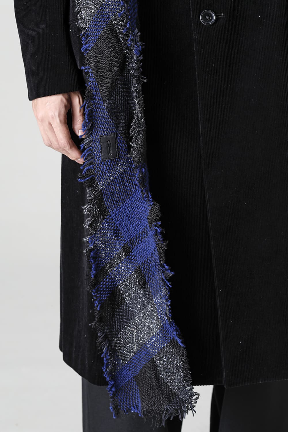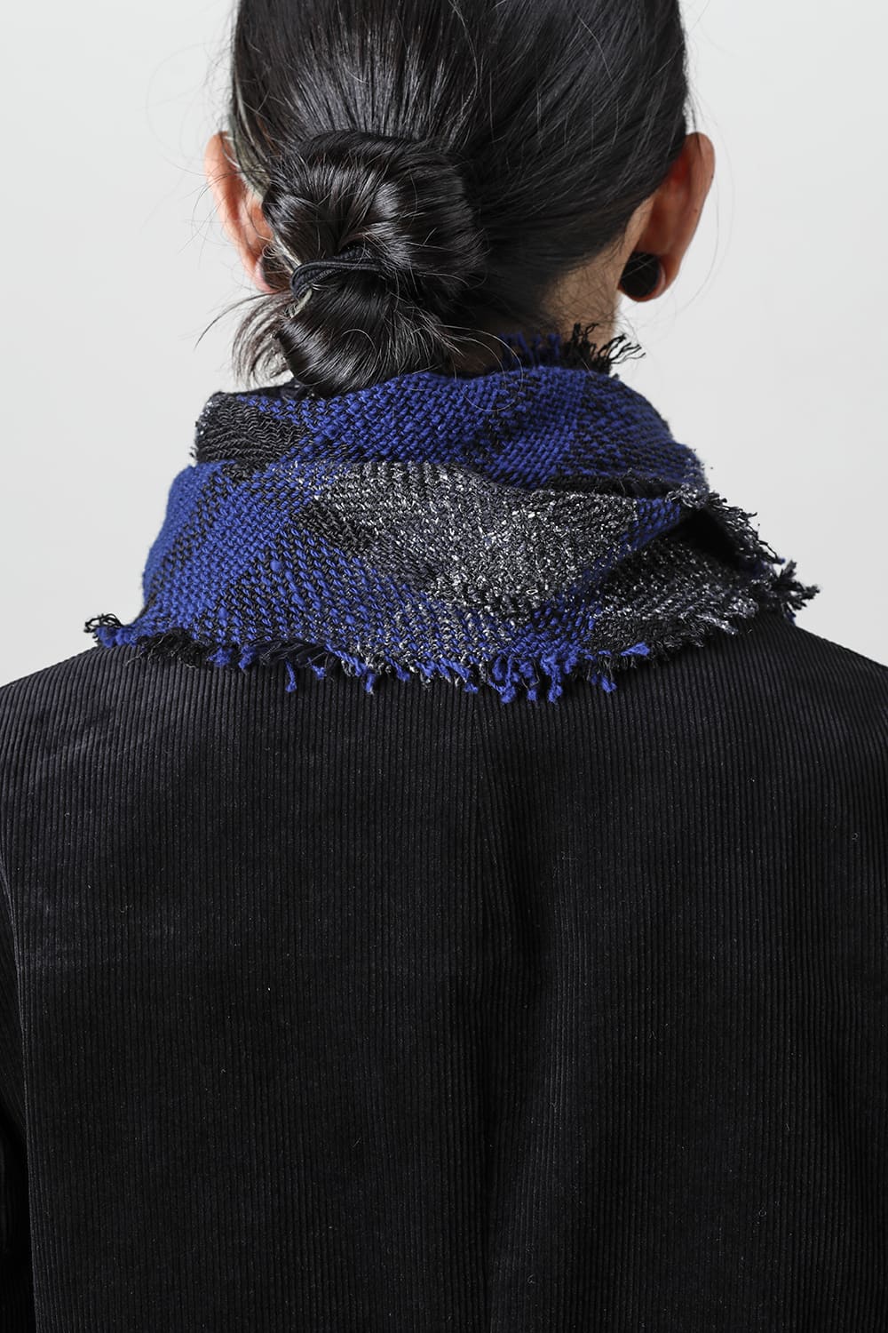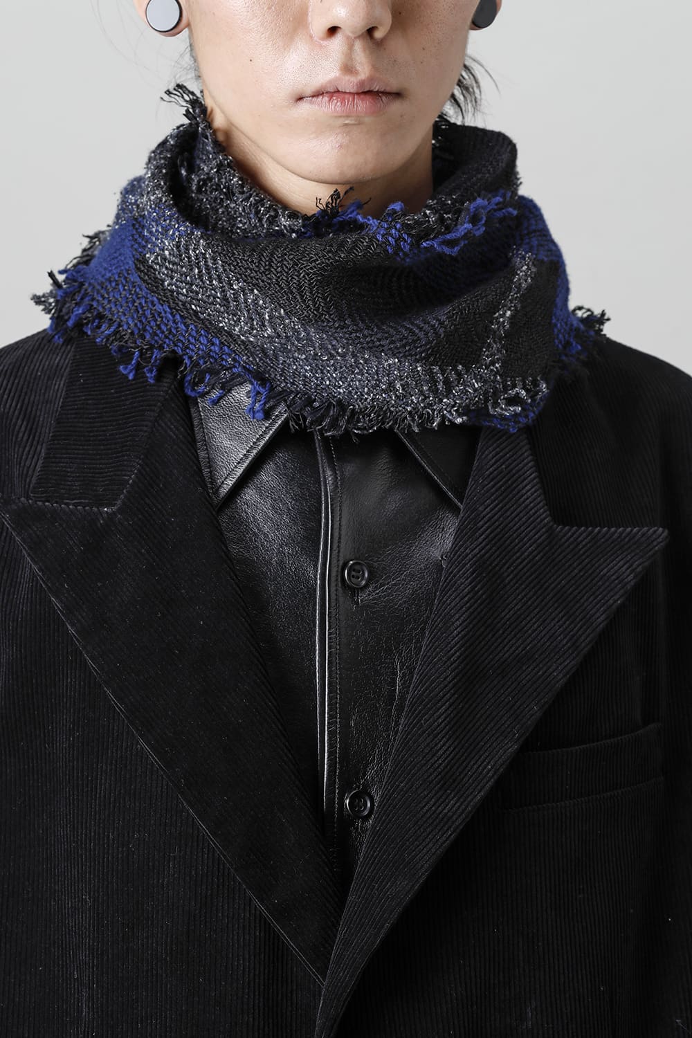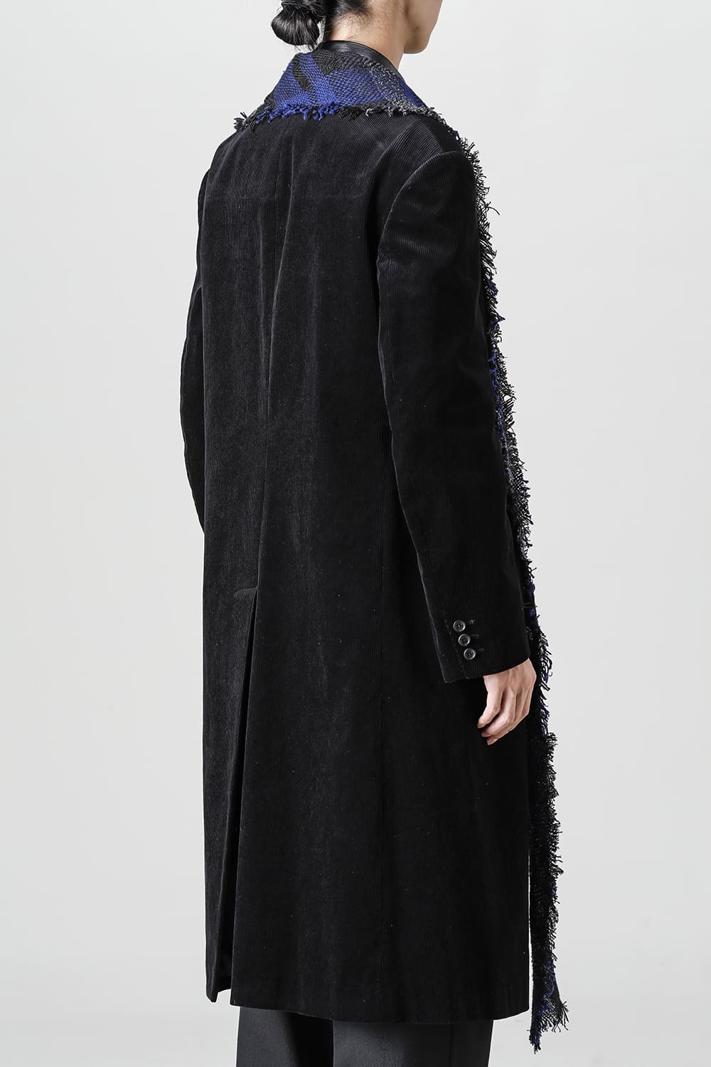 黒のコーデュロイ生地が上品なベーシックなピークドラペルロングジャケットをベースに、鮮やかなブルーが目を引くチェック柄のスカーフを取り付けたデザイン。