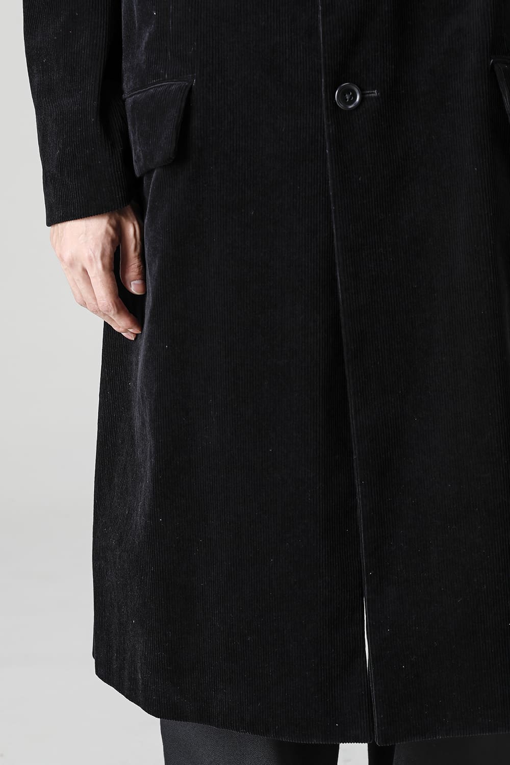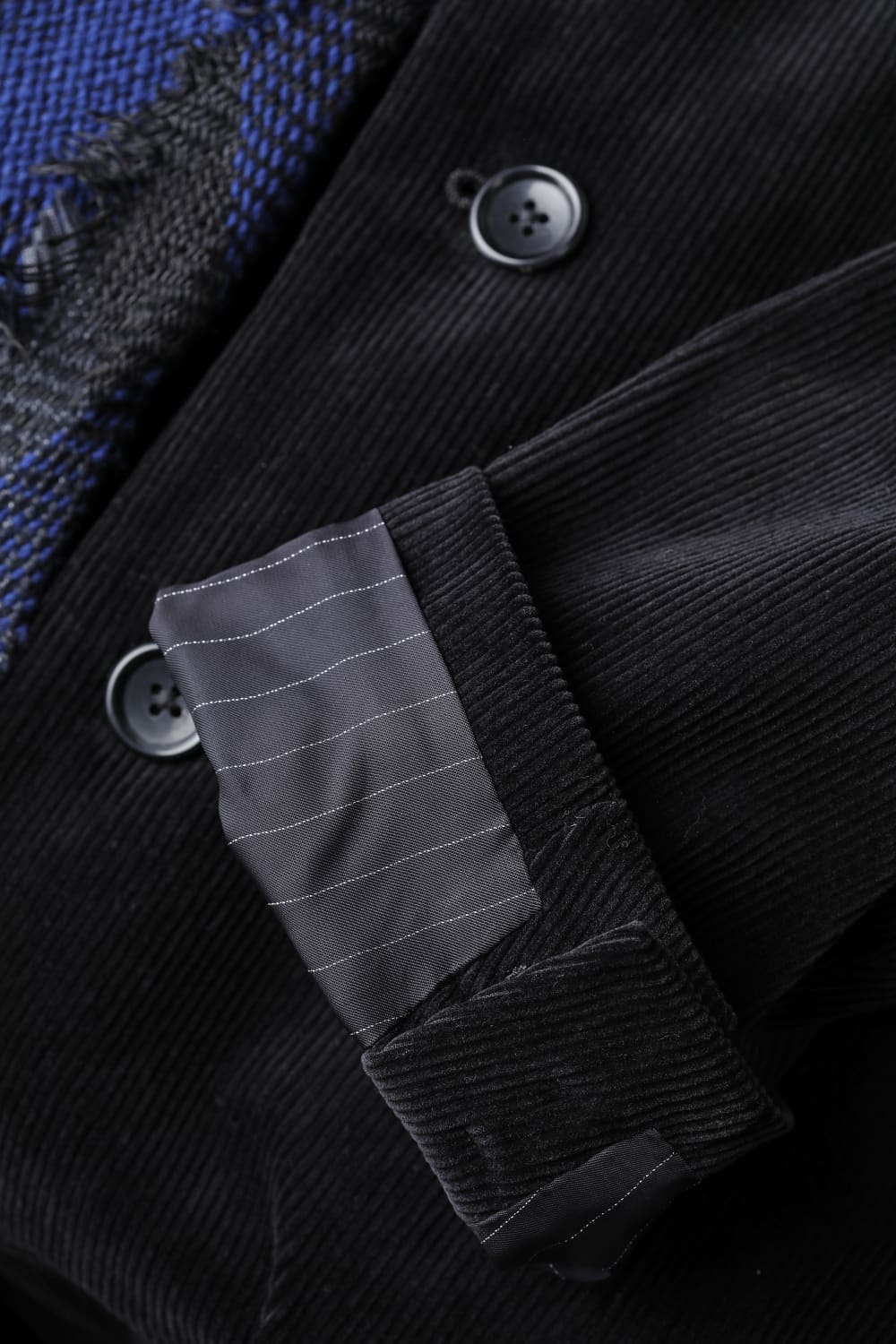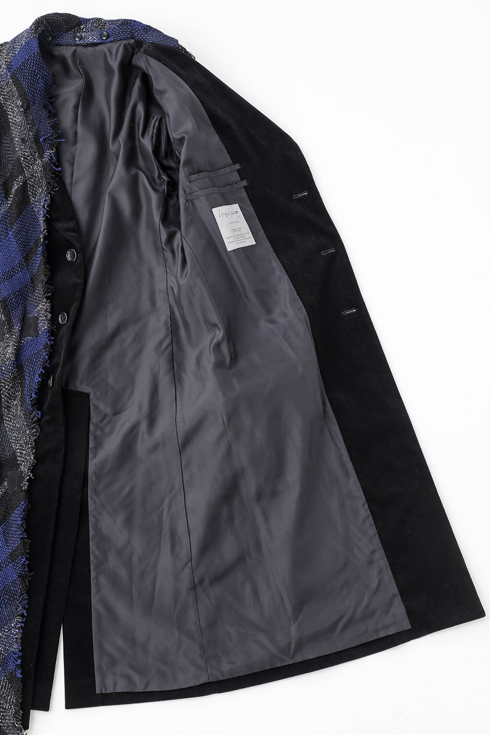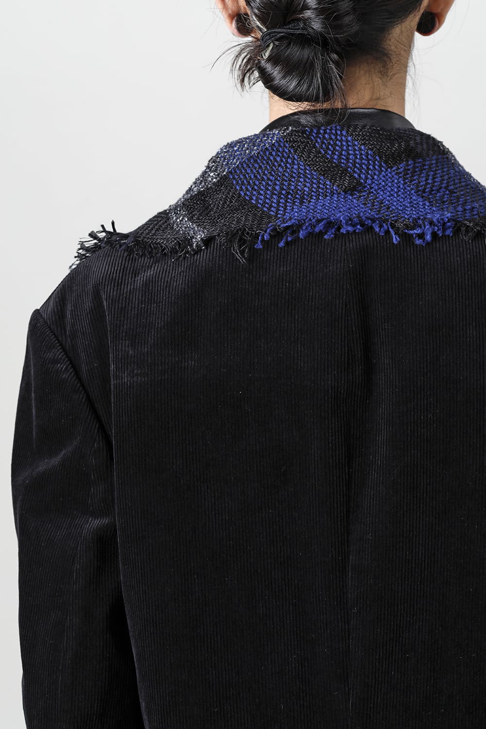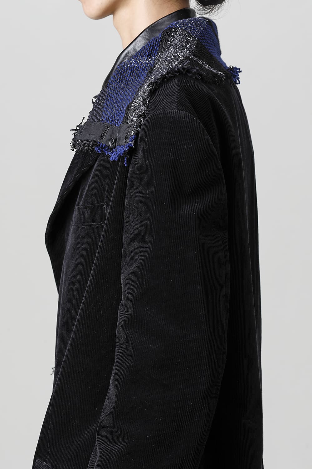 黒のコーデュロイ生地が上品なベーシックなピークドラペルロングジャケットをベースに、鮮やかなブルーが目を引くチェック柄のスカーフを取り付けたデザイン。