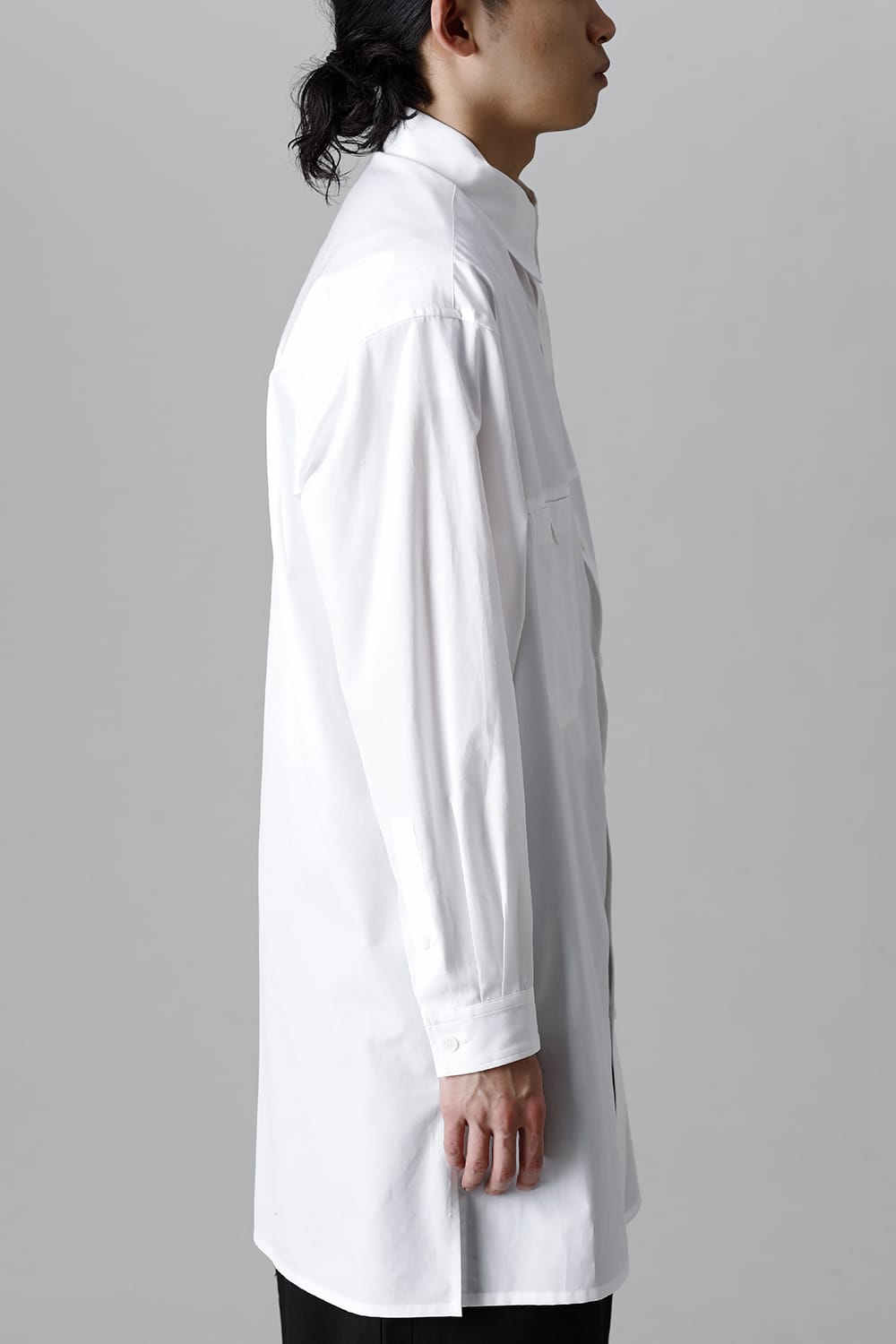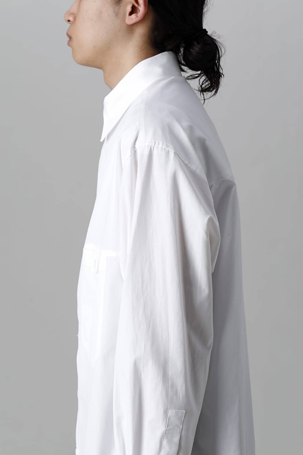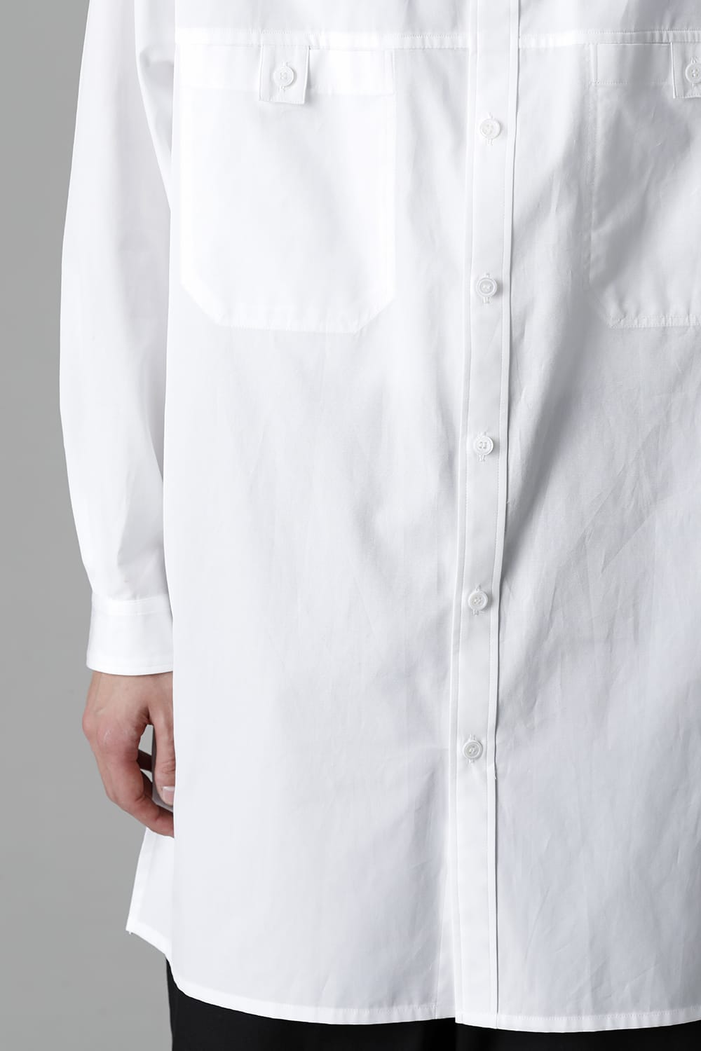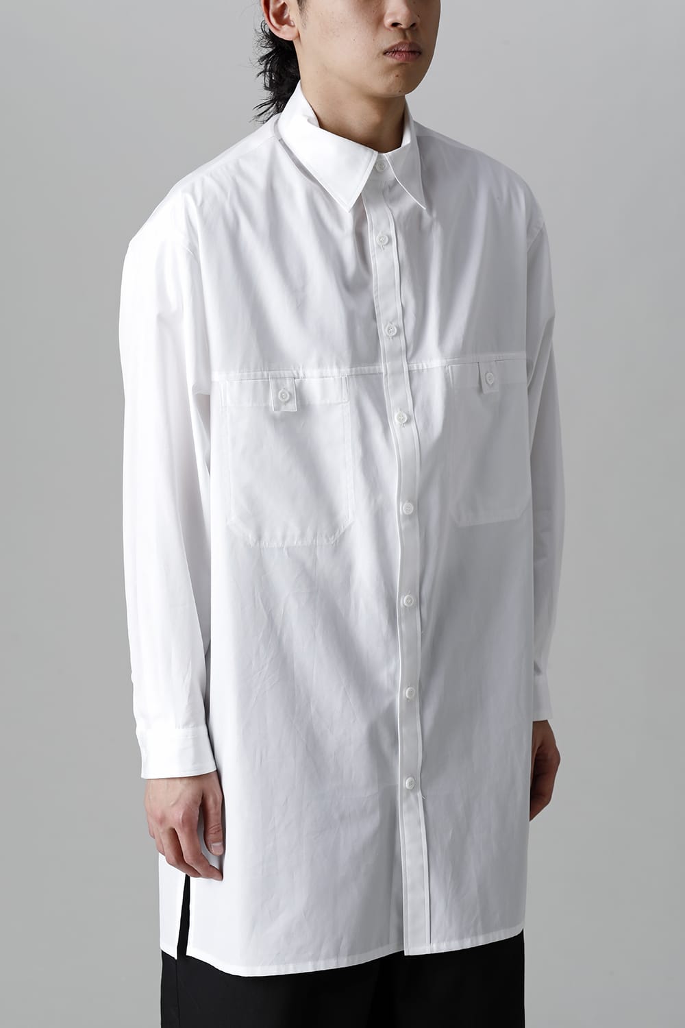 フロントの切り替えデザインとポケットがアクセントとなったコットンブロードのミドルレングスシャツ。ハリのあるコットン素材が同ブランドの定番素材であるウールギャバとの相性が良い定番トップスです。インナーからトップスまで通年で扱えるアイテムですので、まず一着同ブランドの定番インナーを手に入れたいという方にご覧いただきたい一着です。