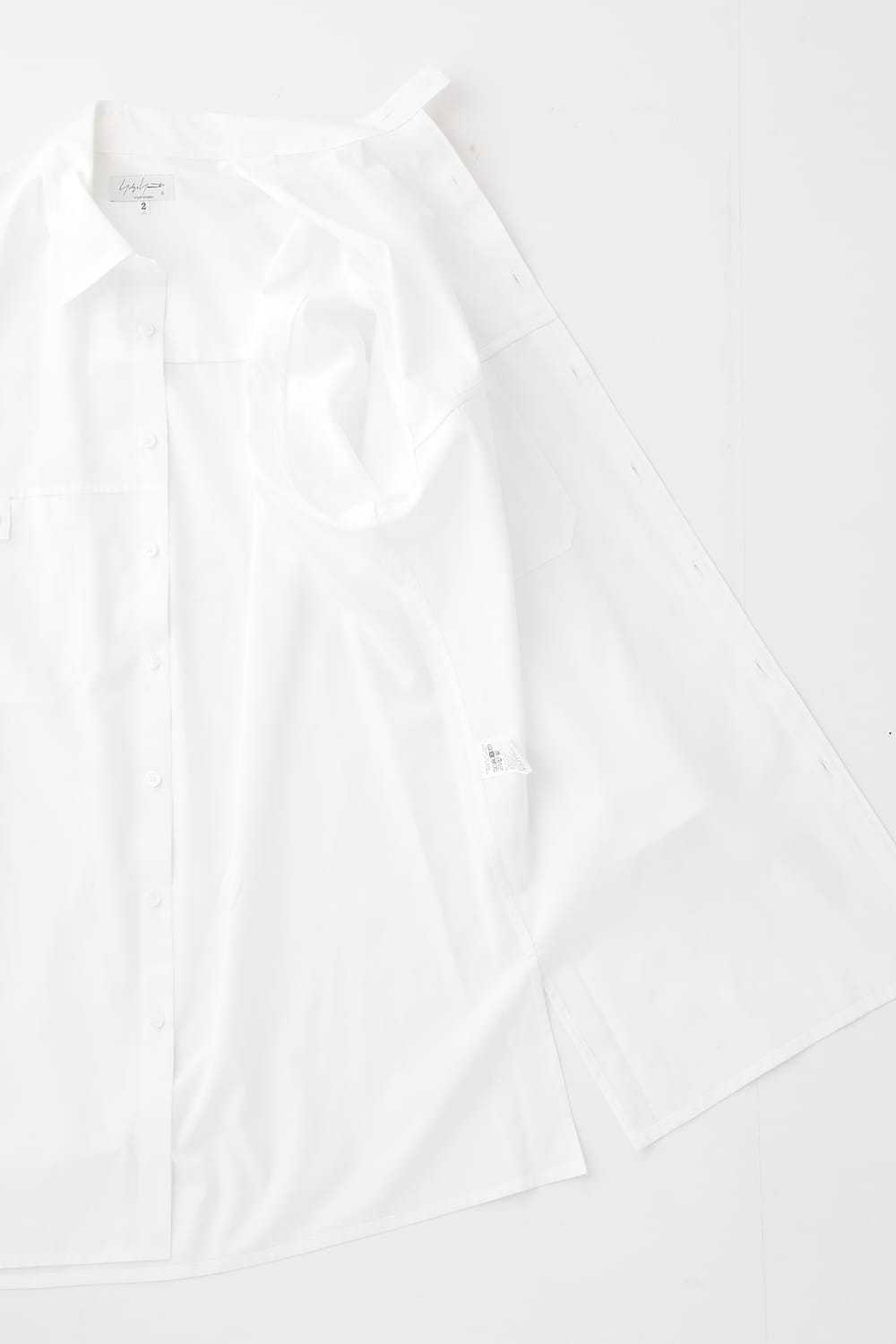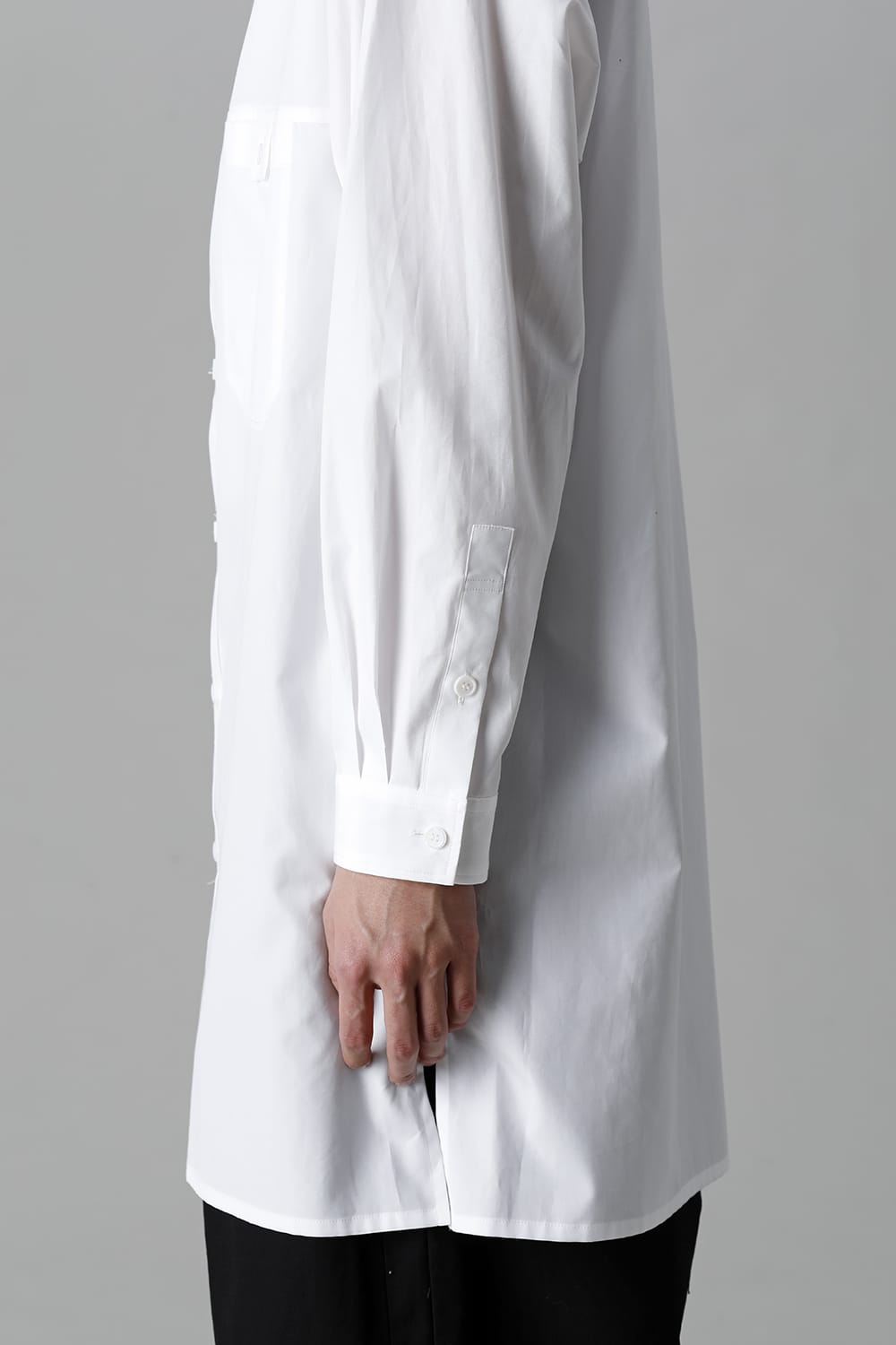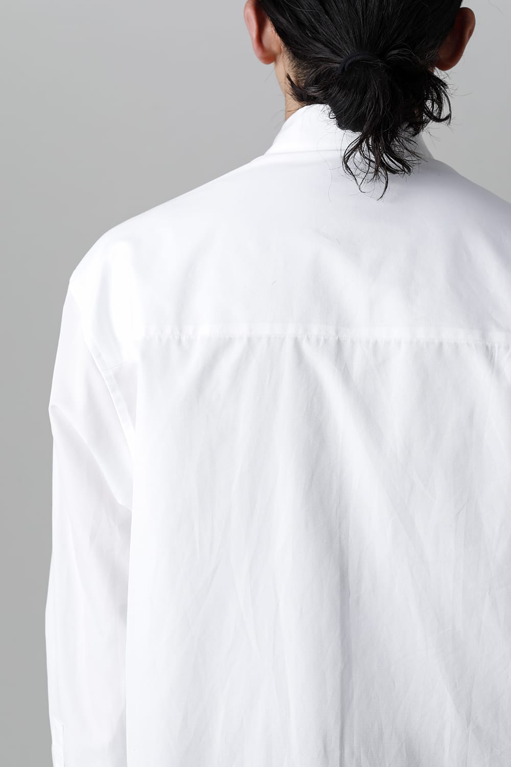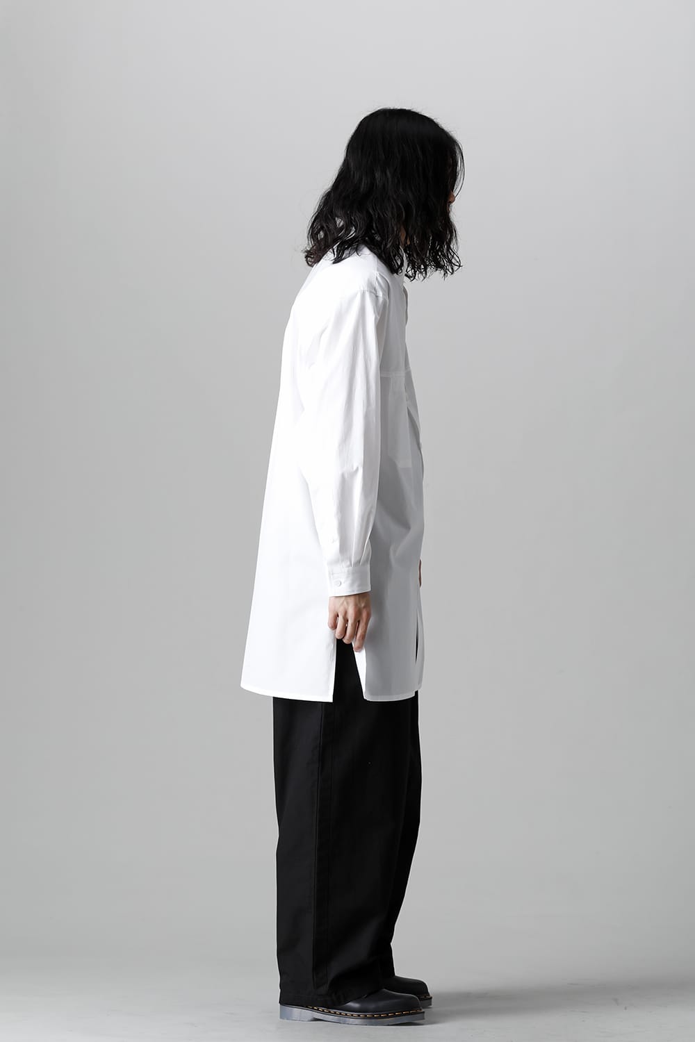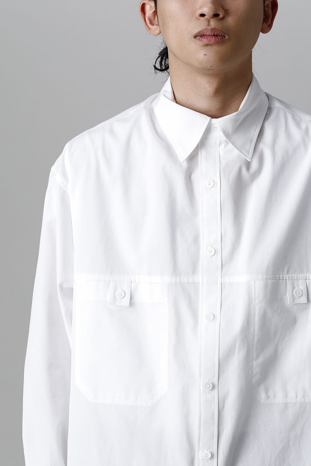 フロントの切り替えデザインとポケットがアクセントとなったコットンブロードのミドルレングスシャツ。ハリのあるコットン素材が同ブランドの定番素材であるウールギャバとの相性が良い定番トップスです。インナーからトップスまで通年で扱えるアイテムですので、まず一着同ブランドの定番インナーを手に入れたいという方にご覧いただきたい一着です。