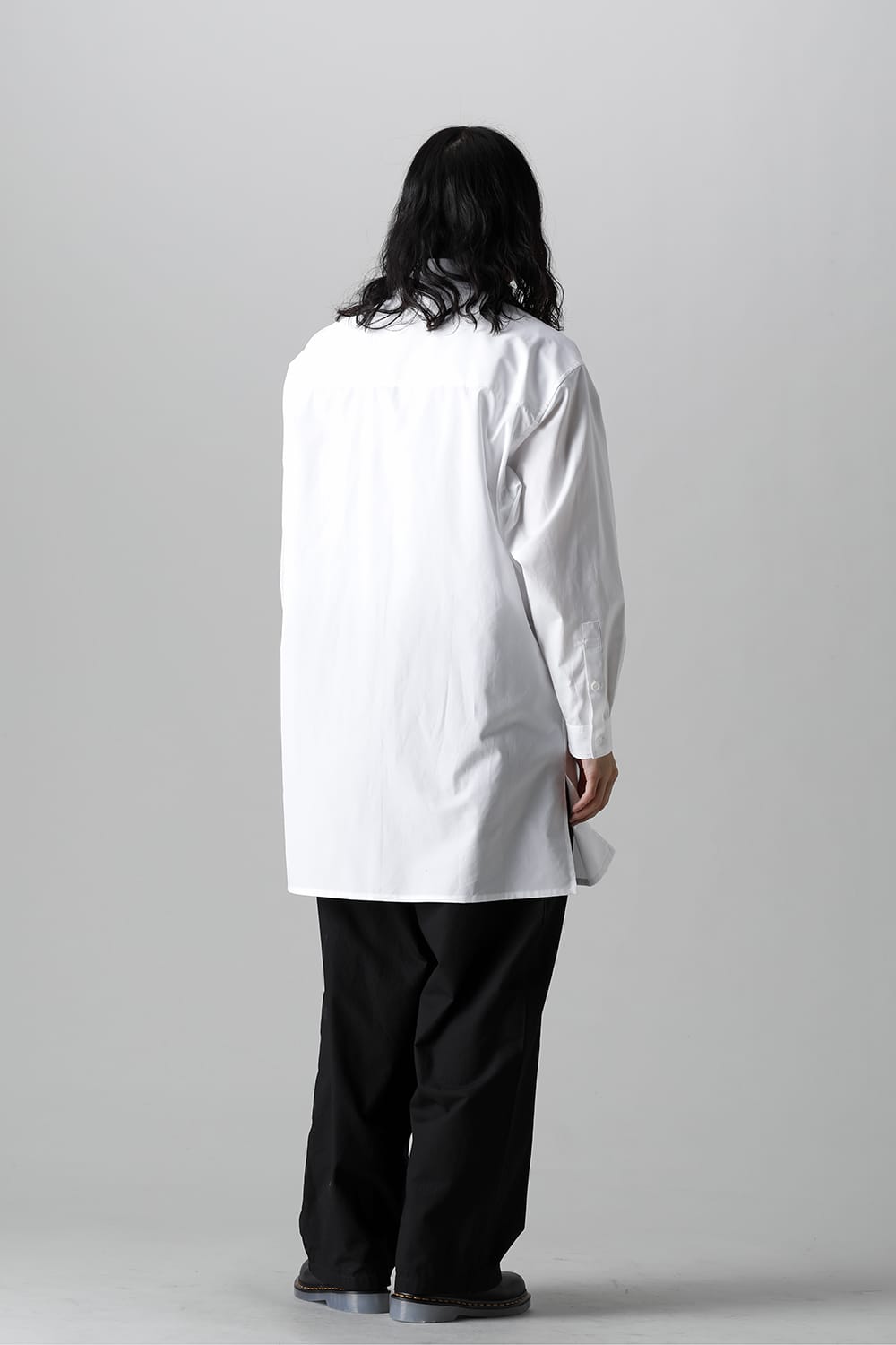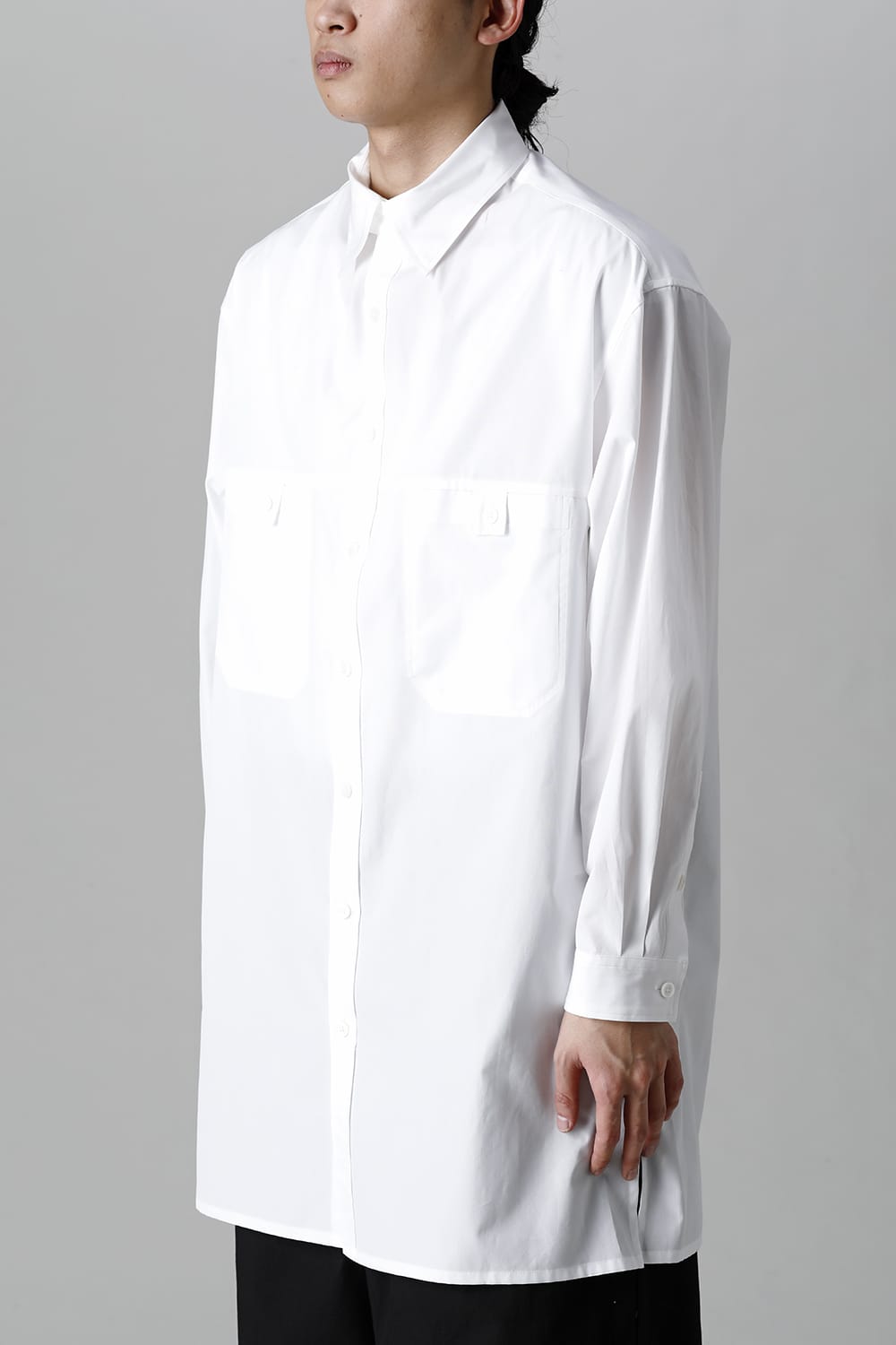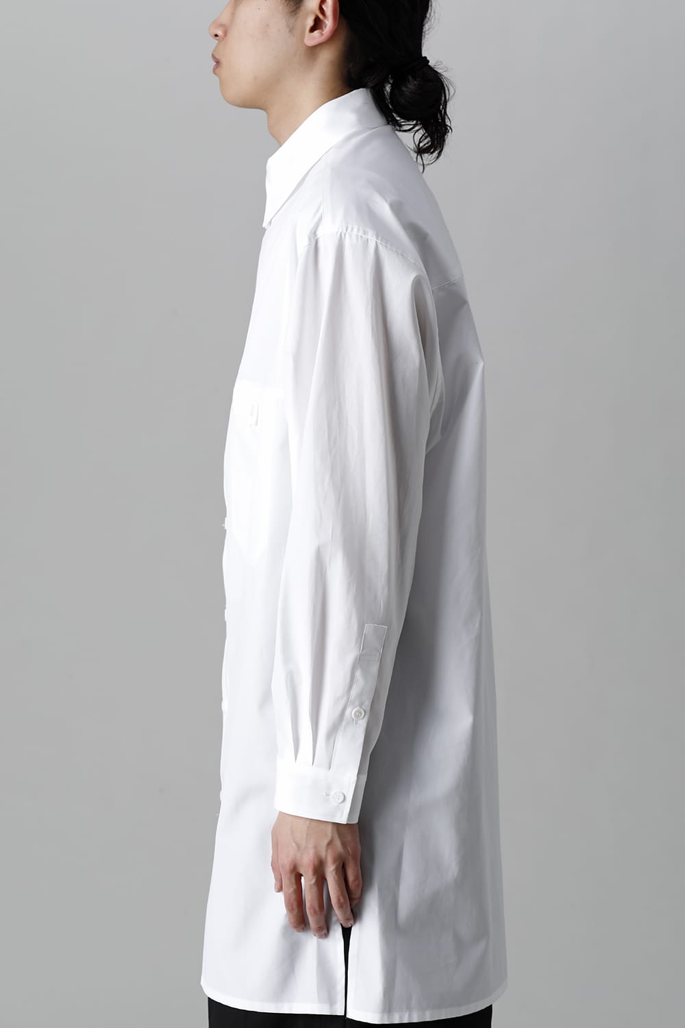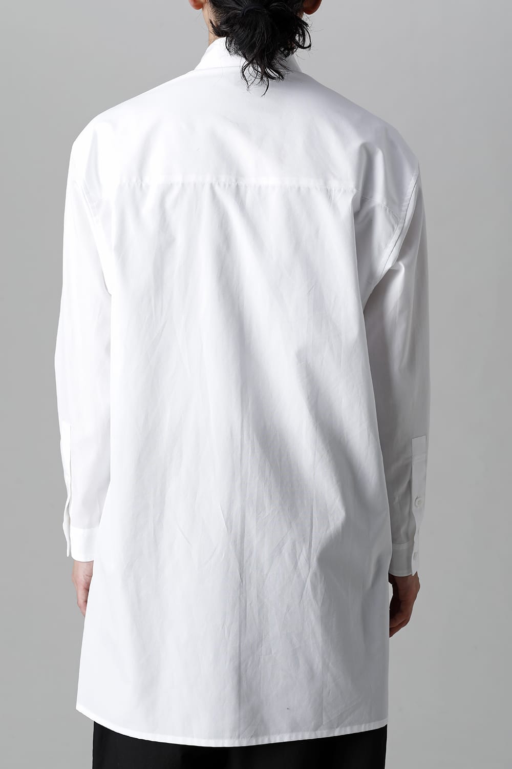 フロントの切り替えデザインとポケットがアクセントとなったコットンブロードのミドルレングスシャツ。ハリのあるコットン素材が同ブランドの定番素材であるウールギャバとの相性が良い定番トップスです。インナーからトップスまで通年で扱えるアイテムですので、まず一着同ブランドの定番インナーを手に入れたいという方にご覧いただきたい一着です。