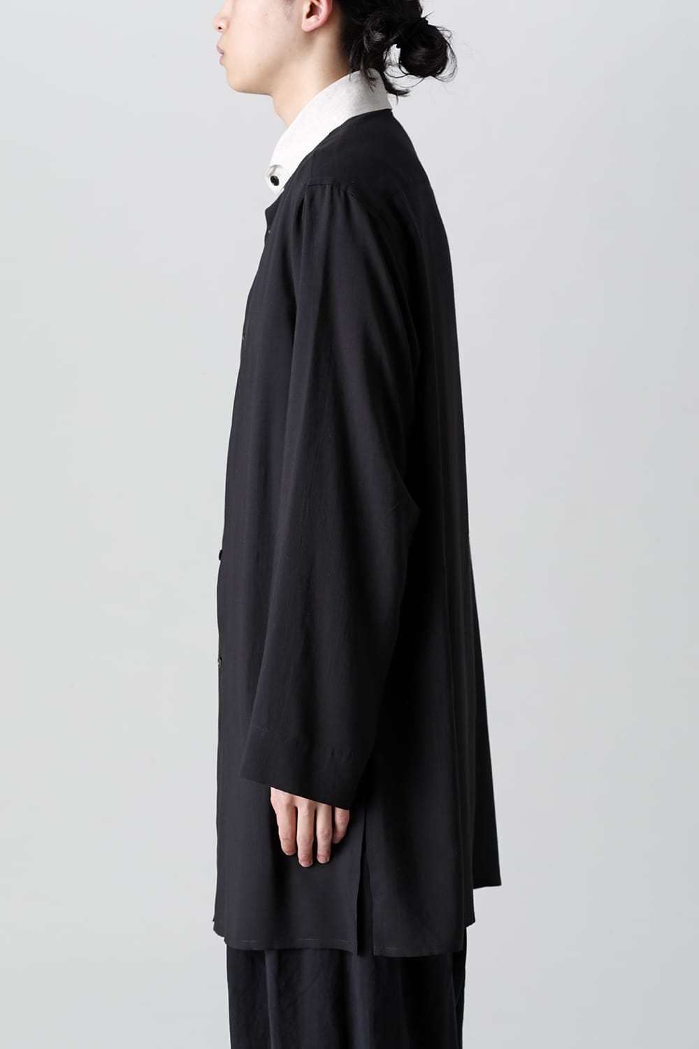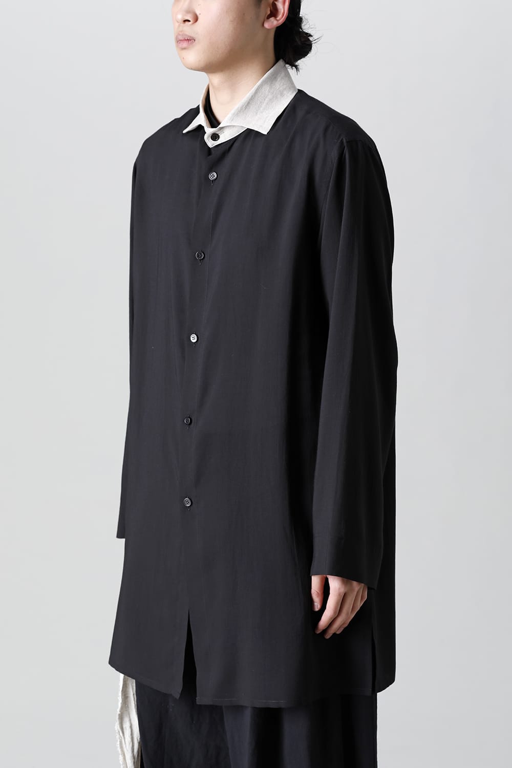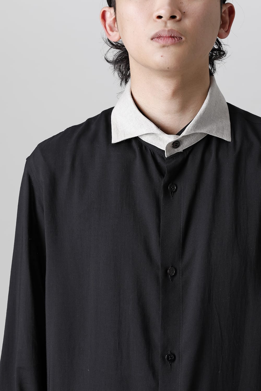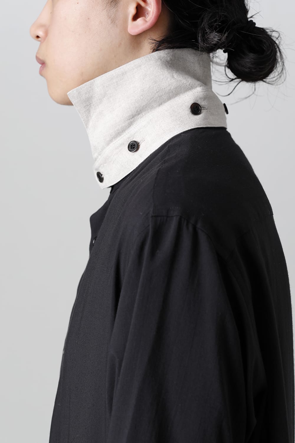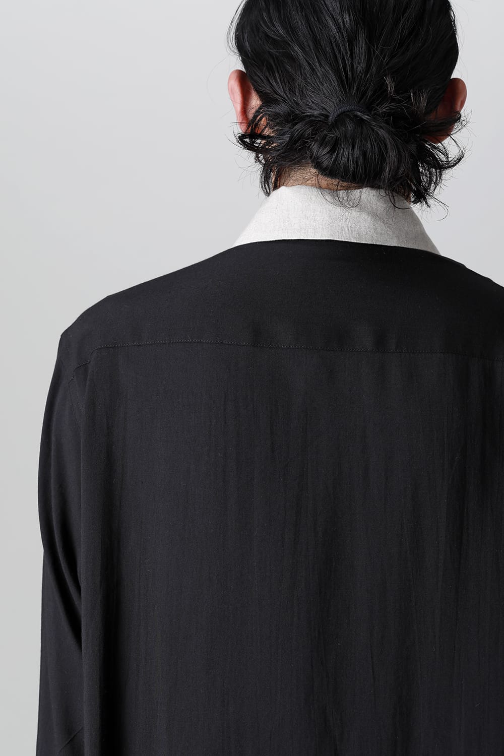 ランウェイLOOK2のインナーとして着用されていたミドルレングスのスペアカラーシャツ。柔らかくしなやかなBLACKのセルロース生地にボタンにて着脱可能なリネンのスペアカラーがデザインされています。スペアカラーを取り外すとシンプルなスタンドカラーシャツとしても着用できる汎用性も魅力的なアイテムです。両サイドの裾部分にはパンツポケットにアクセスしやすいよう、サイドスリットがデザインされています。