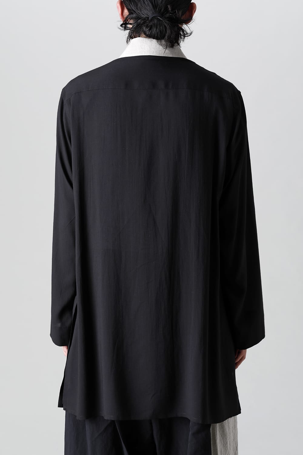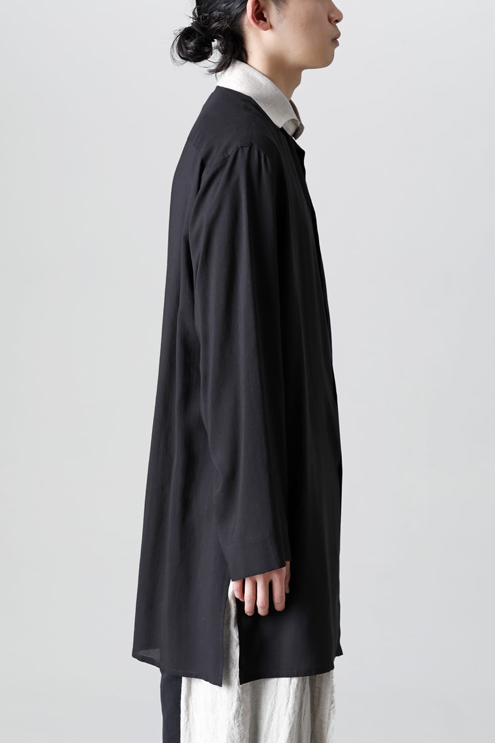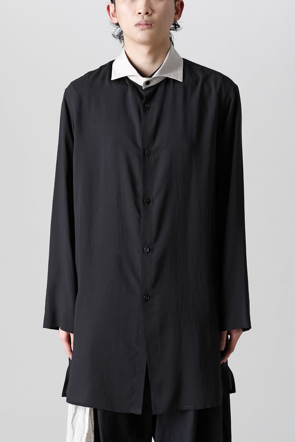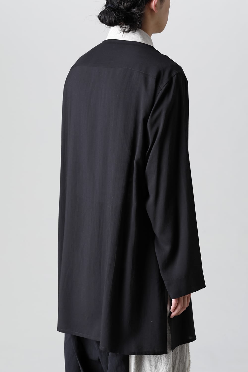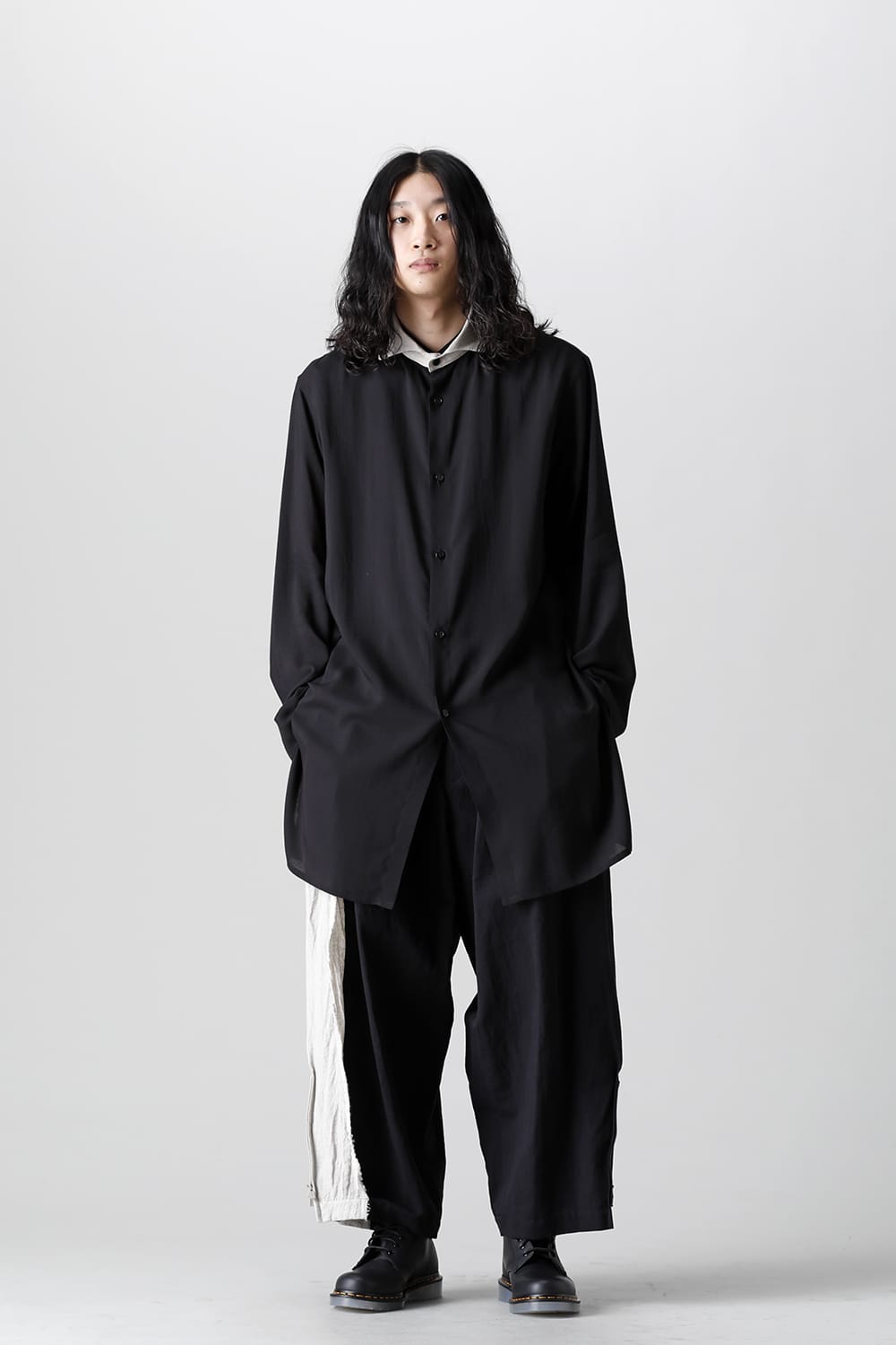 ランウェイLOOK2のインナーとして着用されていたミドルレングスのスペアカラーシャツ。柔らかくしなやかなBLACKのセルロース生地にボタンにて着脱可能なリネンのスペアカラーがデザインされています。スペアカラーを取り外すとシンプルなスタンドカラーシャツとしても着用できる汎用性も魅力的なアイテムです。両サイドの裾部分にはパンツポケットにアクセスしやすいよう、サイドスリットがデザインされています。