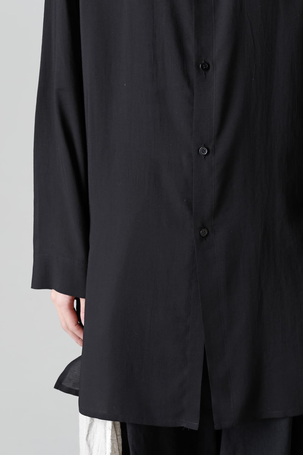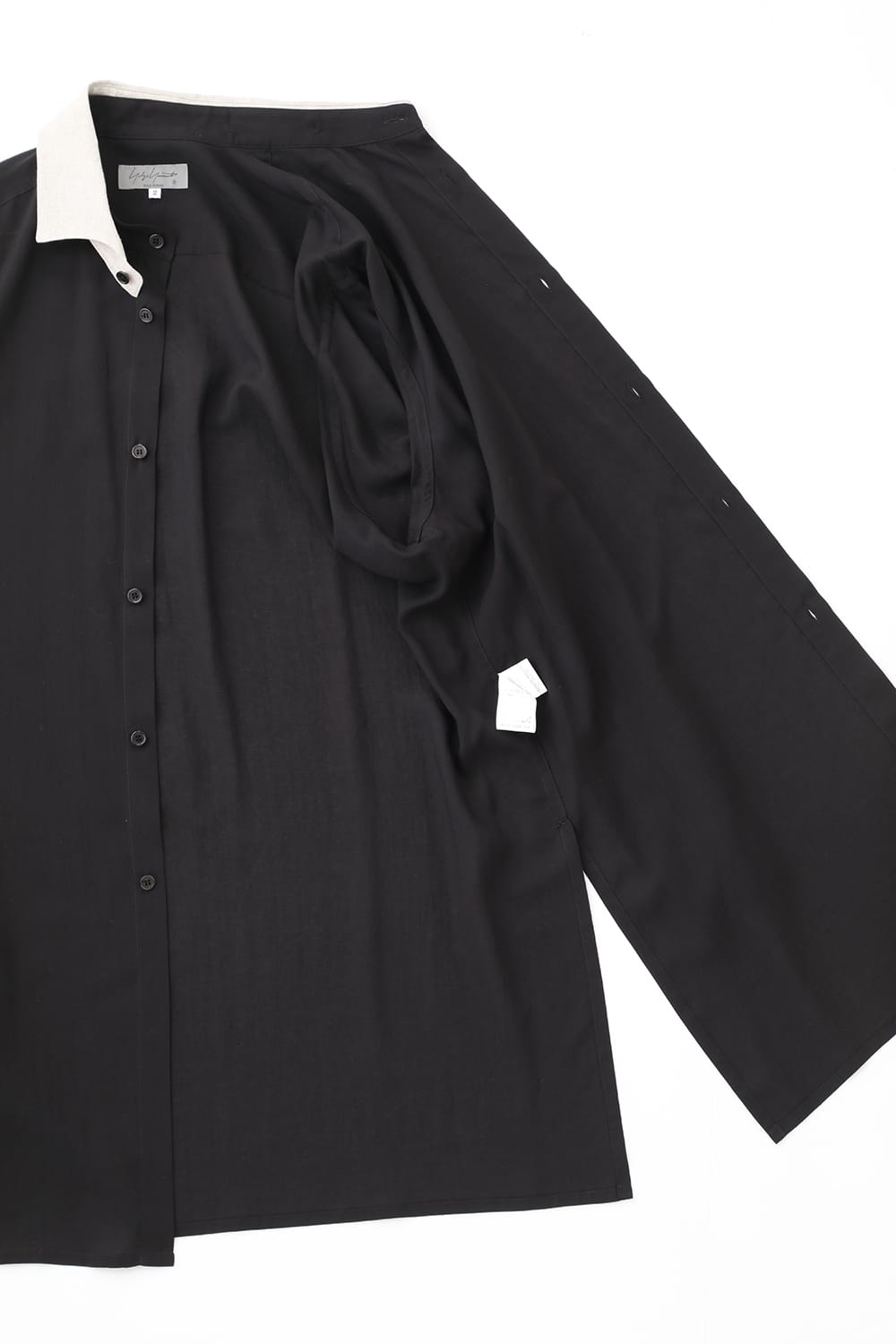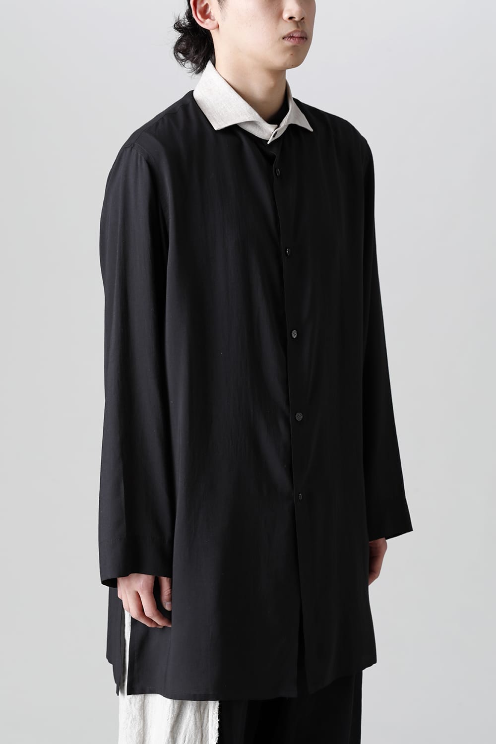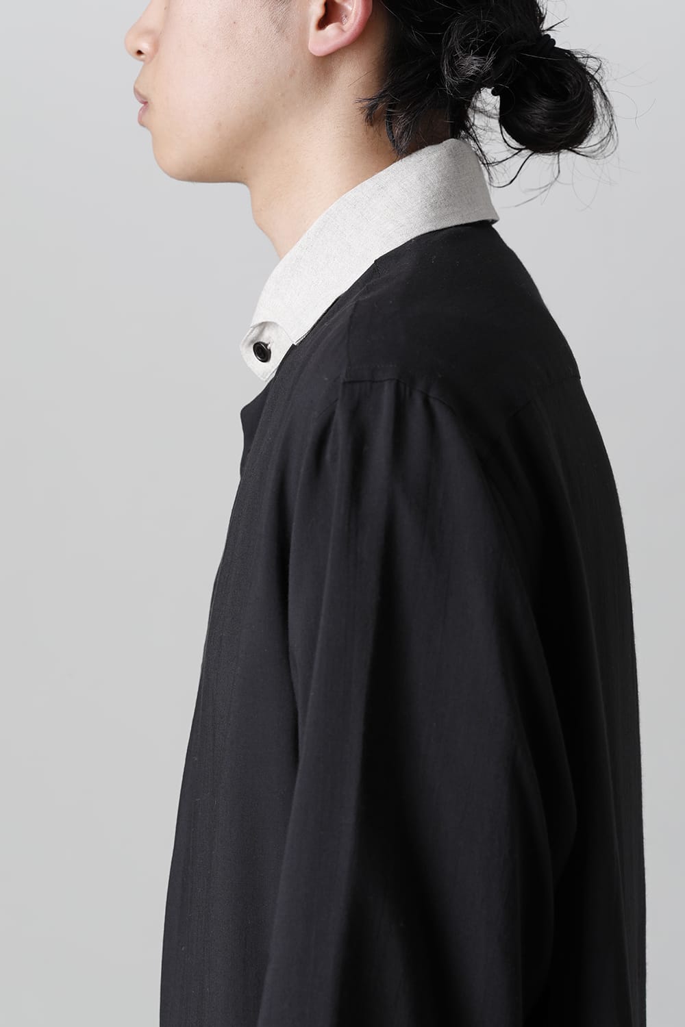 ランウェイLOOK2のインナーとして着用されていたミドルレングスのスペアカラーシャツ。柔らかくしなやかなBLACKのセルロース生地にボタンにて着脱可能なリネンのスペアカラーがデザインされています。スペアカラーを取り外すとシンプルなスタンドカラーシャツとしても着用できる汎用性も魅力的なアイテムです。両サイドの裾部分にはパンツポケットにアクセスしやすいよう、サイドスリットがデザインされています。