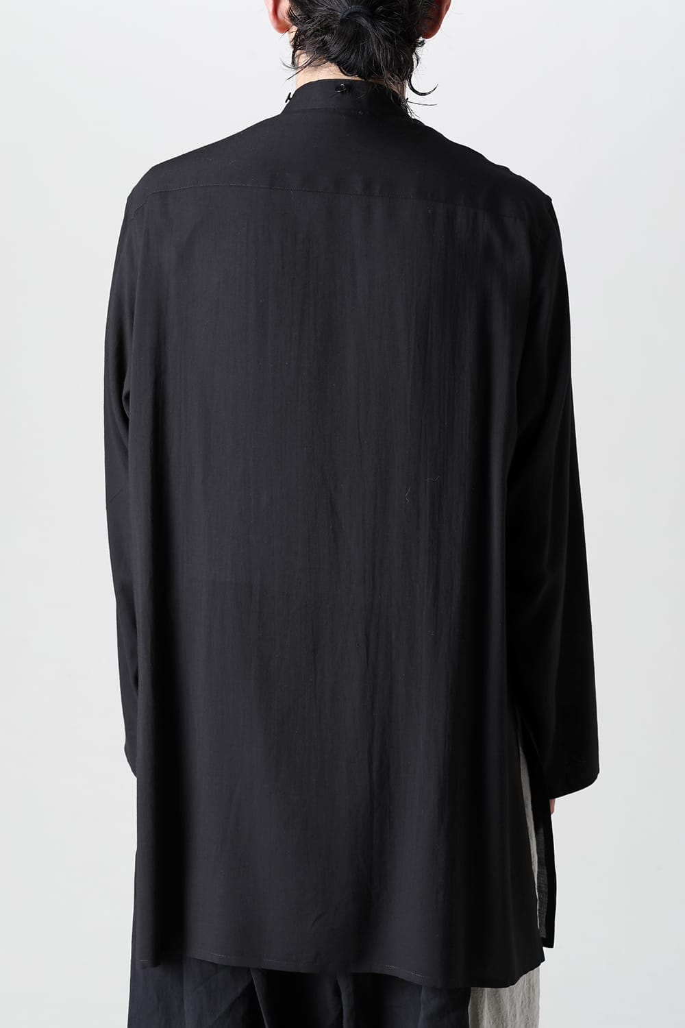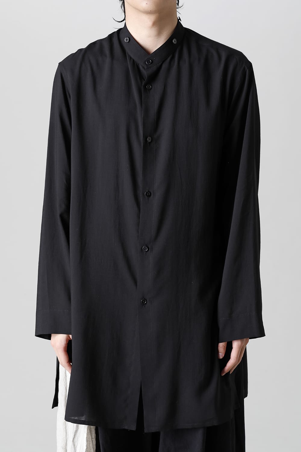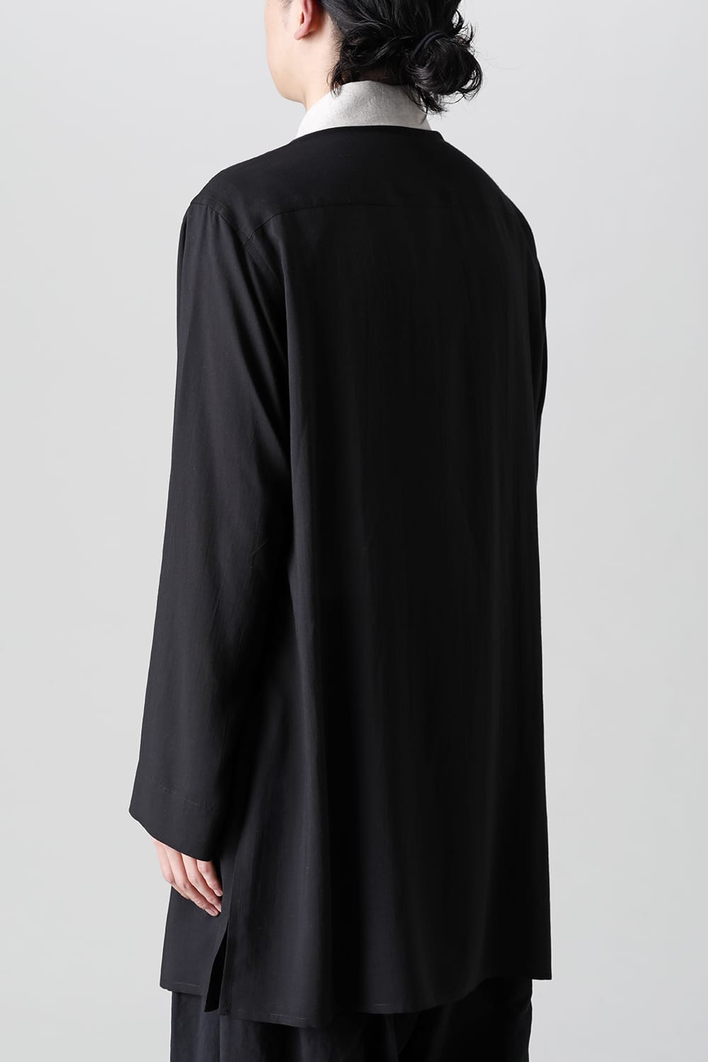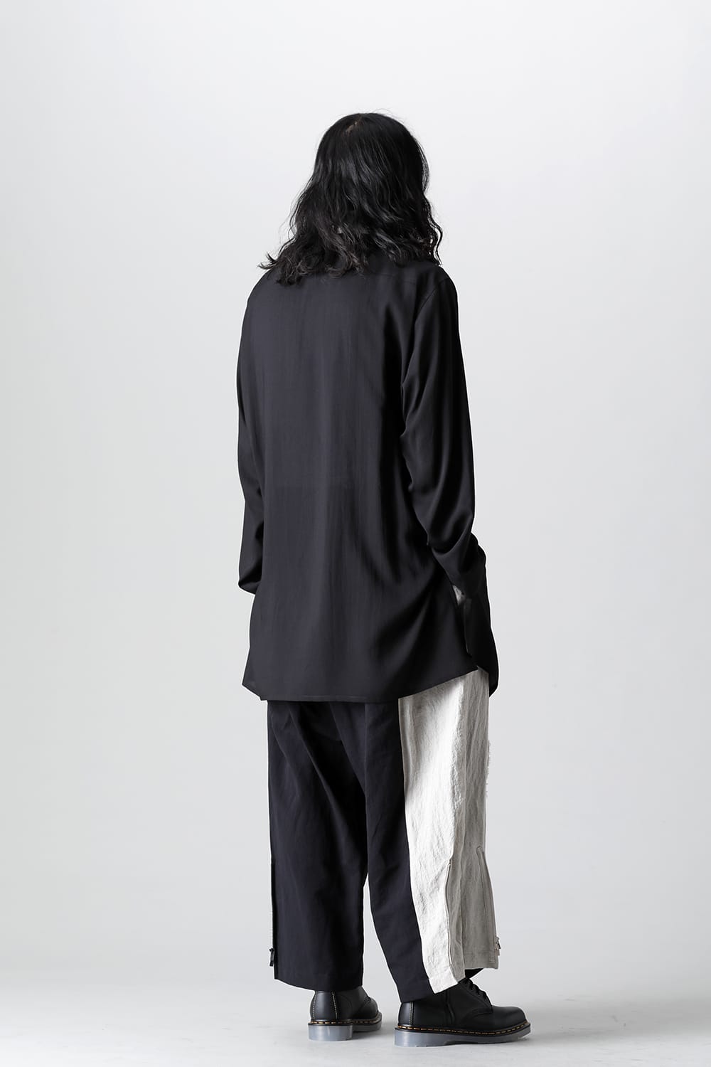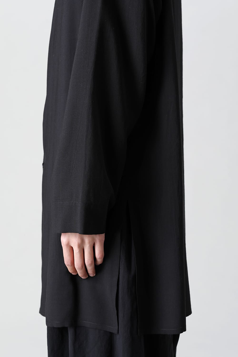 ランウェイLOOK2のインナーとして着用されていたミドルレングスのスペアカラーシャツ。柔らかくしなやかなBLACKのセルロース生地にボタンにて着脱可能なリネンのスペアカラーがデザインされています。スペアカラーを取り外すとシンプルなスタンドカラーシャツとしても着用できる汎用性も魅力的なアイテムです。両サイドの裾部分にはパンツポケットにアクセスしやすいよう、サイドスリットがデザインされています。