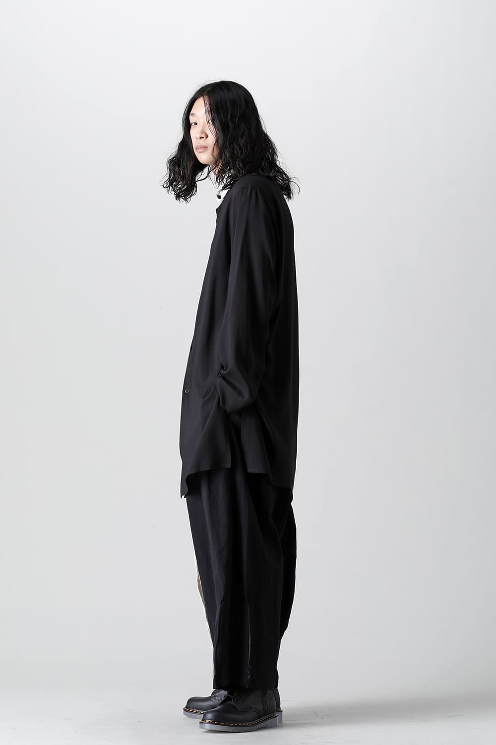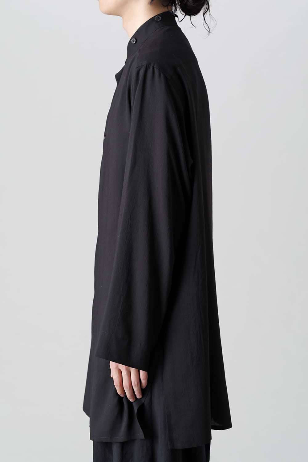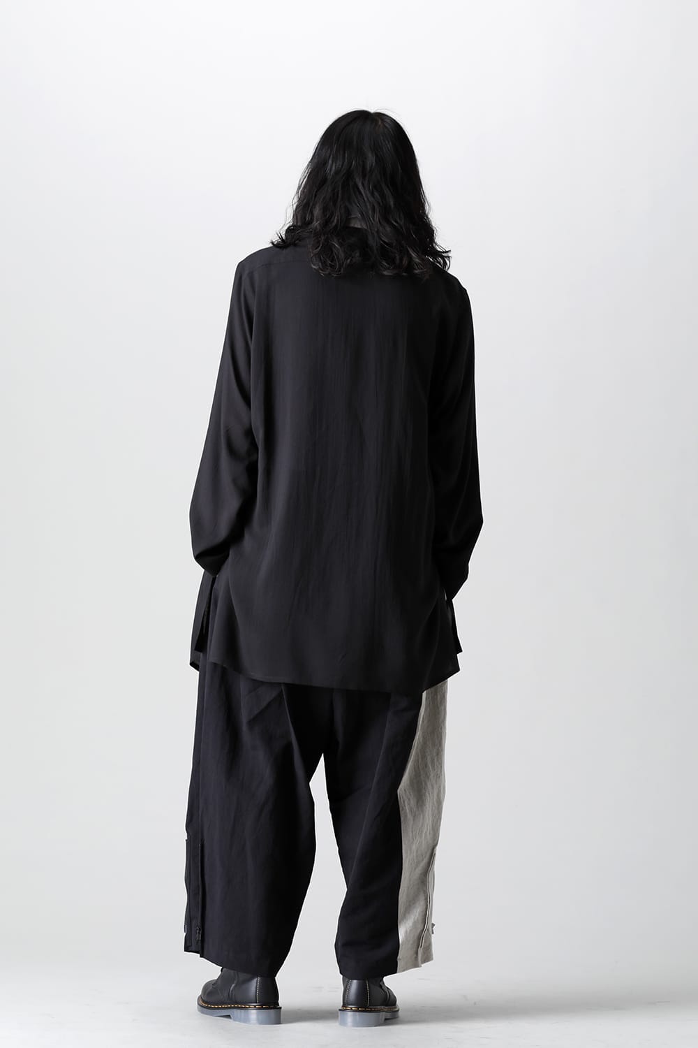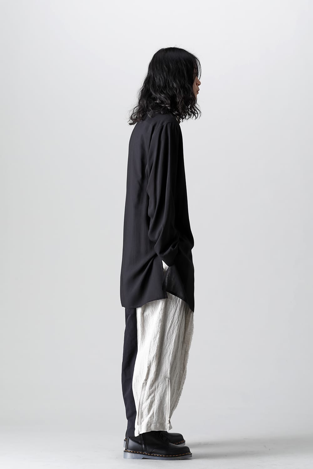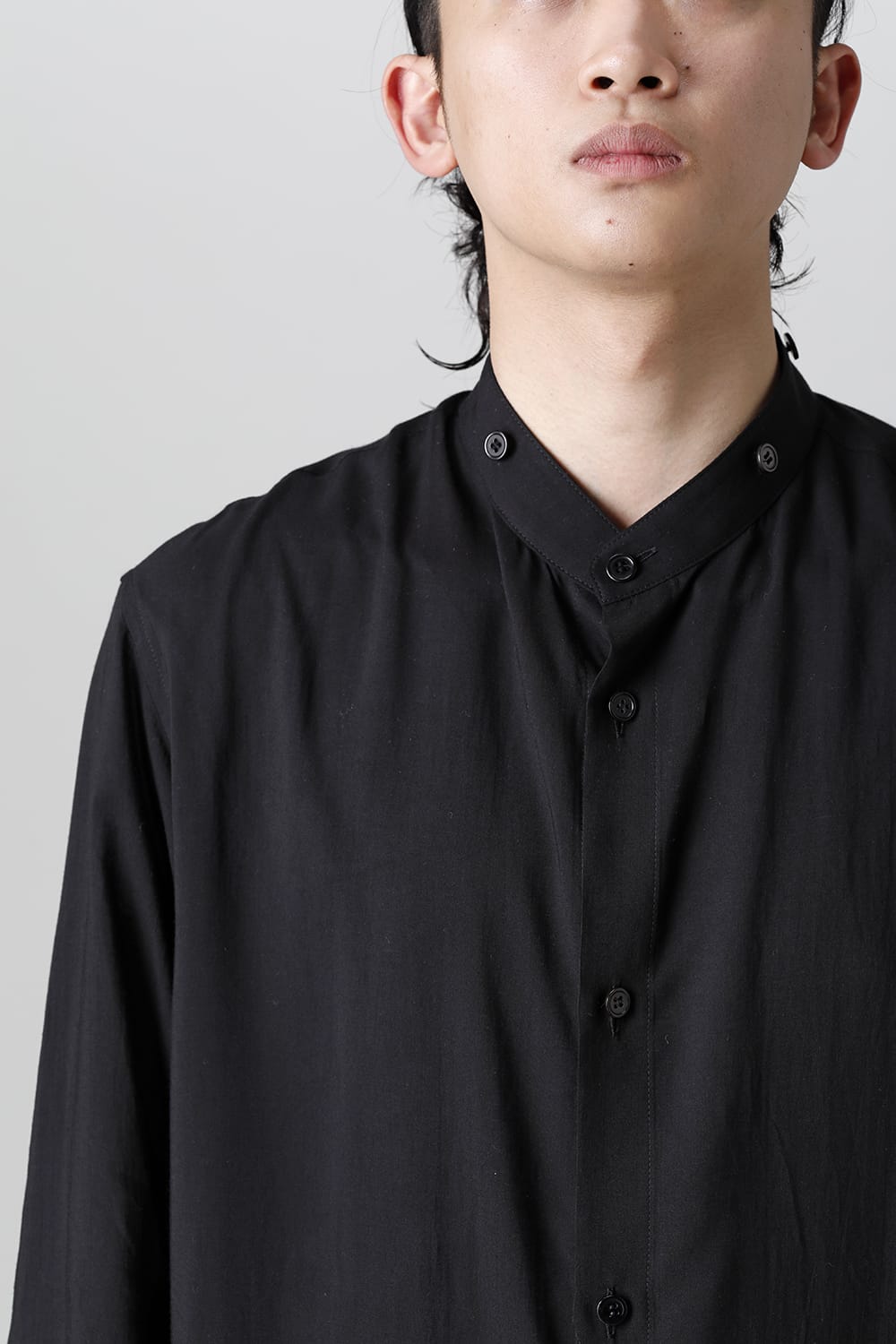 ランウェイLOOK2のインナーとして着用されていたミドルレングスのスペアカラーシャツ。柔らかくしなやかなBLACKのセルロース生地にボタンにて着脱可能なリネンのスペアカラーがデザインされています。スペアカラーを取り外すとシンプルなスタンドカラーシャツとしても着用できる汎用性も魅力的なアイテムです。両サイドの裾部分にはパンツポケットにアクセスしやすいよう、サイドスリットがデザインされています。