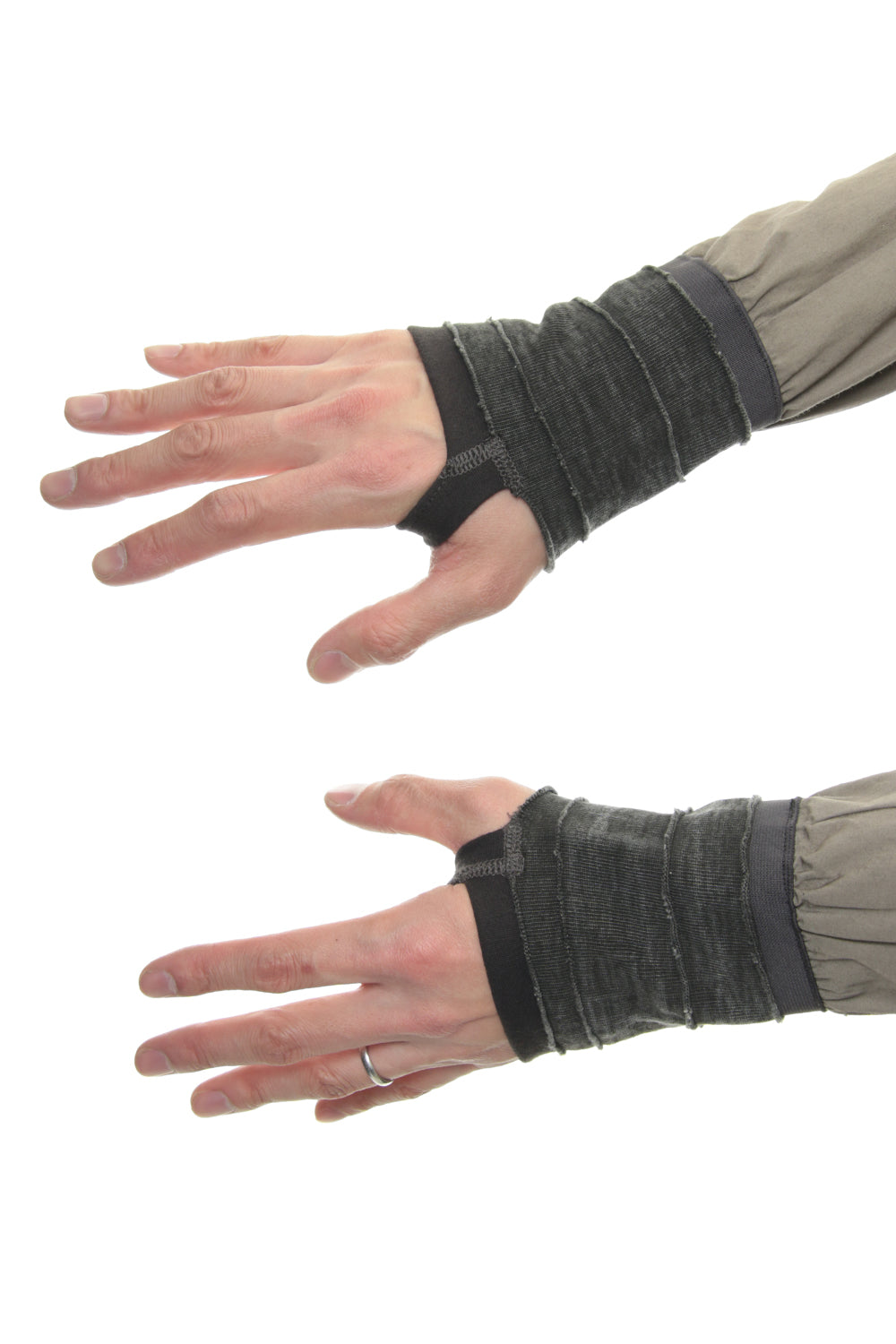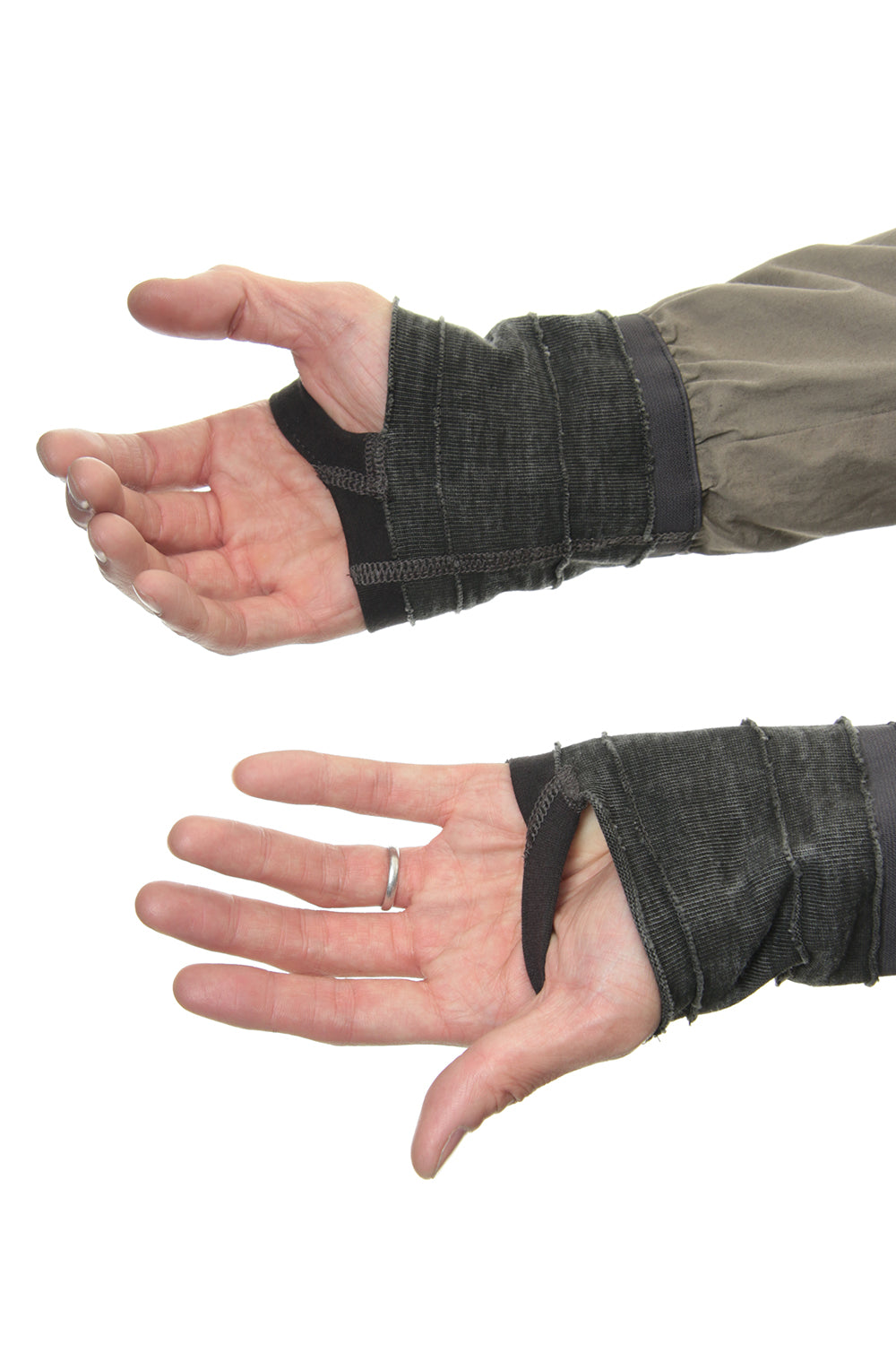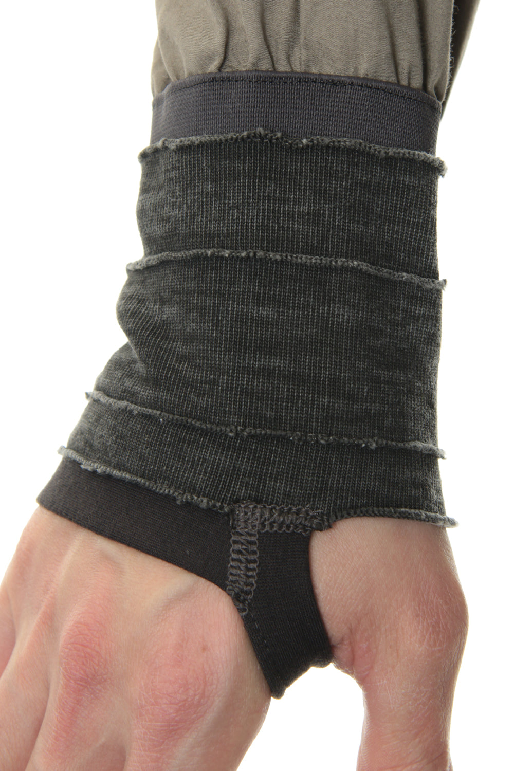 生地はイタリア (OLMETEX社)で制作し、それぞれ2色の糸染めにより独特の色を表現しており、高密度に織られた素材で独特の張りと柔らかさが特徴です。 レギュラーフィットで動きやすさを重視したサイズ感をとなっており、墨染製品加工によって全体に陰影を付けています。 袖口にはバンテージを巻いたようなサムホール仕様となっております。