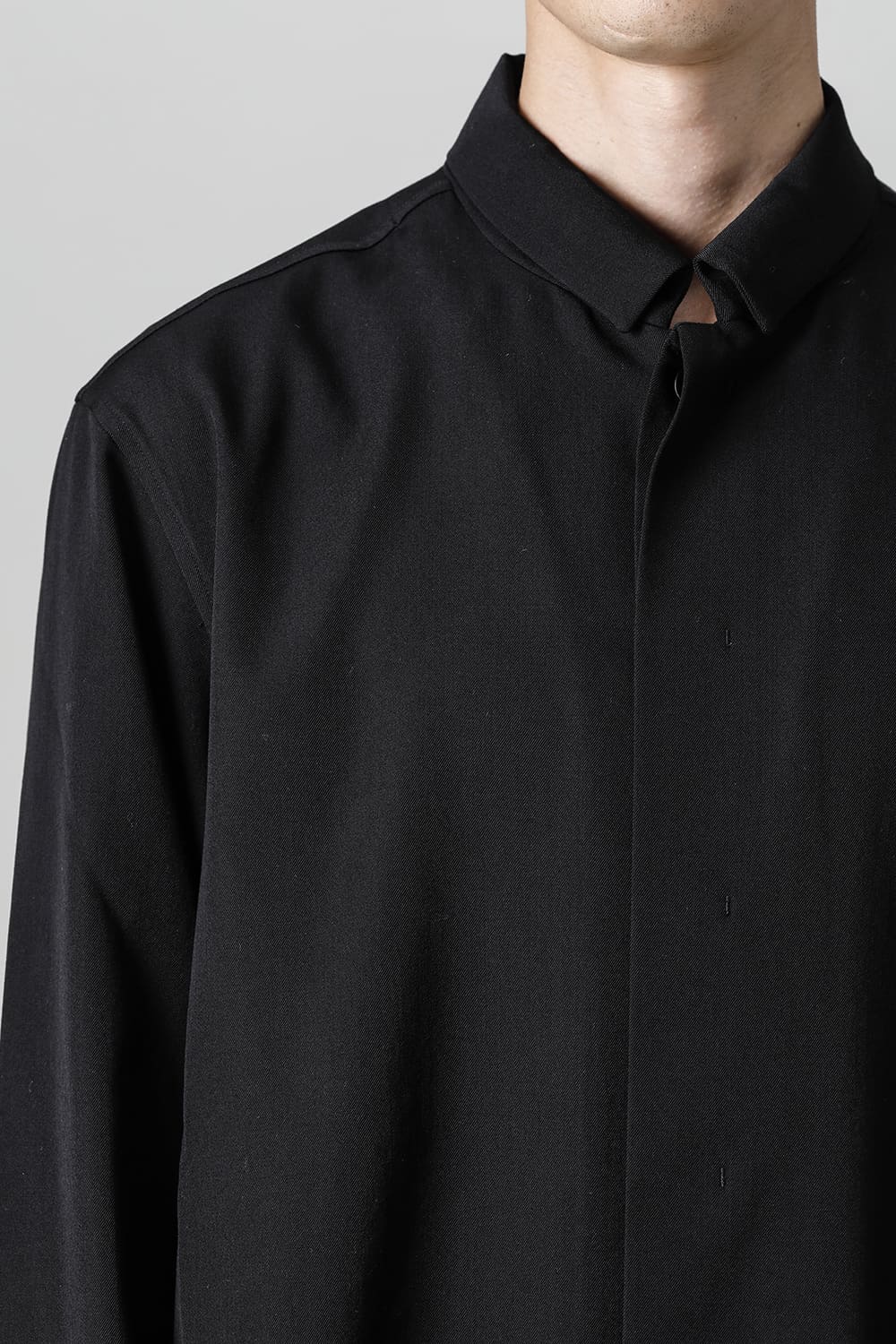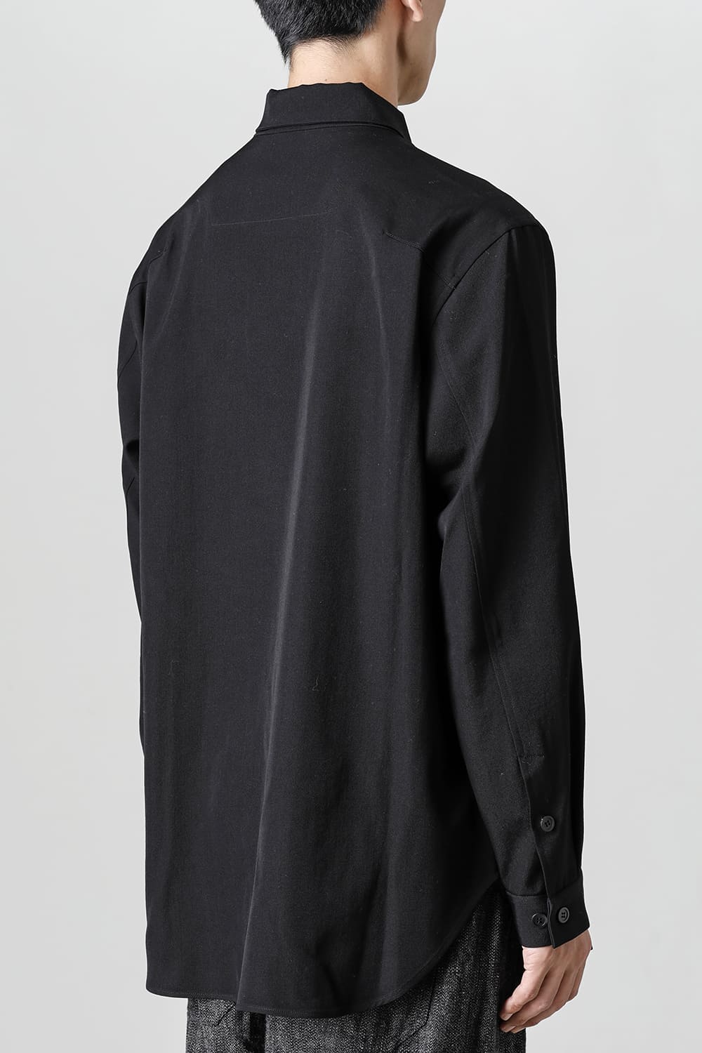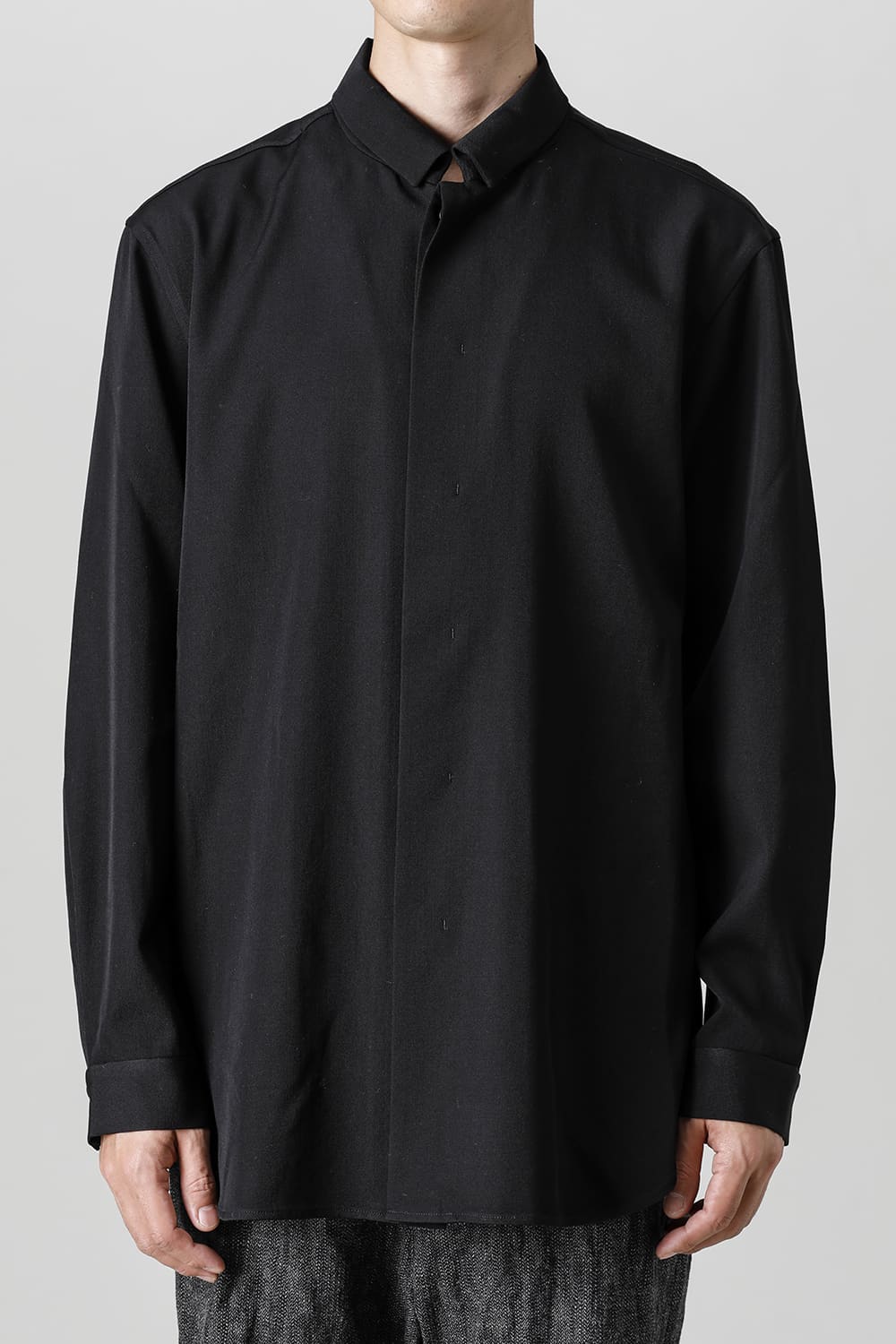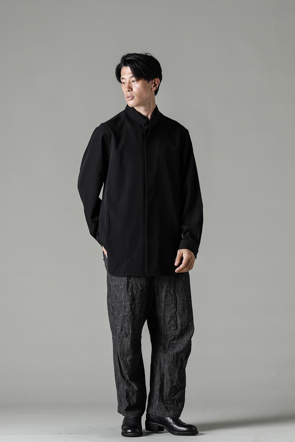 リラックスフィットのアウターシャツ。第1ボタンを排した小振りのカラーが反するボリュームシルエットと相まって独自の雰囲気を表現。アウターとしての着用を想定したゆったり目のデザインですが、ショルダーディテールにダーツを加え立体的に裁断されているので収まりの良い着用感を実現しています。ディテールではフロントは比翼仕立て、襟をステッチ止めをしたカラーデザインなど細部に渡りデザイナーの拘りが投影されています。素材は高級感あるバージンウールを使用。光沢があり非常に柔らかな素材ですが、しっかりとしたハリもあり洗練されたデザインを崩すことなく着用できます。