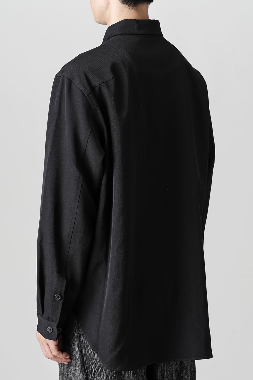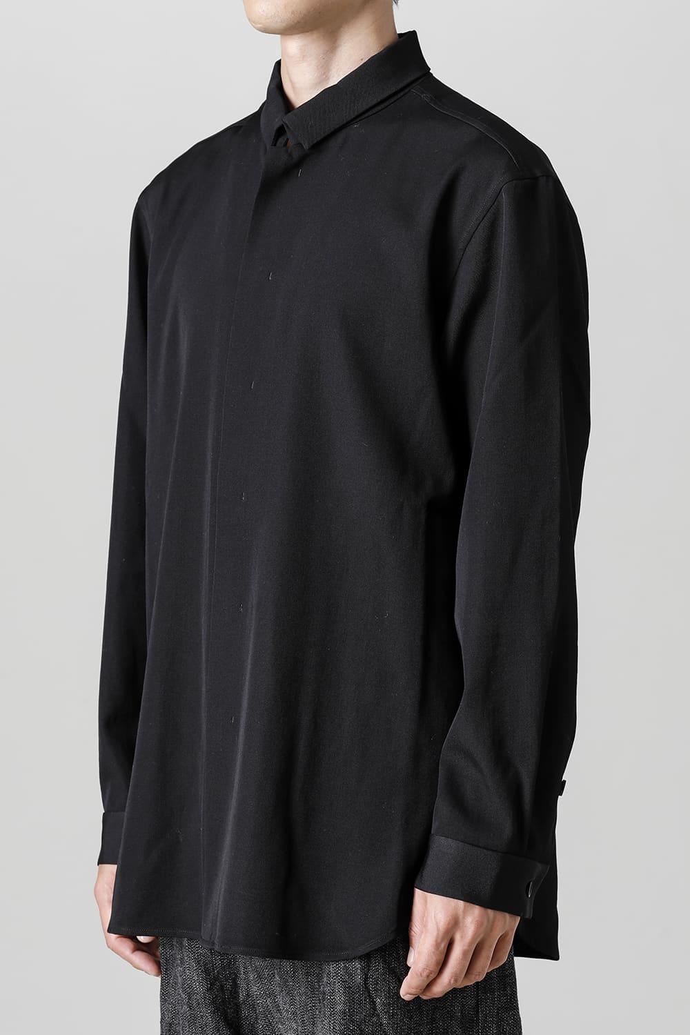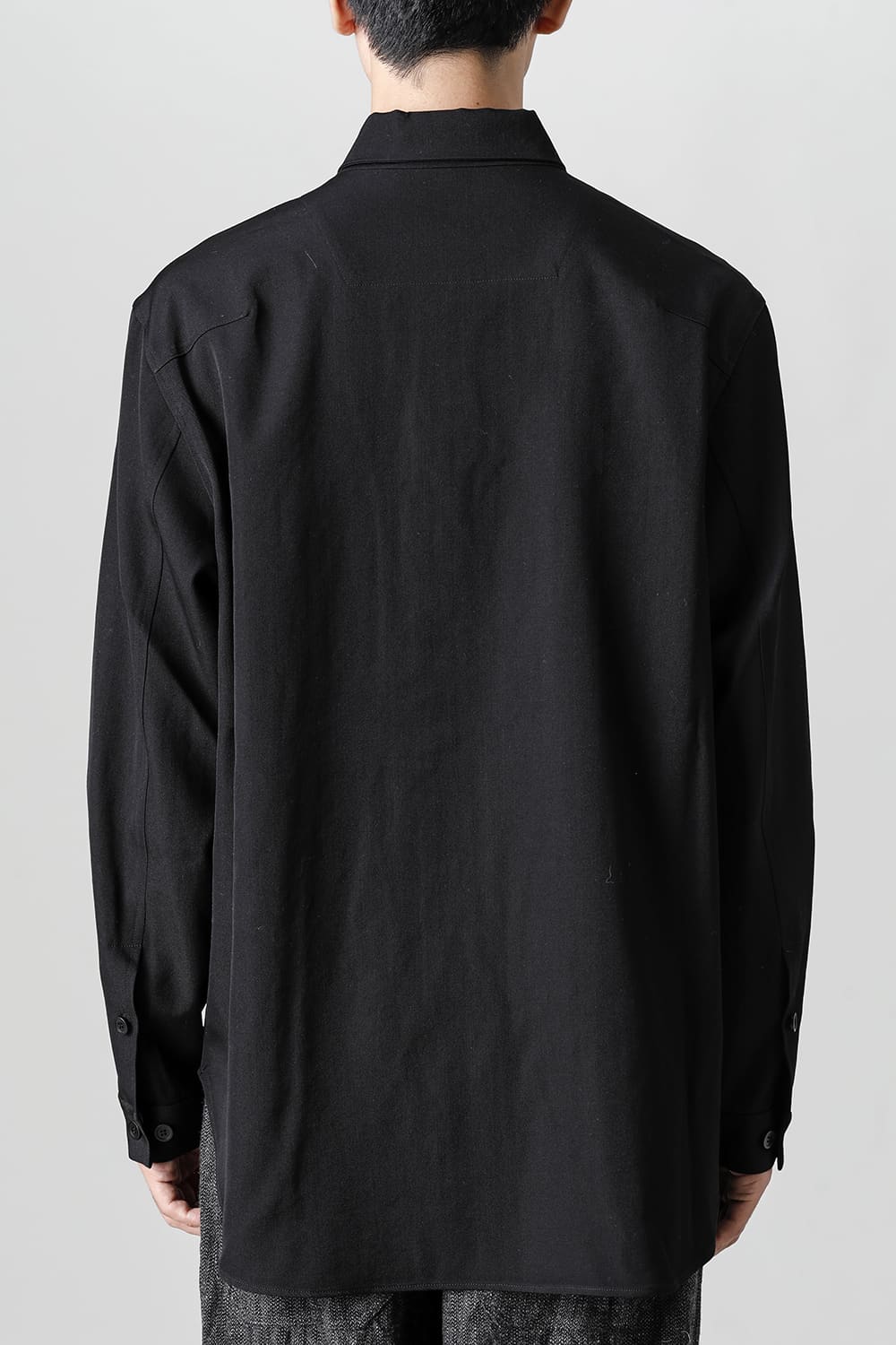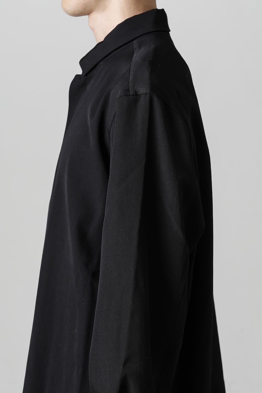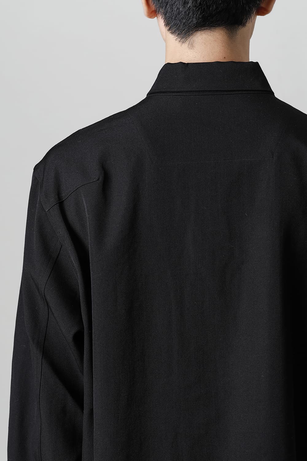 リラックスフィットのアウターシャツ。第1ボタンを排した小振りのカラーが反するボリュームシルエットと相まって独自の雰囲気を表現。アウターとしての着用を想定したゆったり目のデザインですが、ショルダーディテールにダーツを加え立体的に裁断されているので収まりの良い着用感を実現しています。ディテールではフロントは比翼仕立て、襟をステッチ止めをしたカラーデザインなど細部に渡りデザイナーの拘りが投影されています。素材は高級感あるバージンウールを使用。光沢があり非常に柔らかな素材ですが、しっかりとしたハリもあり洗練されたデザインを崩すことなく着用できます。