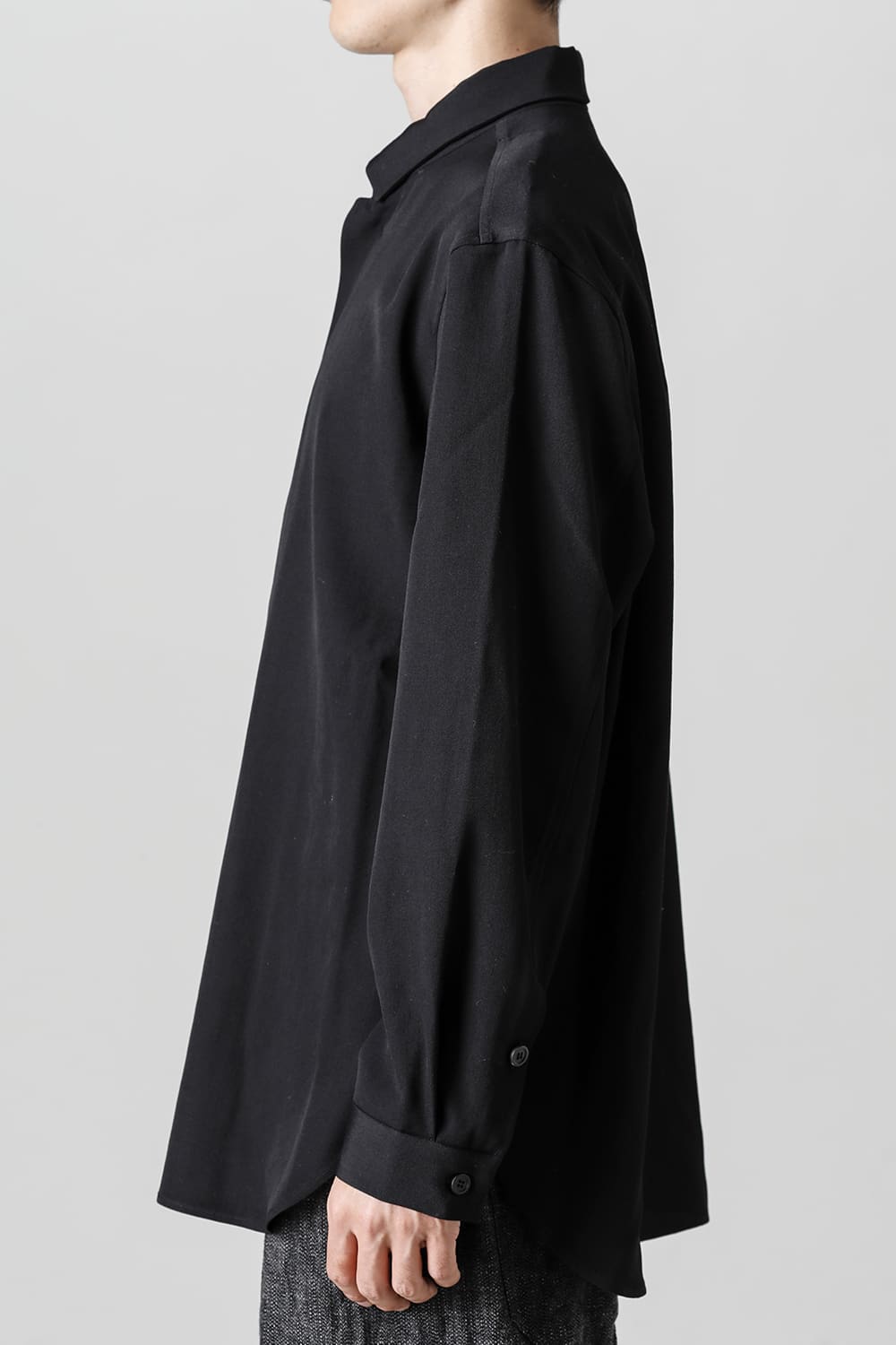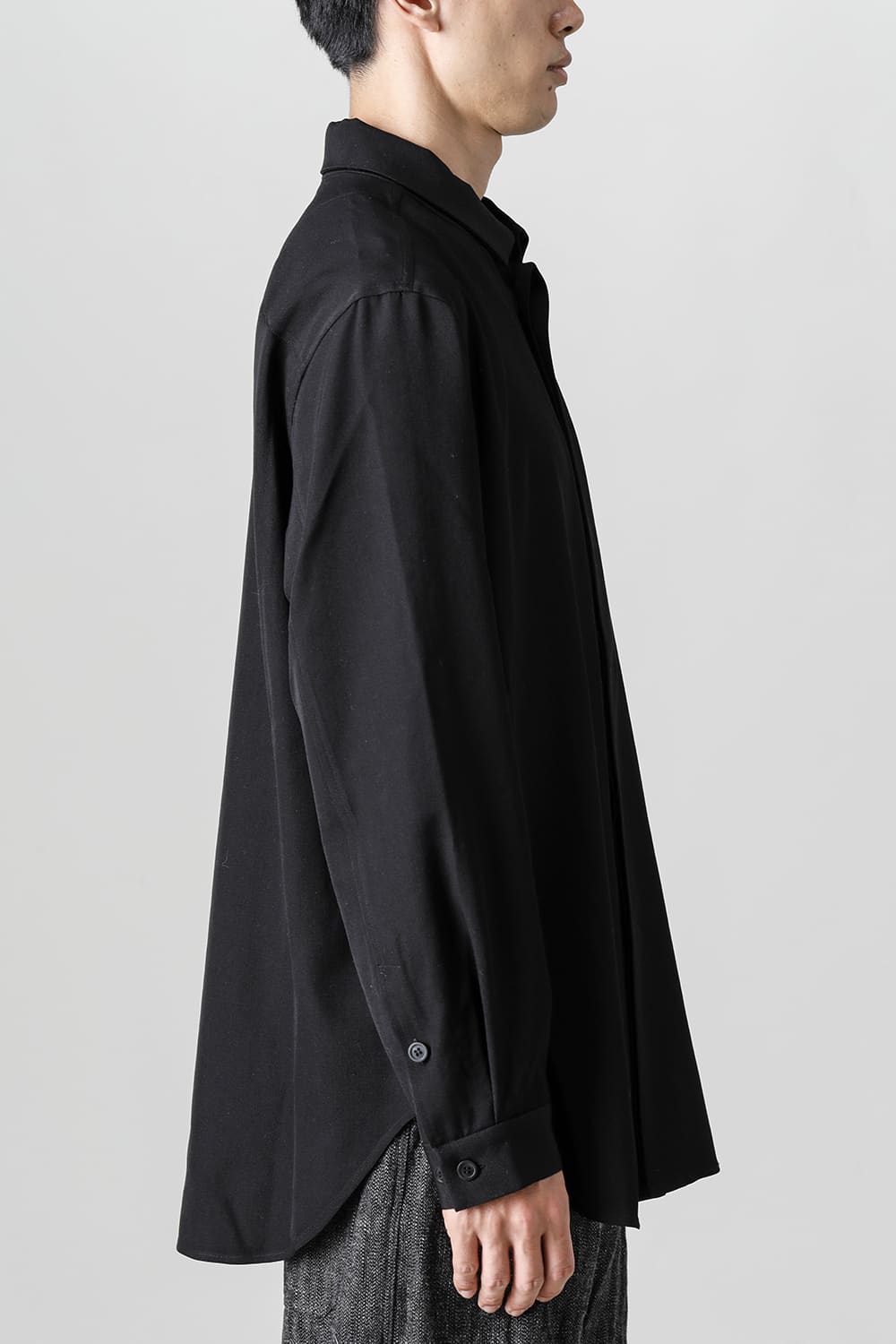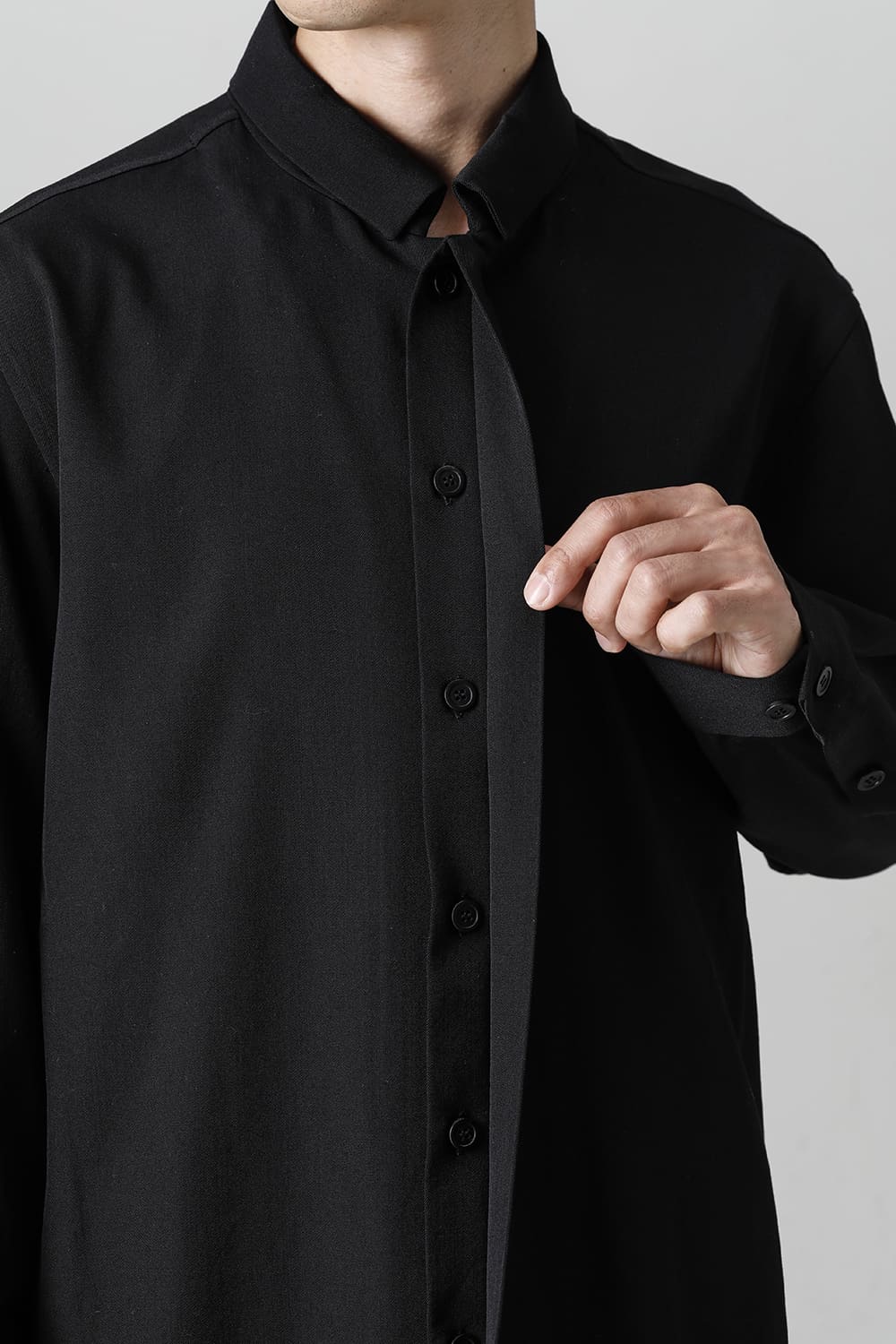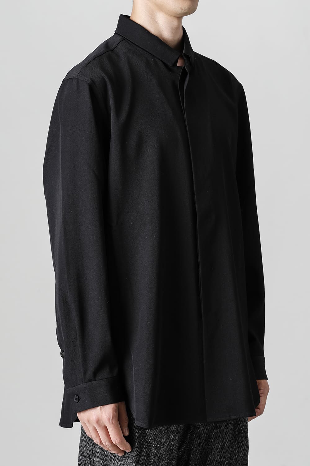 リラックスフィットのアウターシャツ。第1ボタンを排した小振りのカラーが反するボリュームシルエットと相まって独自の雰囲気を表現。アウターとしての着用を想定したゆったり目のデザインですが、ショルダーディテールにダーツを加え立体的に裁断されているので収まりの良い着用感を実現しています。ディテールではフロントは比翼仕立て、襟をステッチ止めをしたカラーデザインなど細部に渡りデザイナーの拘りが投影されています。素材は高級感あるバージンウールを使用。光沢があり非常に柔らかな素材ですが、しっかりとしたハリもあり洗練されたデザインを崩すことなく着用できます。