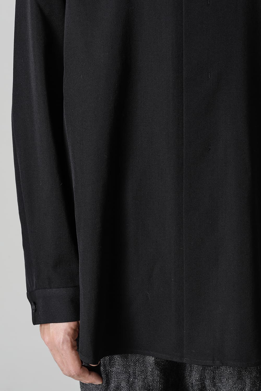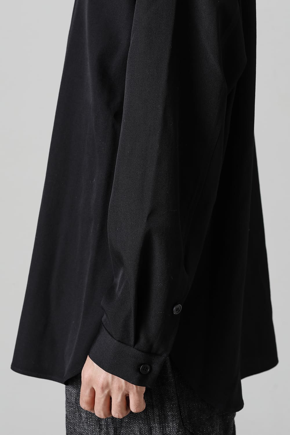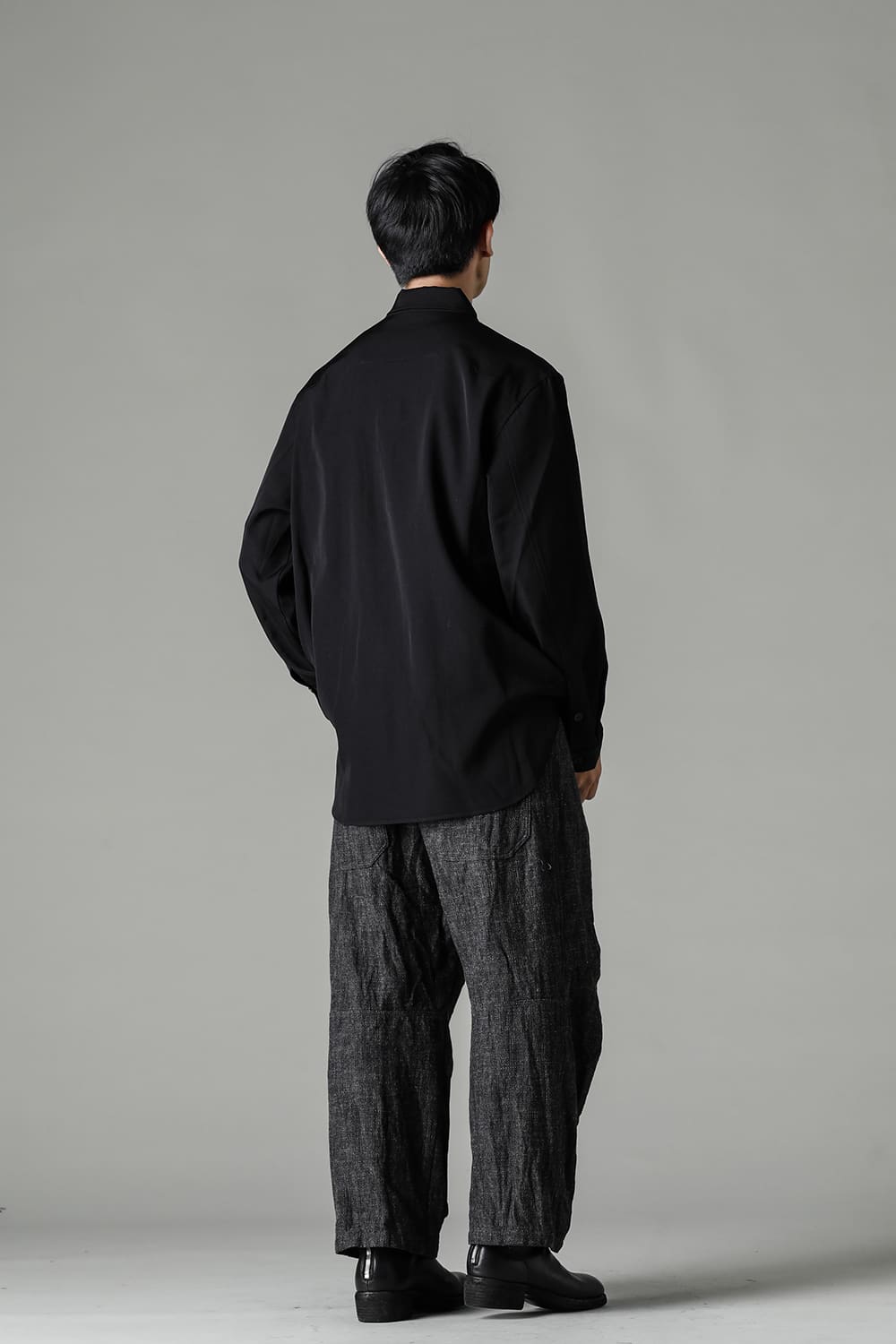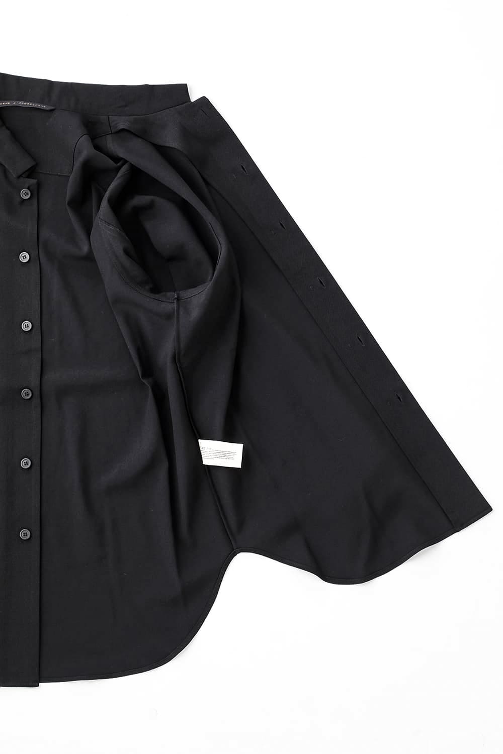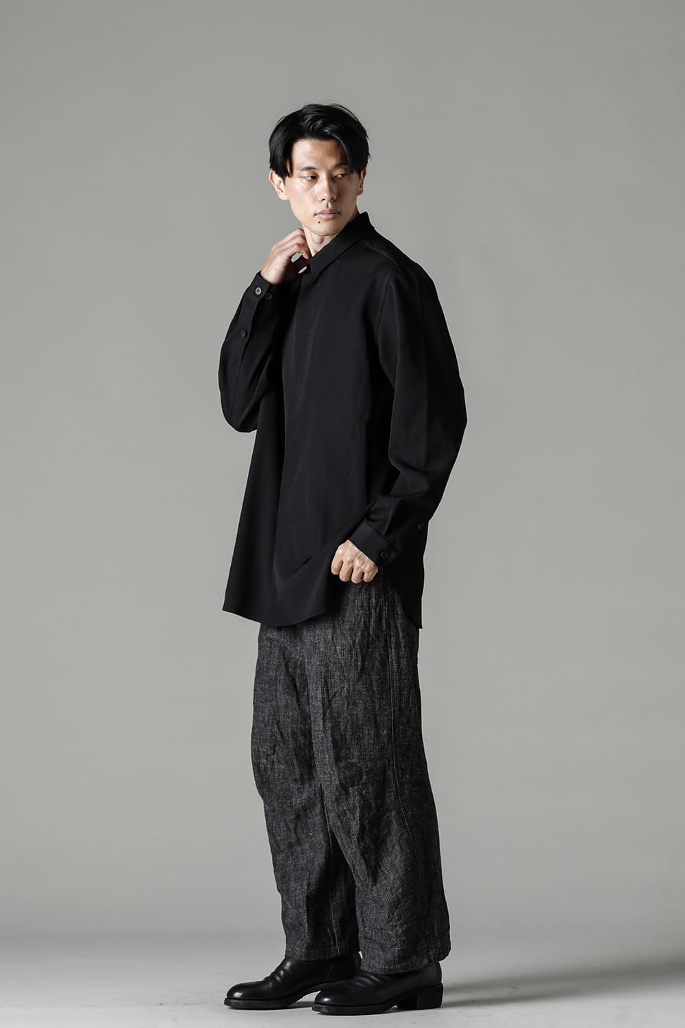 リラックスフィットのアウターシャツ。第1ボタンを排した小振りのカラーが反するボリュームシルエットと相まって独自の雰囲気を表現。アウターとしての着用を想定したゆったり目のデザインですが、ショルダーディテールにダーツを加え立体的に裁断されているので収まりの良い着用感を実現しています。ディテールではフロントは比翼仕立て、襟をステッチ止めをしたカラーデザインなど細部に渡りデザイナーの拘りが投影されています。素材は高級感あるバージンウールを使用。光沢があり非常に柔らかな素材ですが、しっかりとしたハリもあり洗練されたデザインを崩すことなく着用できます。