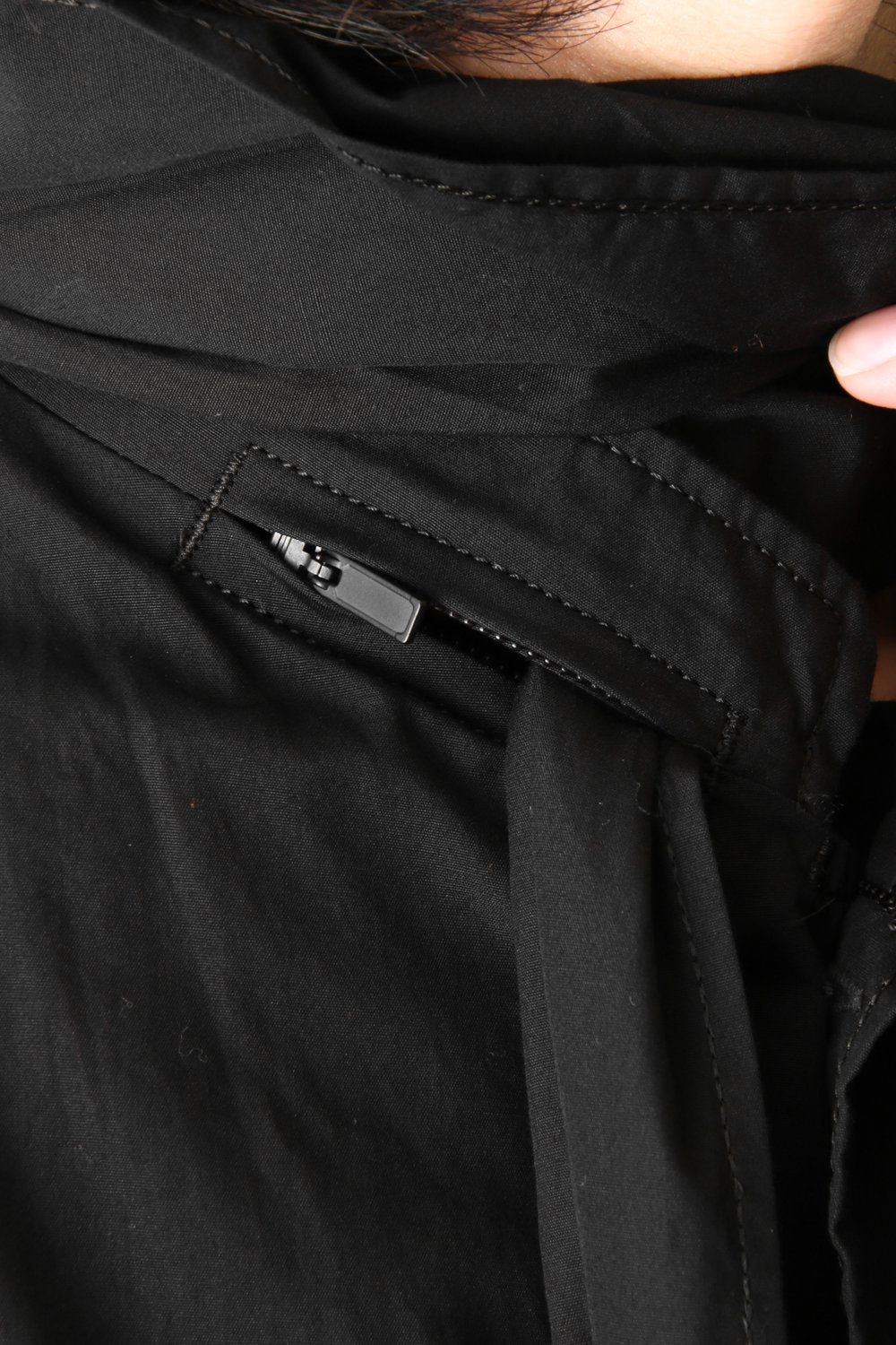 左襟部分がスカーフ状に大きく伸びたデザインが特徴的なロングシャツコート。右襟にはスカーフ部分を通すことのできるジップ開閉が可能な穴が空いています。生地はYohji Yamamotoではお馴染みのコットンブロードなので、冬場のインナーから春先の羽織まで幅広いシーズンでお楽しみいただけるアイテムです。