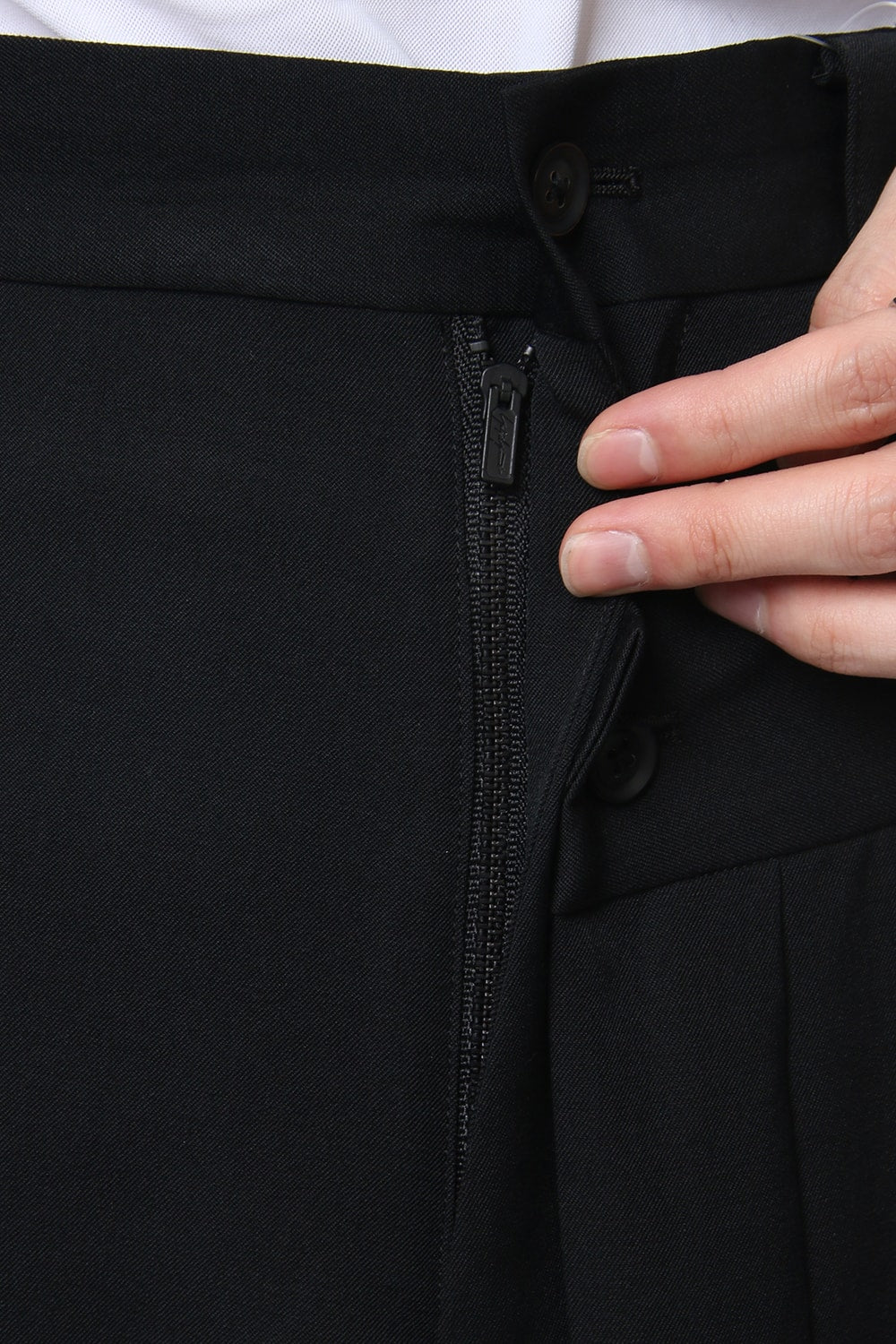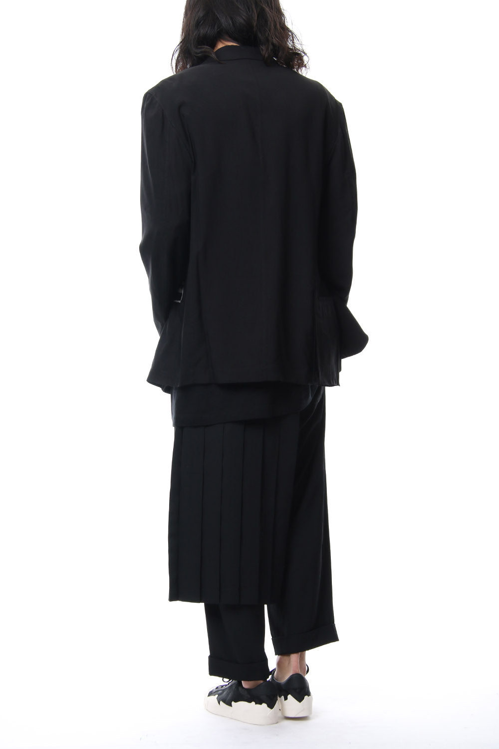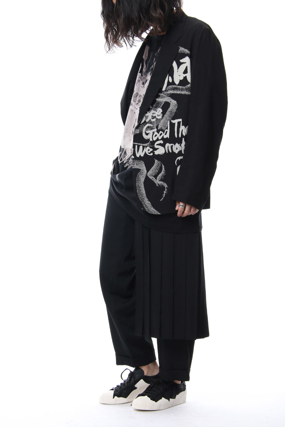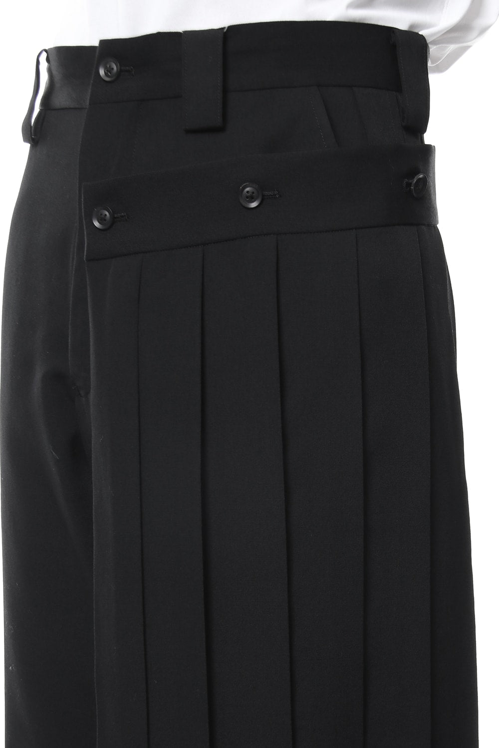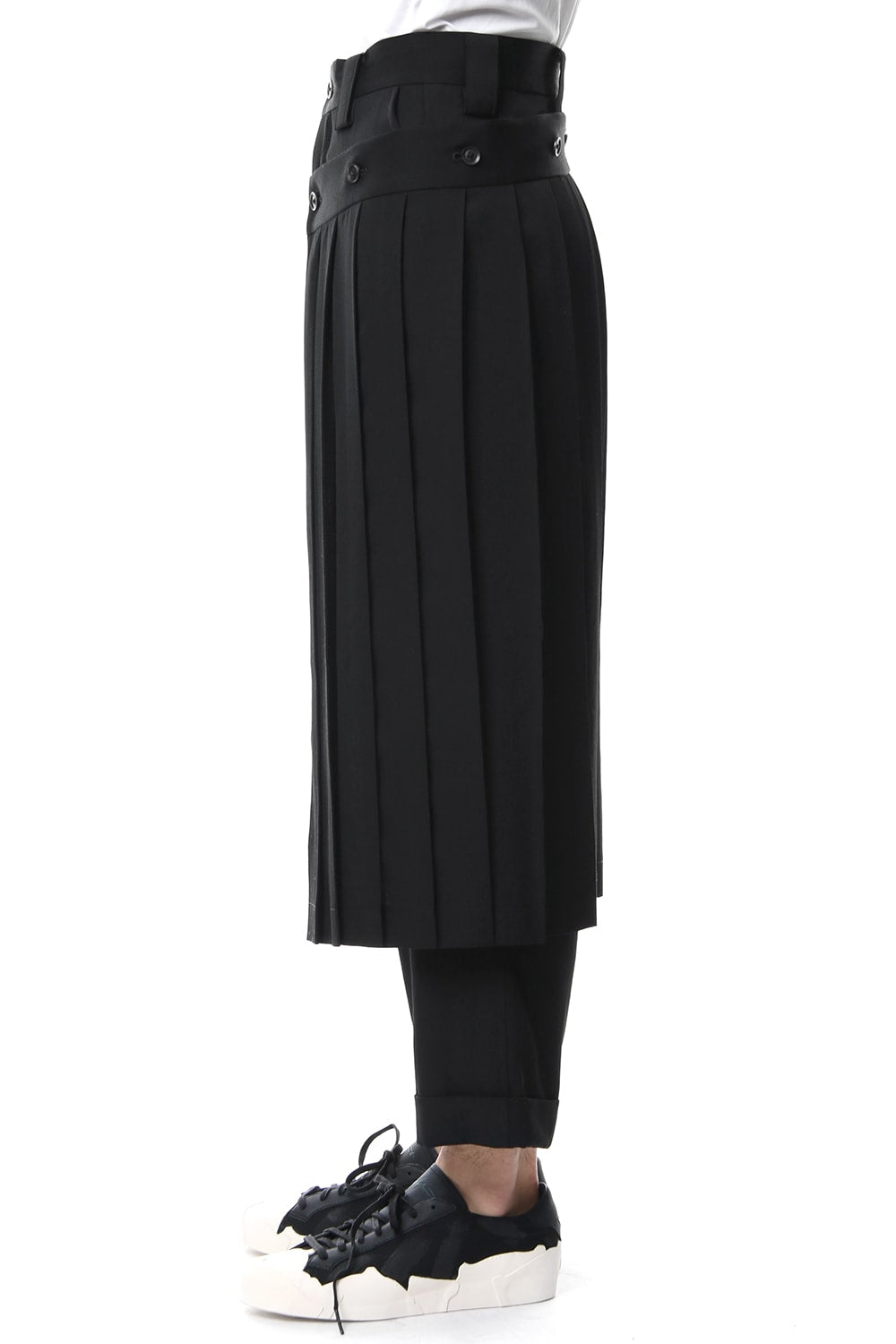 LOOK25で着用されていたプリーツスカートパーツが着脱可能なデザインが特徴的なウールギャバジン生地のラップパンツ。スカート部分は着脱可能でベースとなるパンツは細身の9部丈パンツですので、スカートパーツを取り外しても様々な着こなしが楽しめるアイテムです。