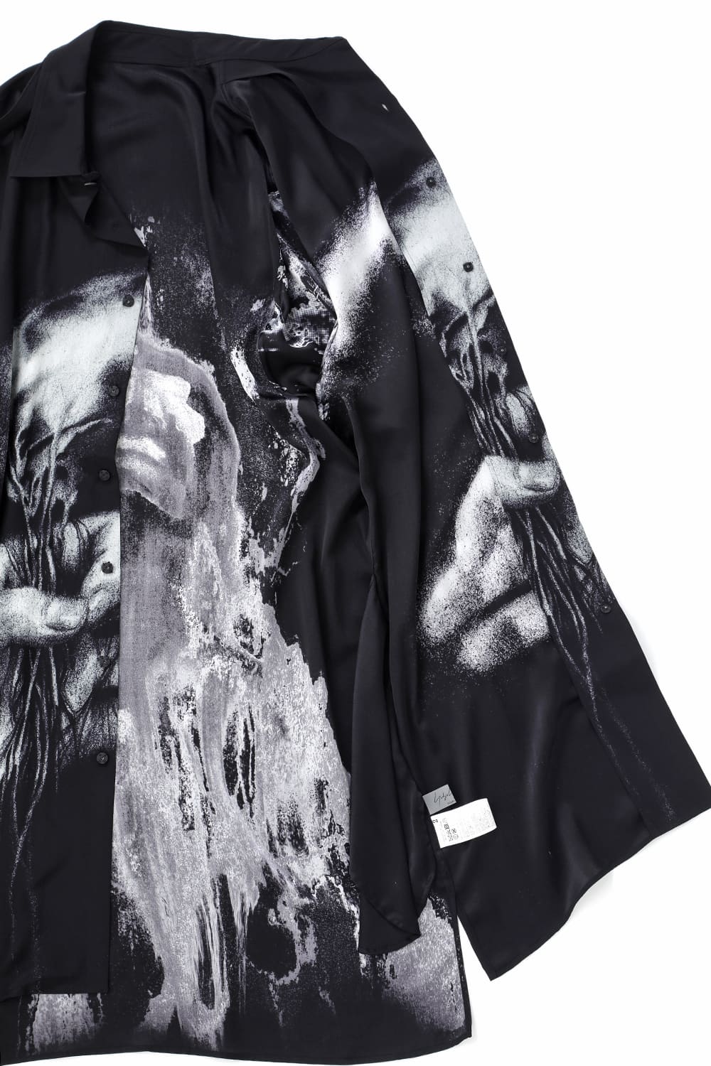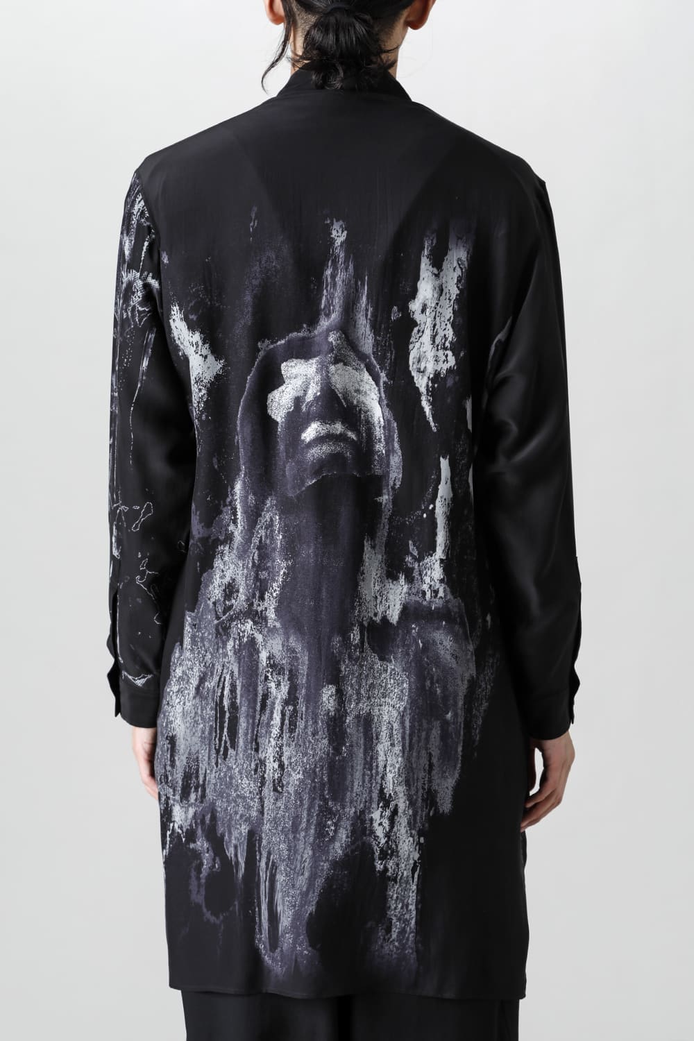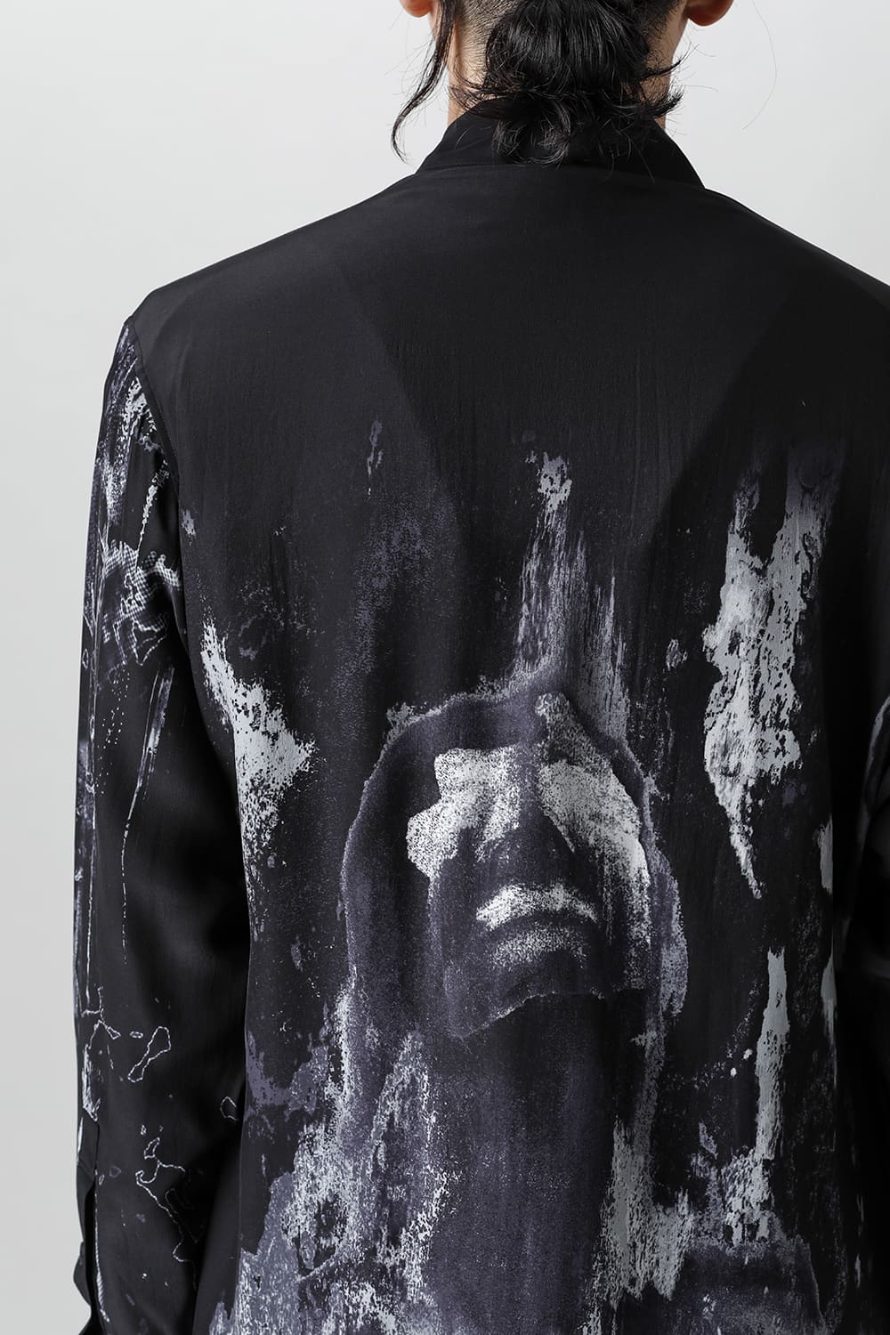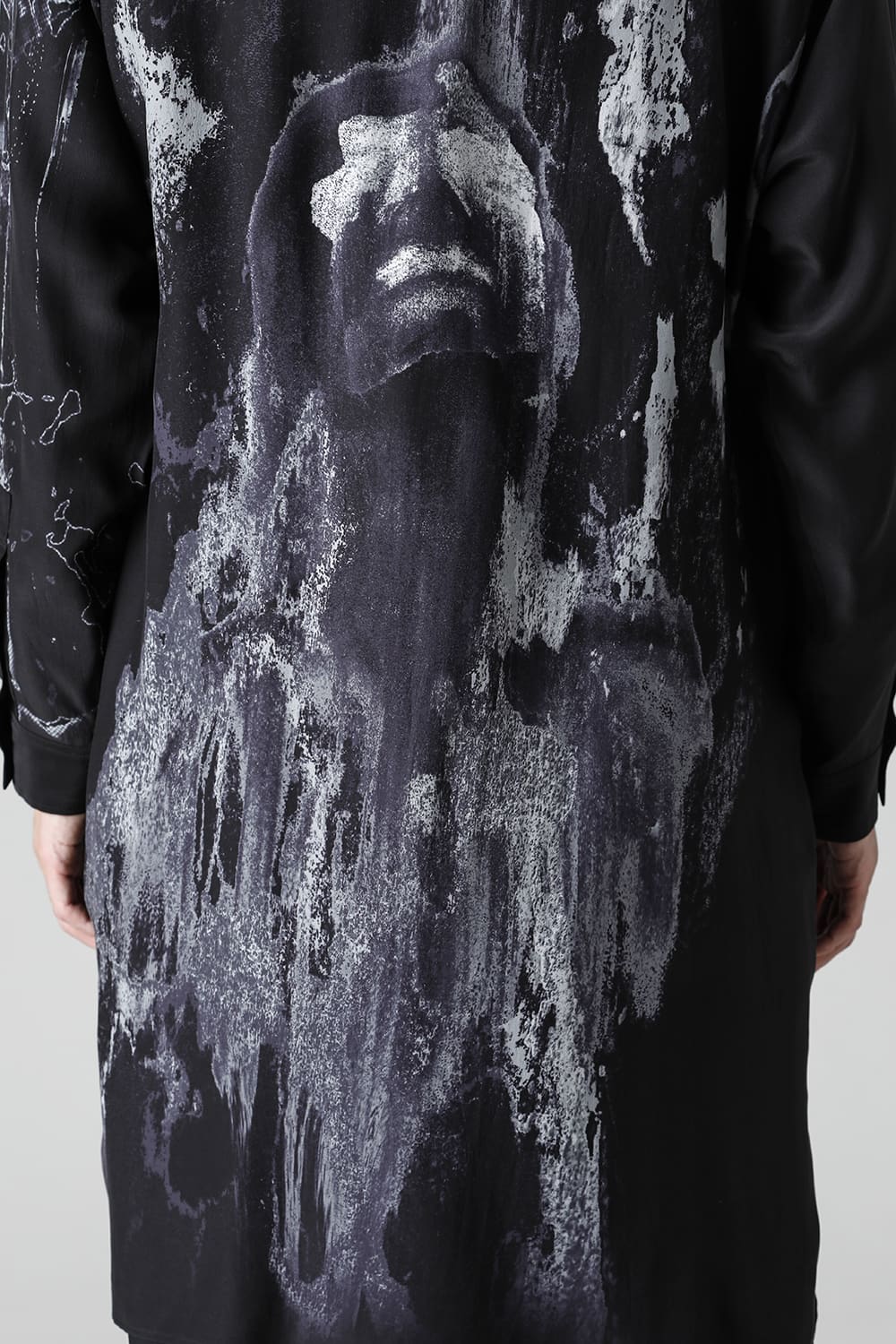 アーティストの"ジェームス・ジーン"とのコラボレーションアイテムです。 プリントの特性を活かし、シルクデシン生地の裏面からプリントを施す事で、色味の濃淡を生み出し、まるで絵が滲み出てくるような独特のタッチを表現しています。