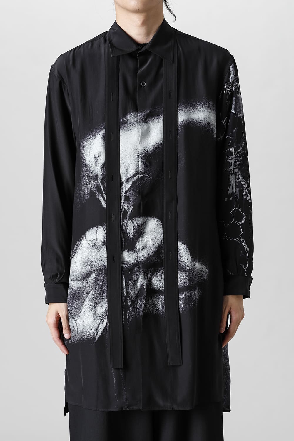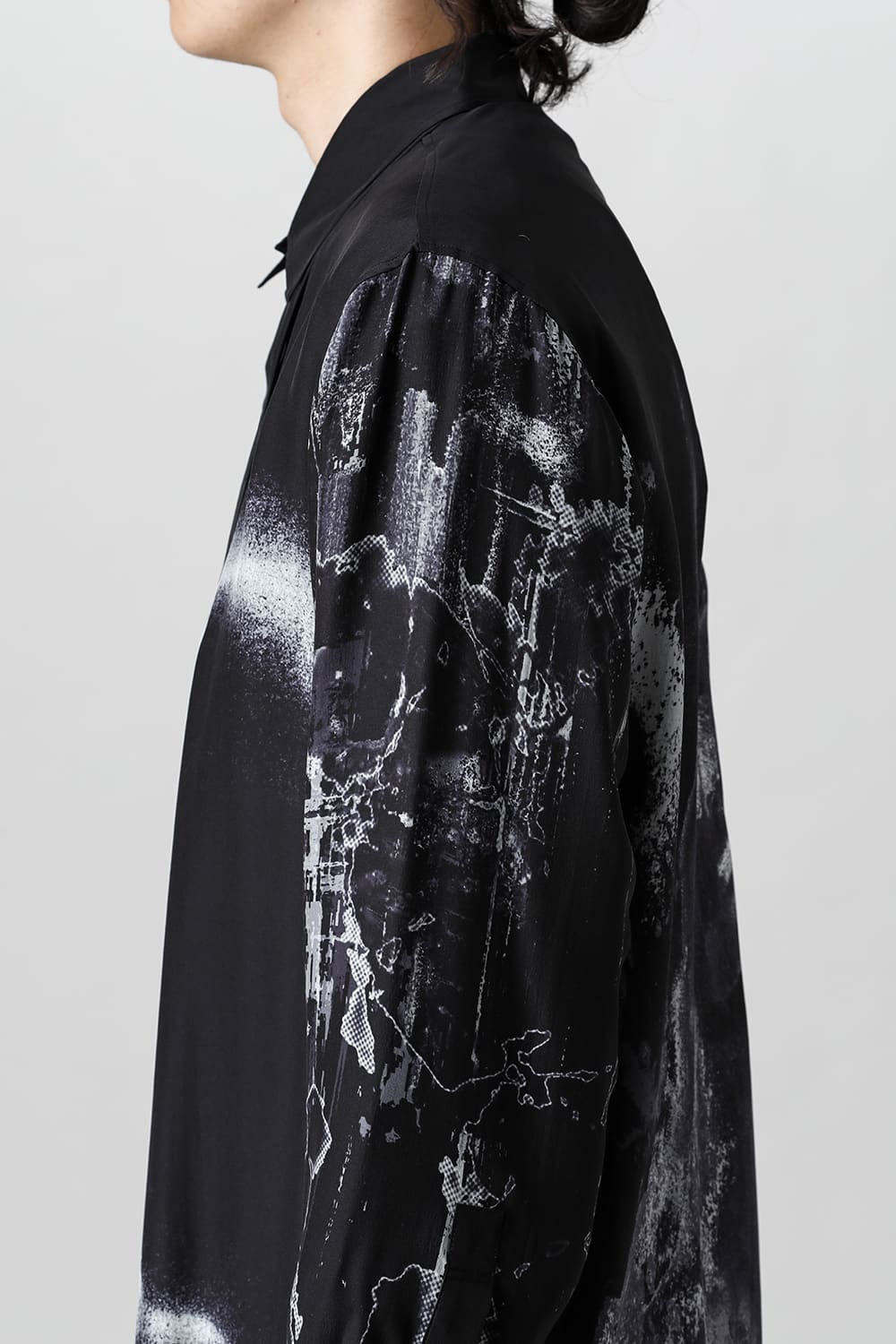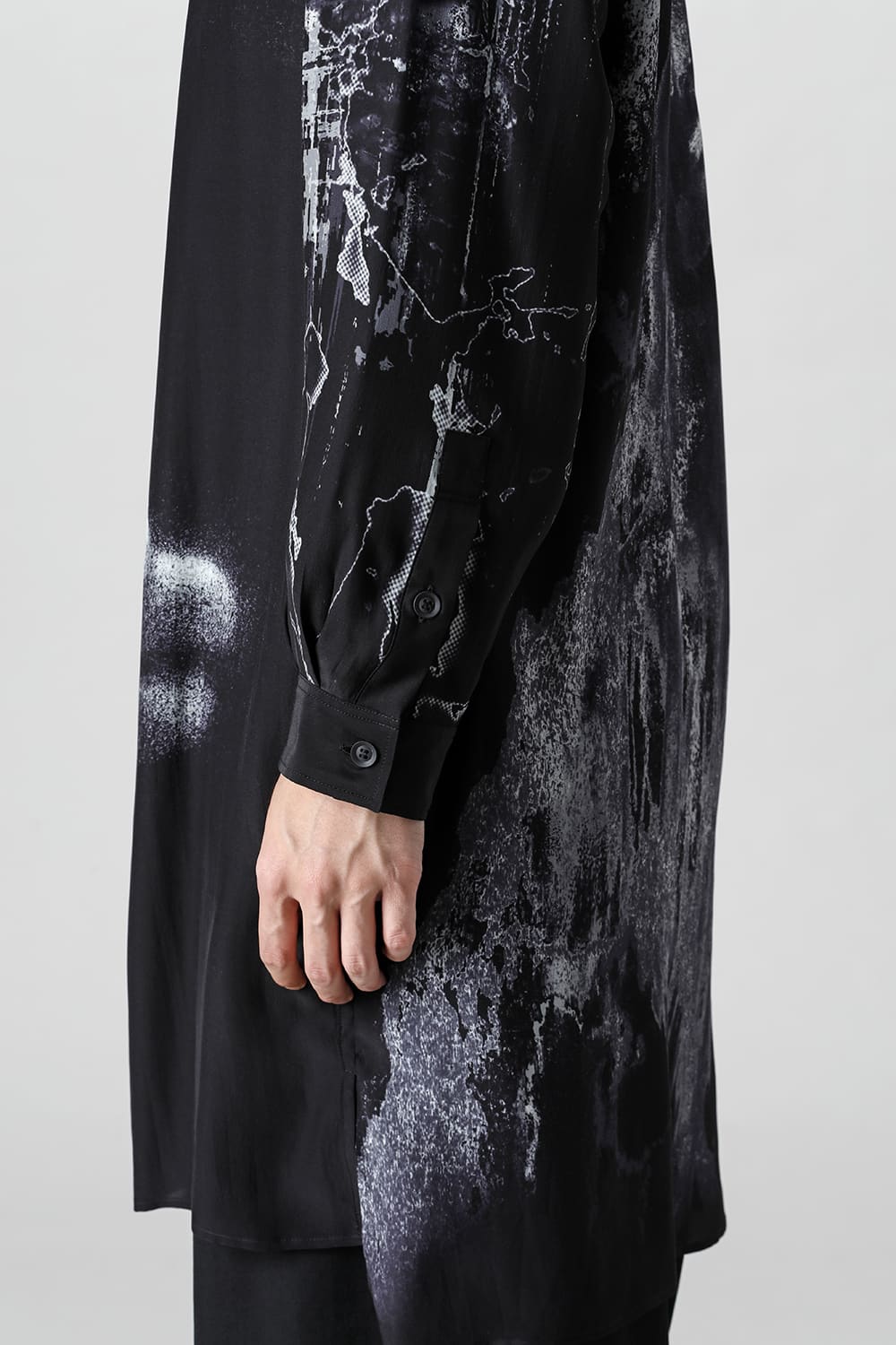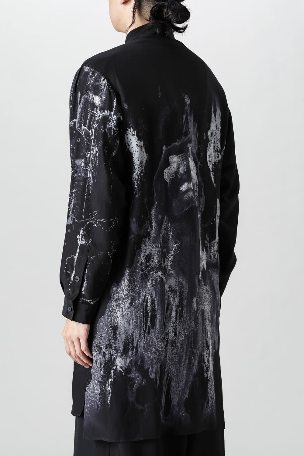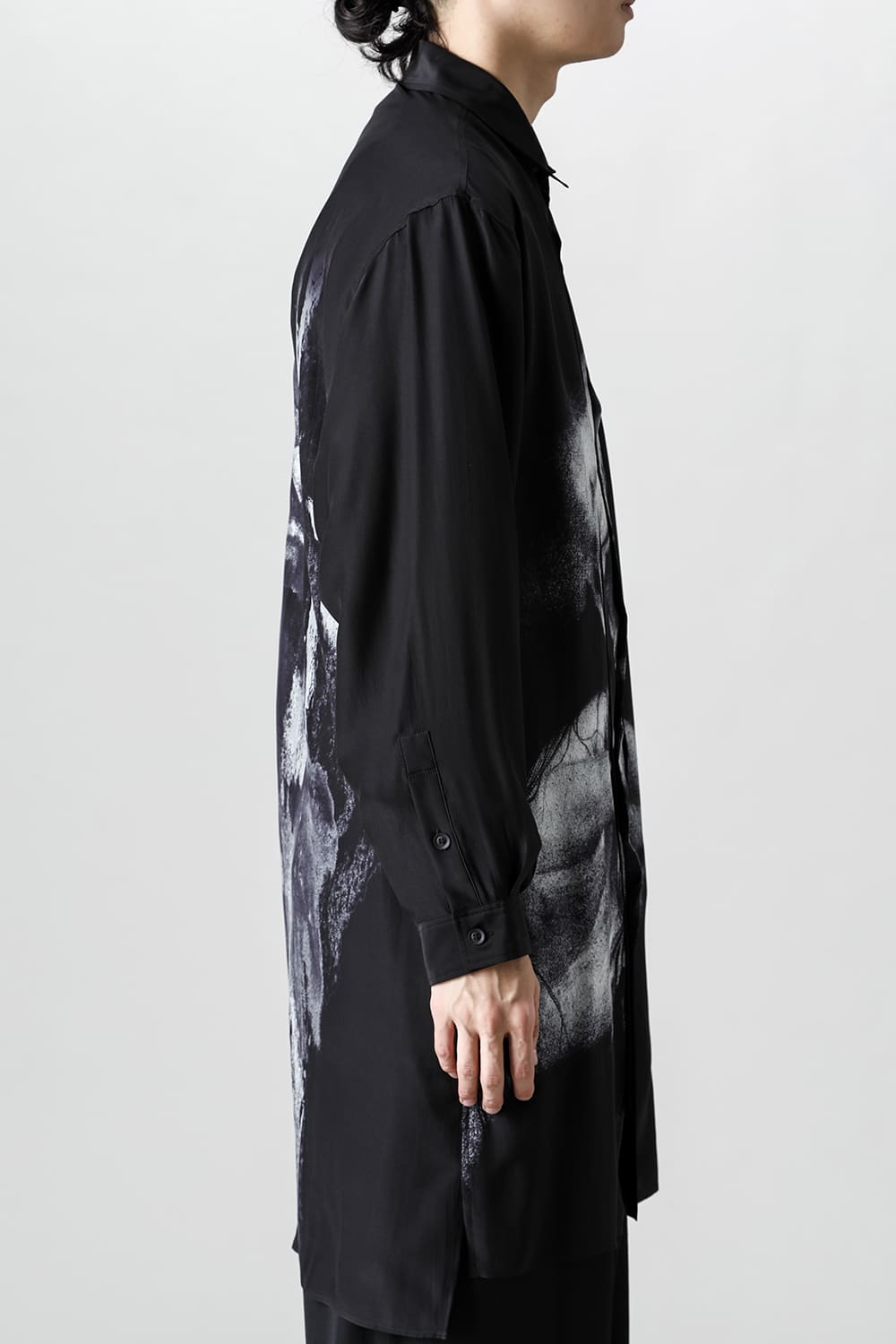 アーティストの"ジェームス・ジーン"とのコラボレーションアイテムです。 プリントの特性を活かし、シルクデシン生地の裏面からプリントを施す事で、色味の濃淡を生み出し、まるで絵が滲み出てくるような独特のタッチを表現しています。