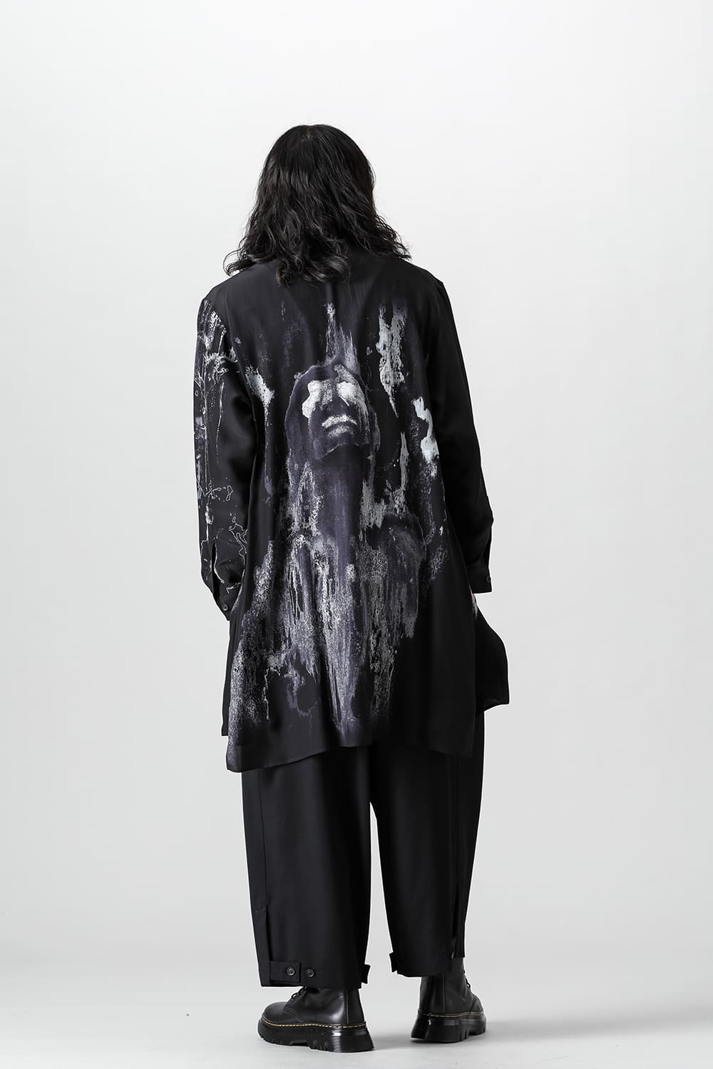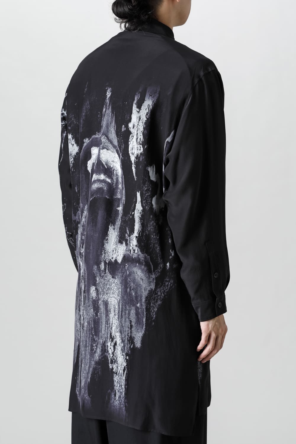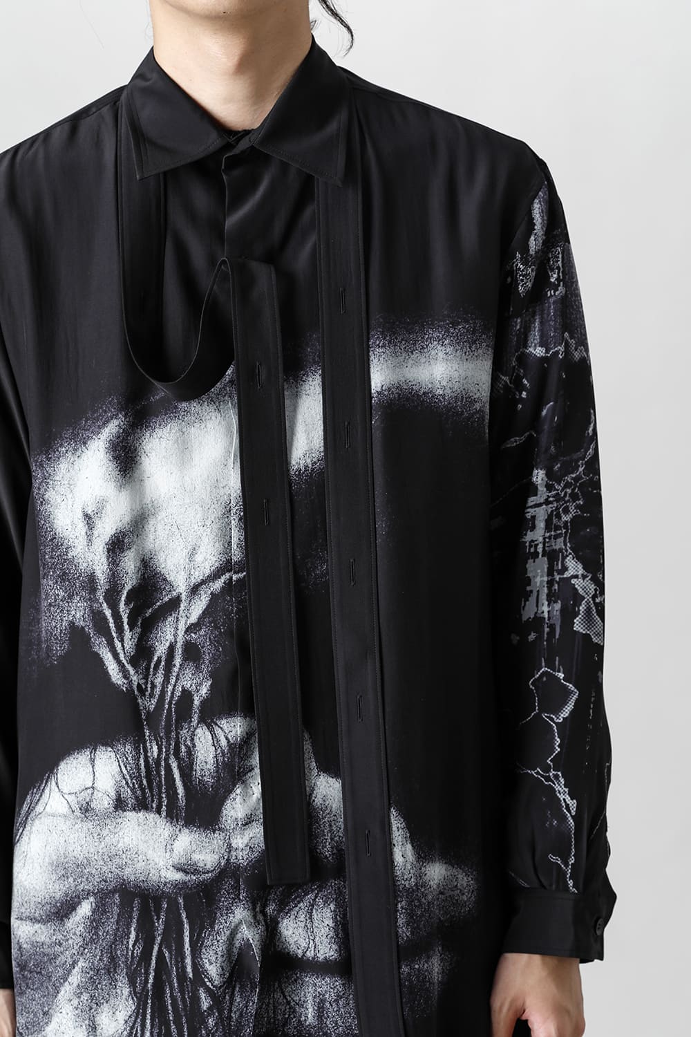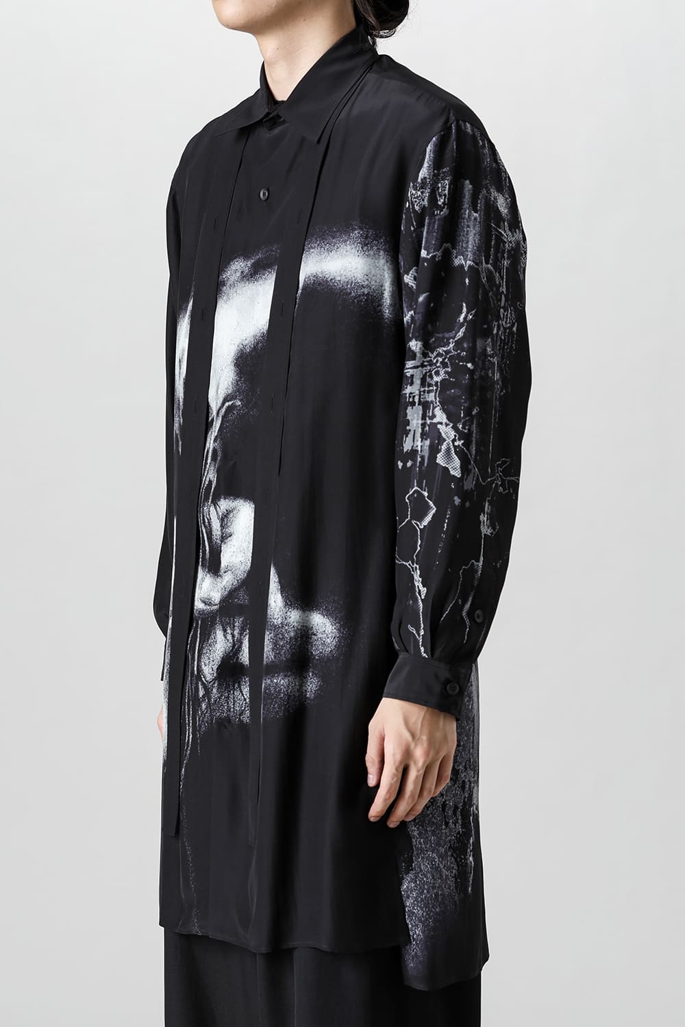 アーティストの"ジェームス・ジーン"とのコラボレーションアイテムです。 プリントの特性を活かし、シルクデシン生地の裏面からプリントを施す事で、色味の濃淡を生み出し、まるで絵が滲み出てくるような独特のタッチを表現しています。