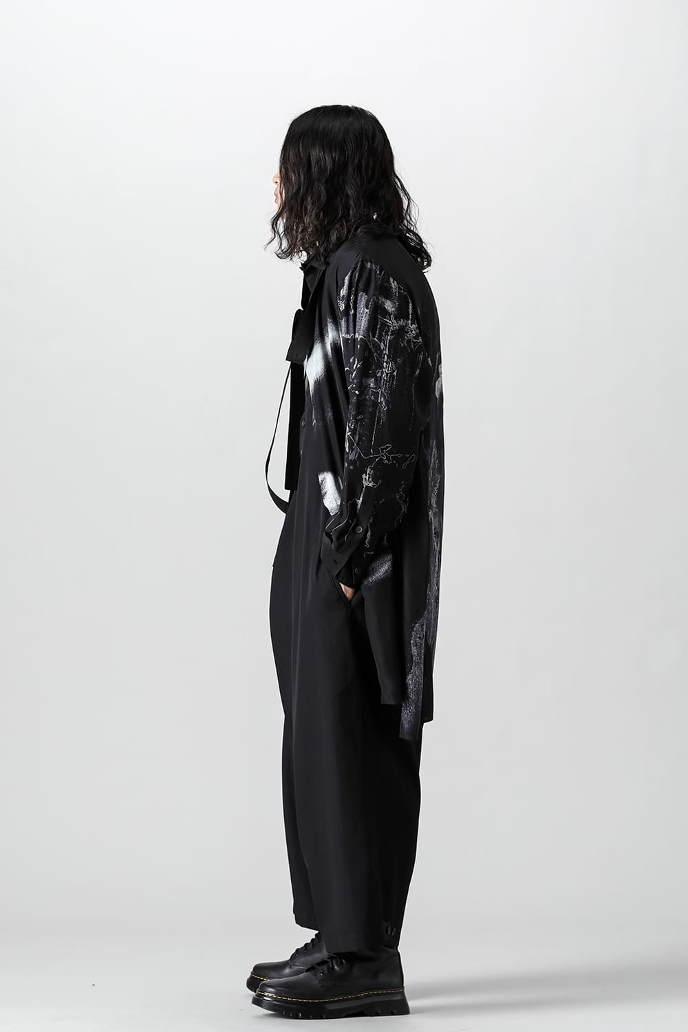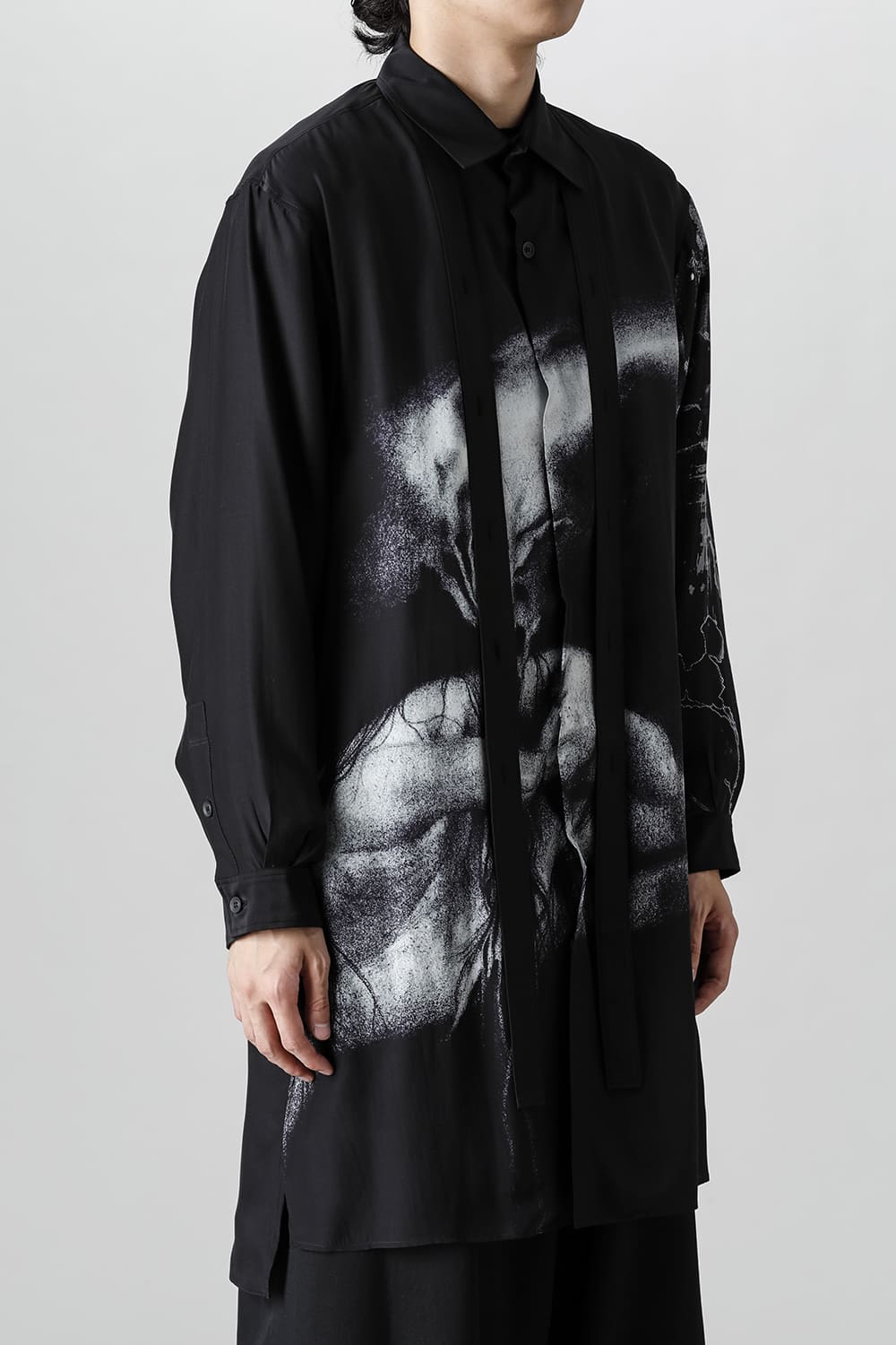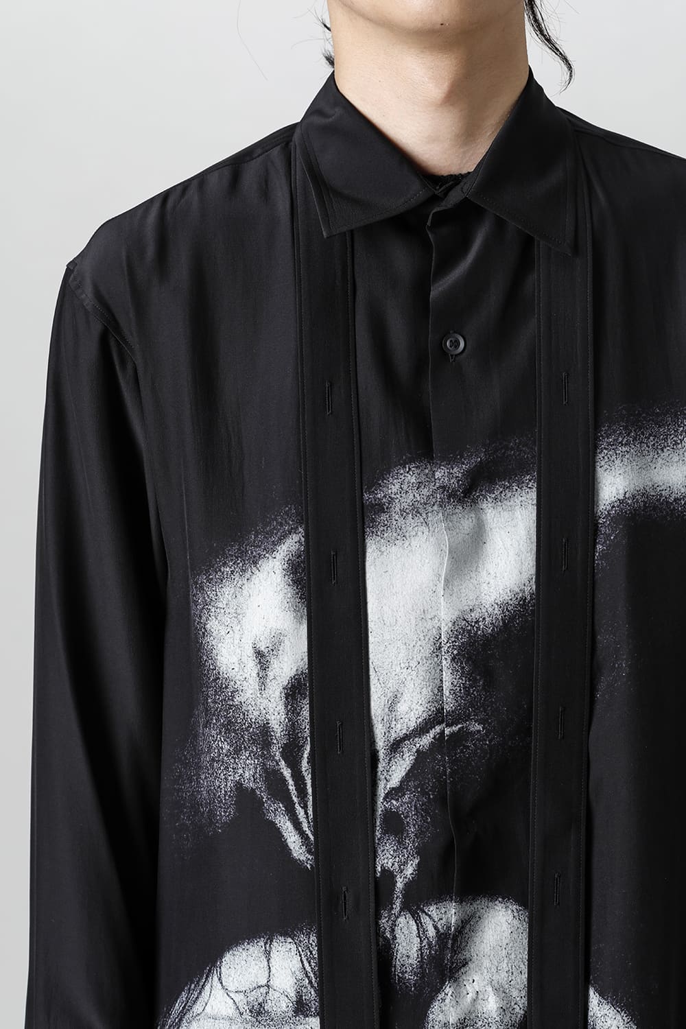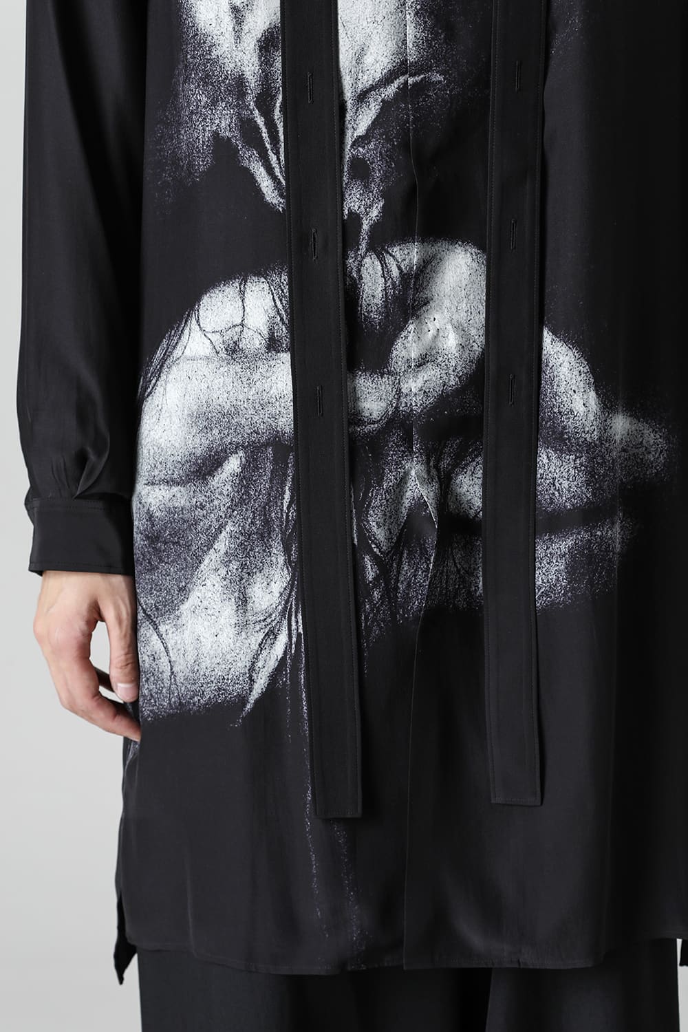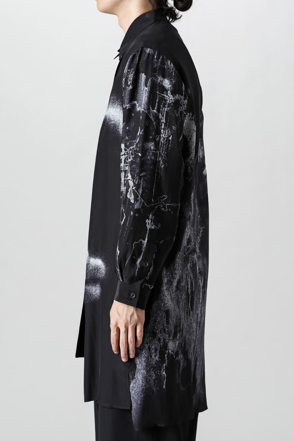 アーティストの"ジェームス・ジーン"とのコラボレーションアイテムです。 プリントの特性を活かし、シルクデシン生地の裏面からプリントを施す事で、色味の濃淡を生み出し、まるで絵が滲み出てくるような独特のタッチを表現しています。