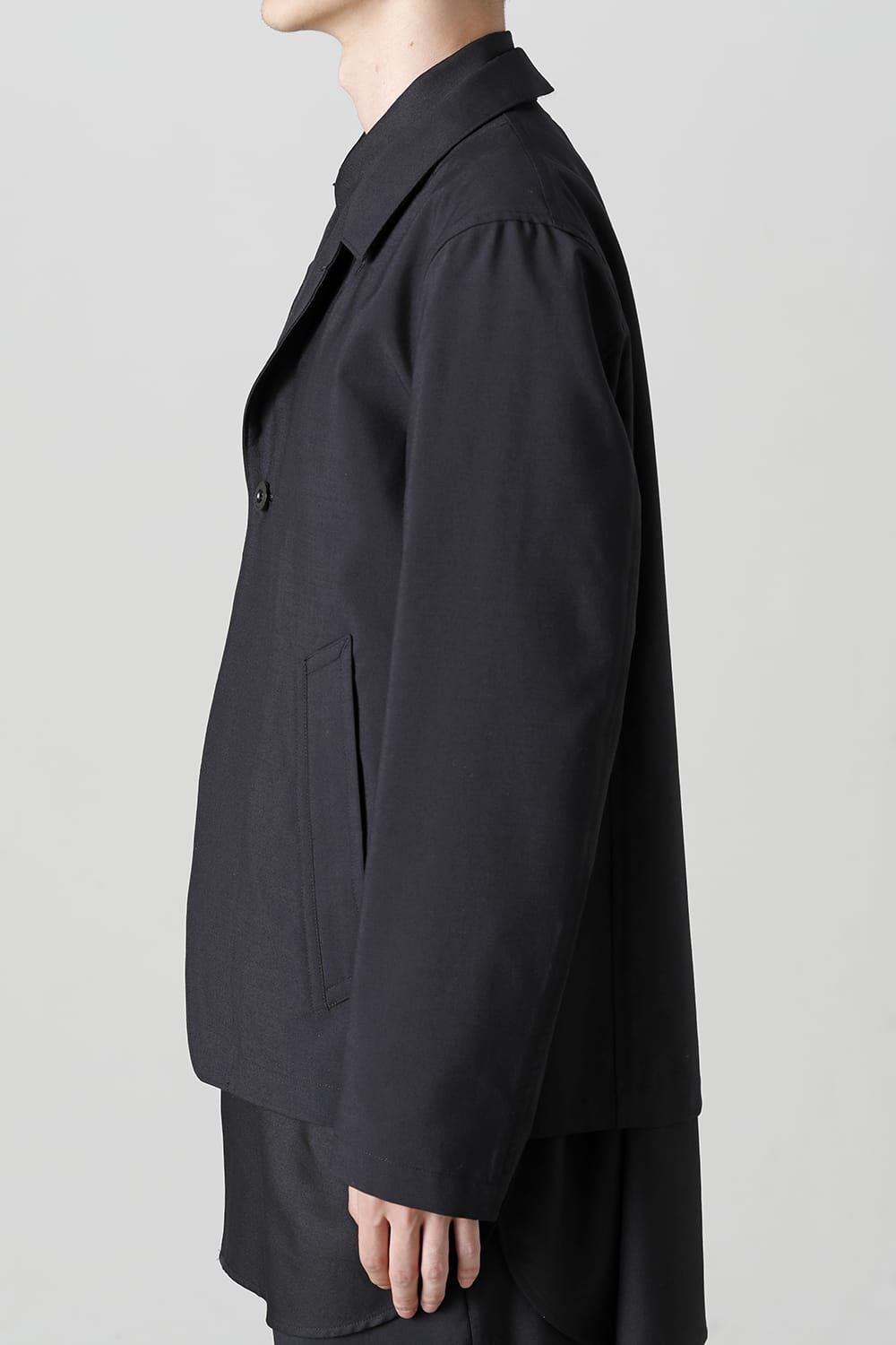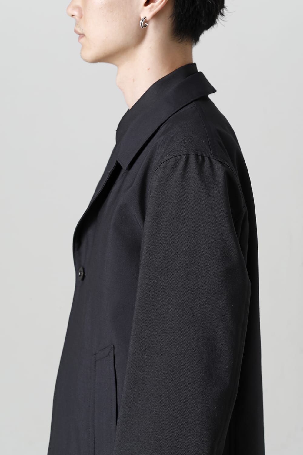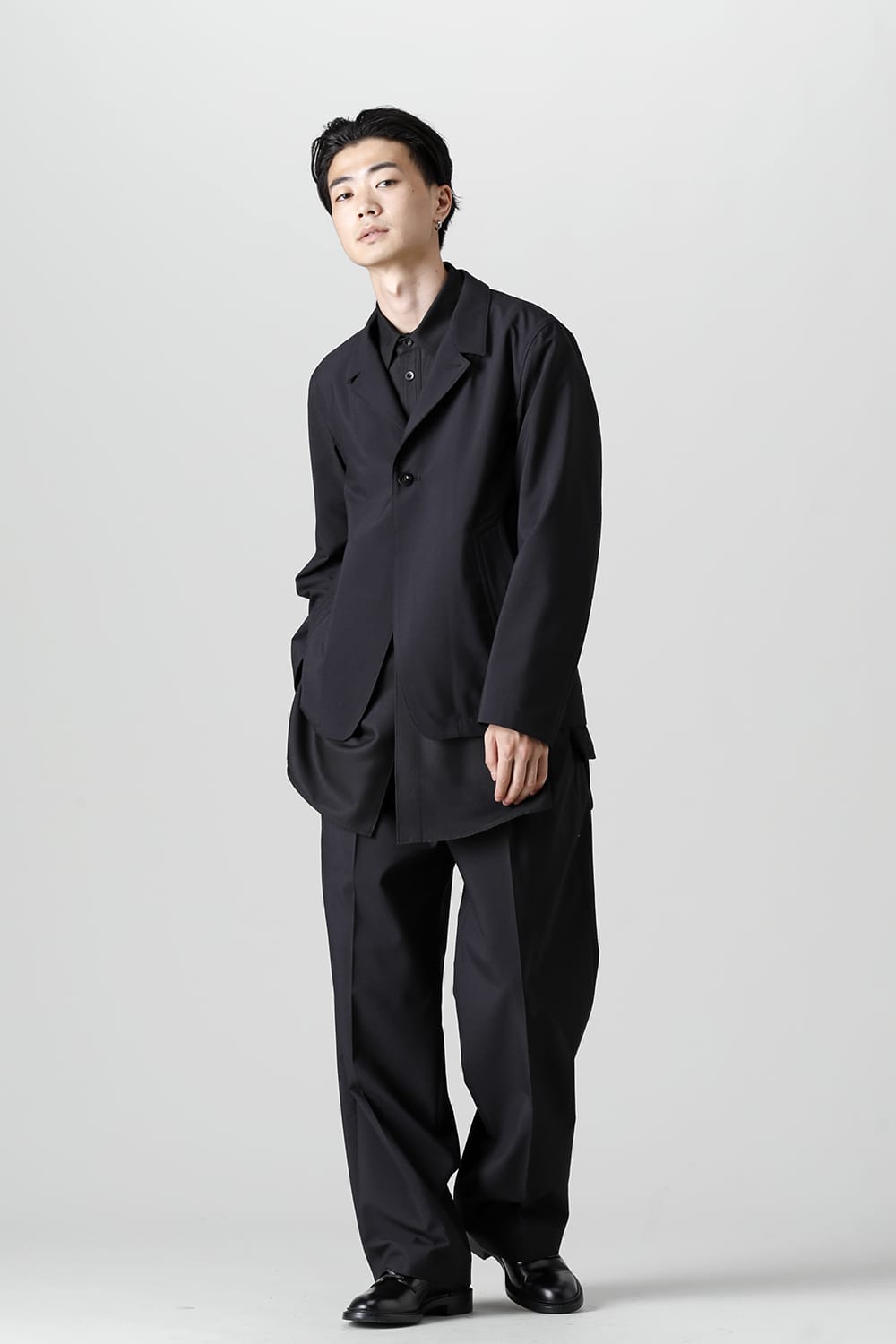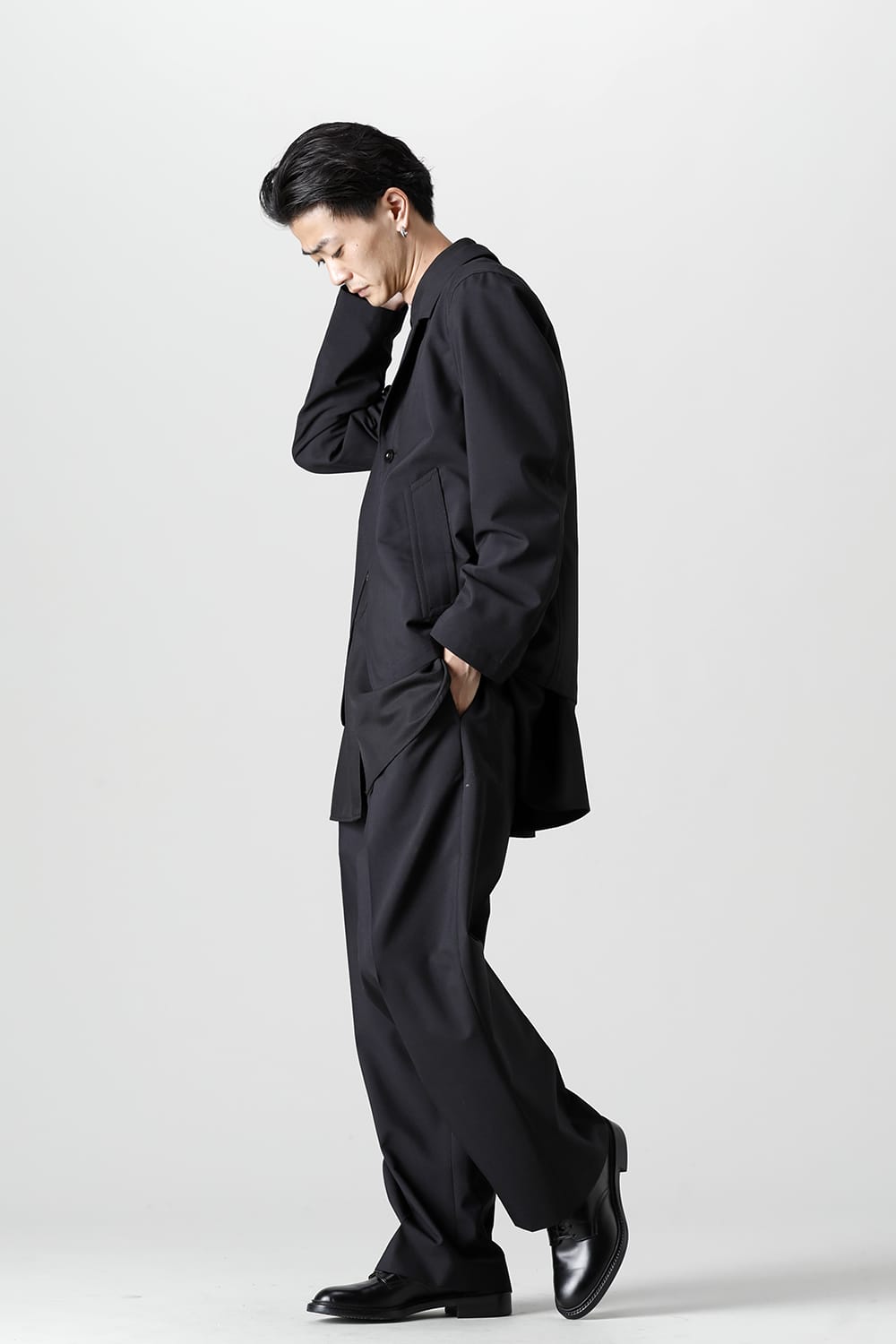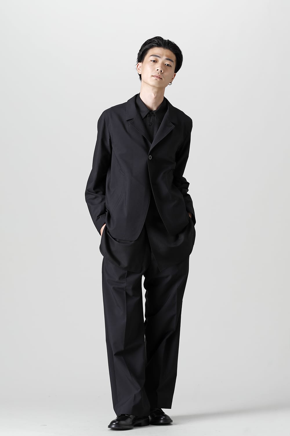 *生地は尾州産地にて、ウールポリエステルの混紡糸で、タテ糸にTOP糸を使用したシャンブレーの平織となっており、ブラックは奥行きのある色味になっています。ウールポリエステル素材ならではの軽さが特徴で、シワになりにくく通年使える素材感です