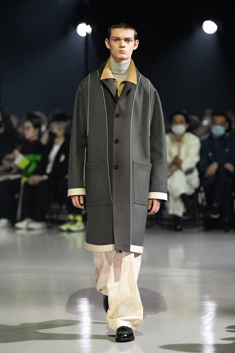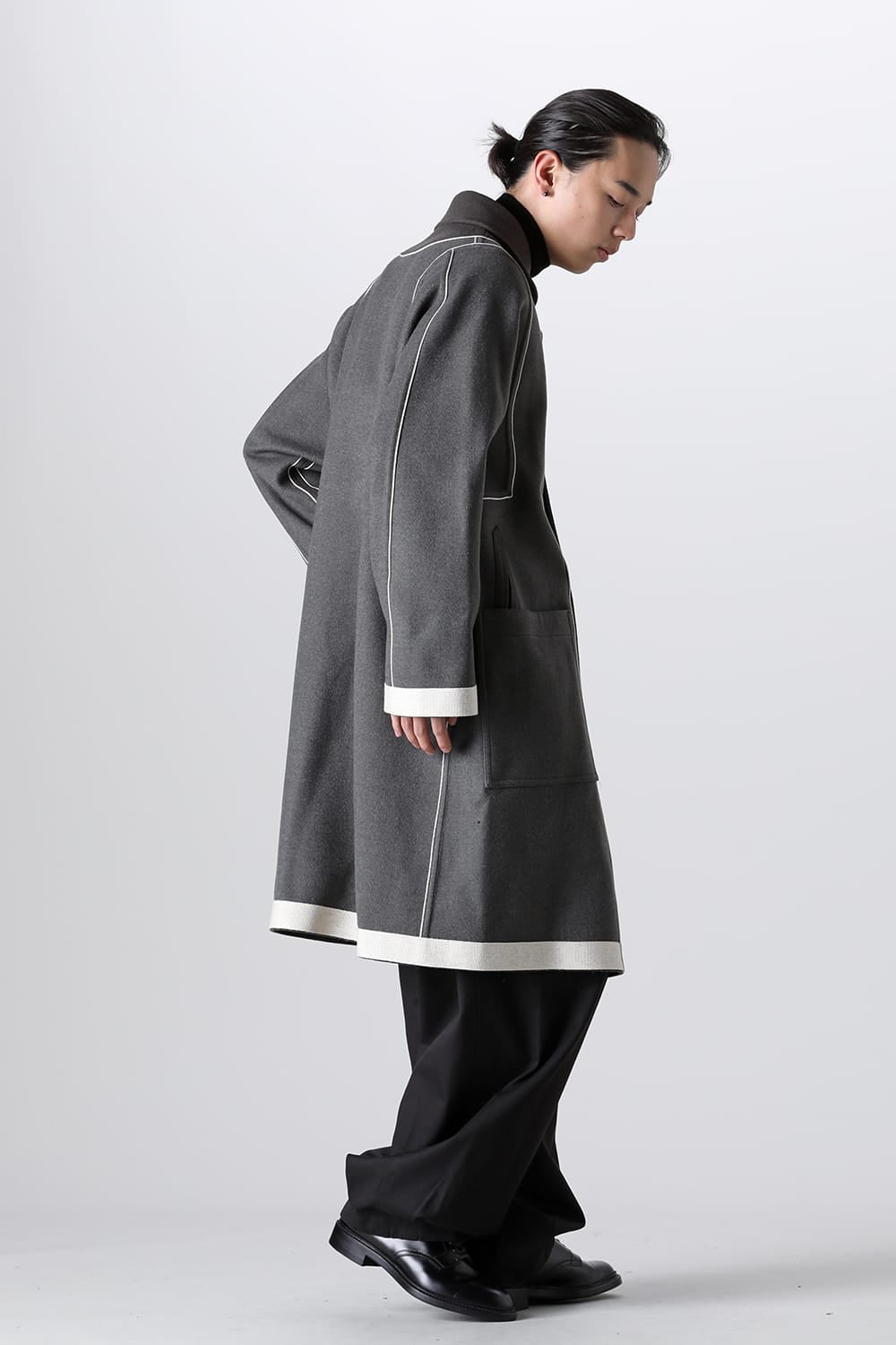 表面は生地の端を配色の撚糸コードで始末することにより、繊細なラインとリネンテープのアクセントが効いたデザインで、裏面は生地の一色で構成されているので、両面で異なった見え方の着用が可能です(この端始末は世界でも数少ない工場でしかできない仕様です)。