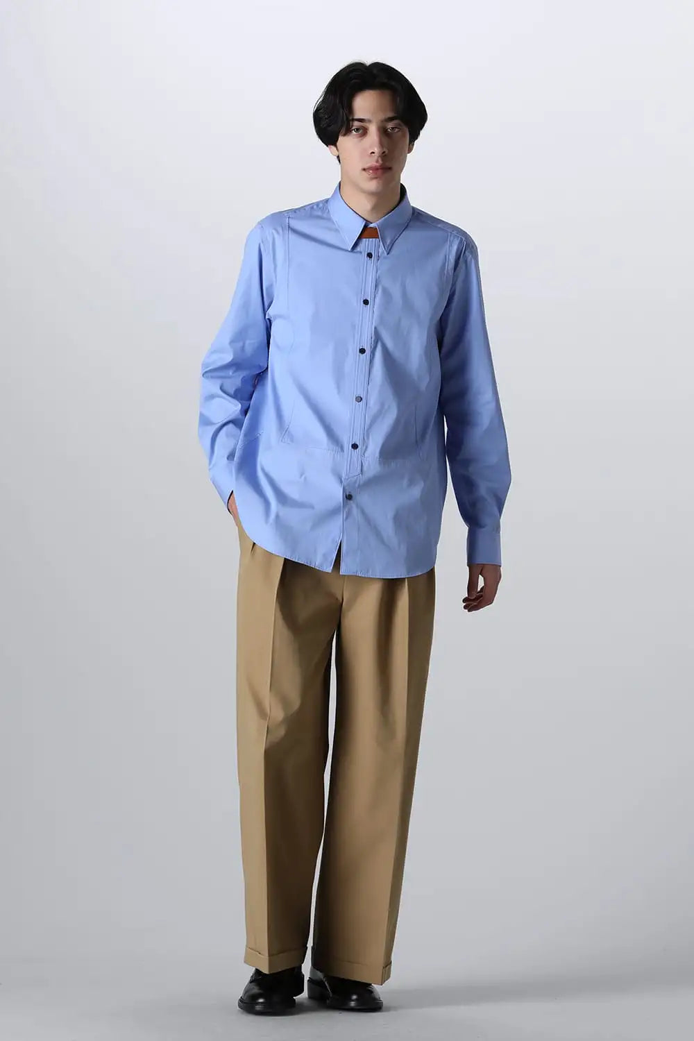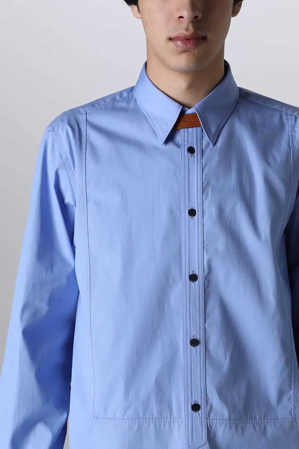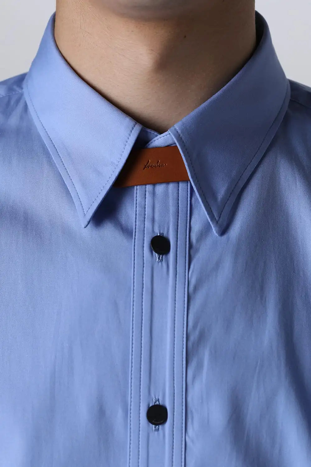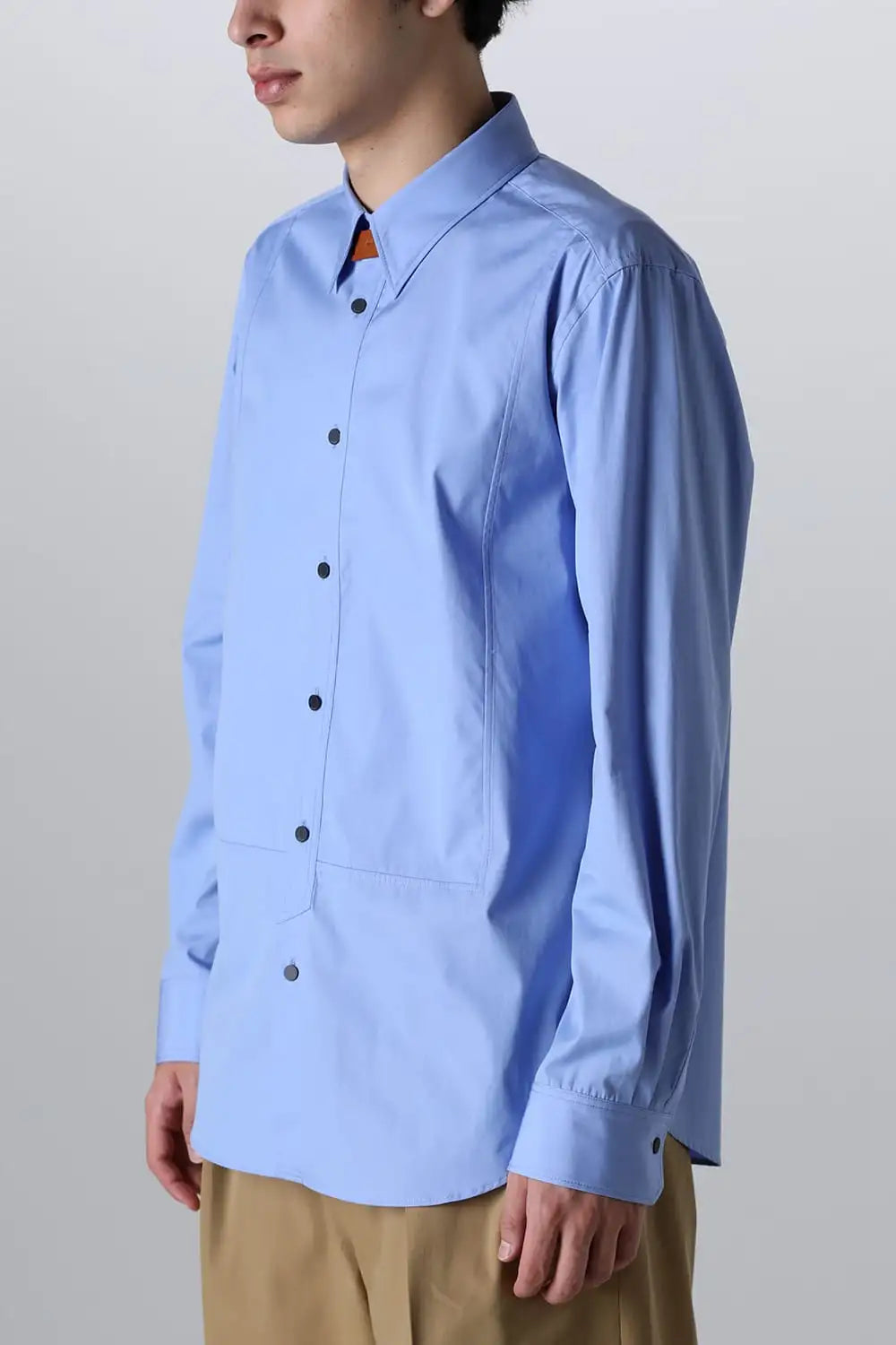 身頃はジャケットの中にも着用できるサイズ感で、ドレスシャツの様な前ヨーク切り替えが特徴で、衿元にはアクセントになる本革の取り外し可能な衿タブを配置しています