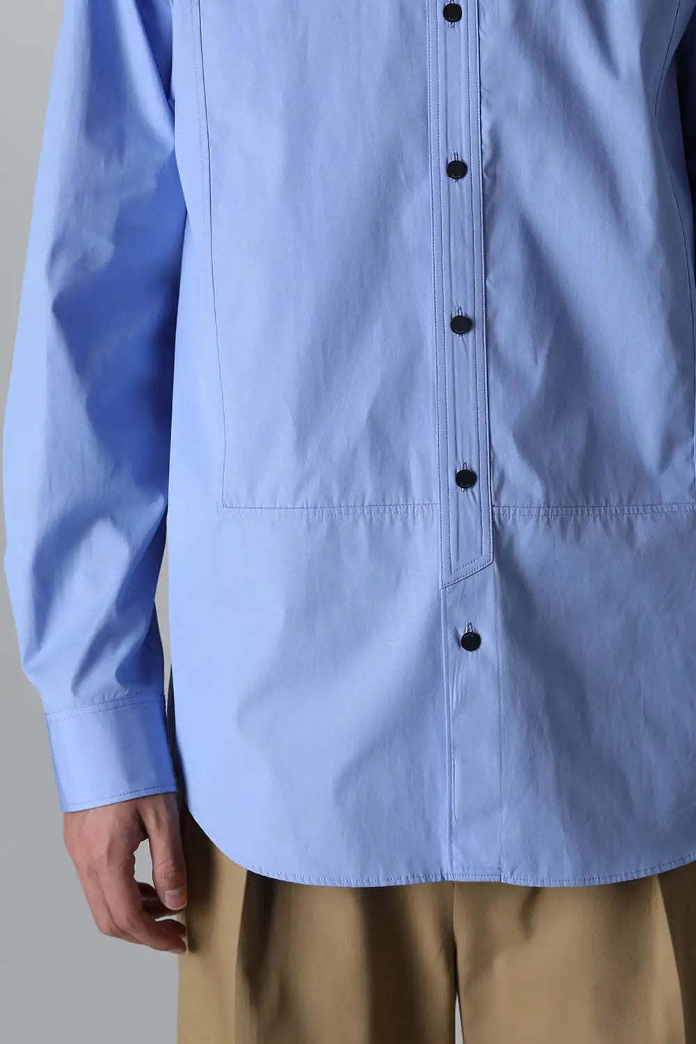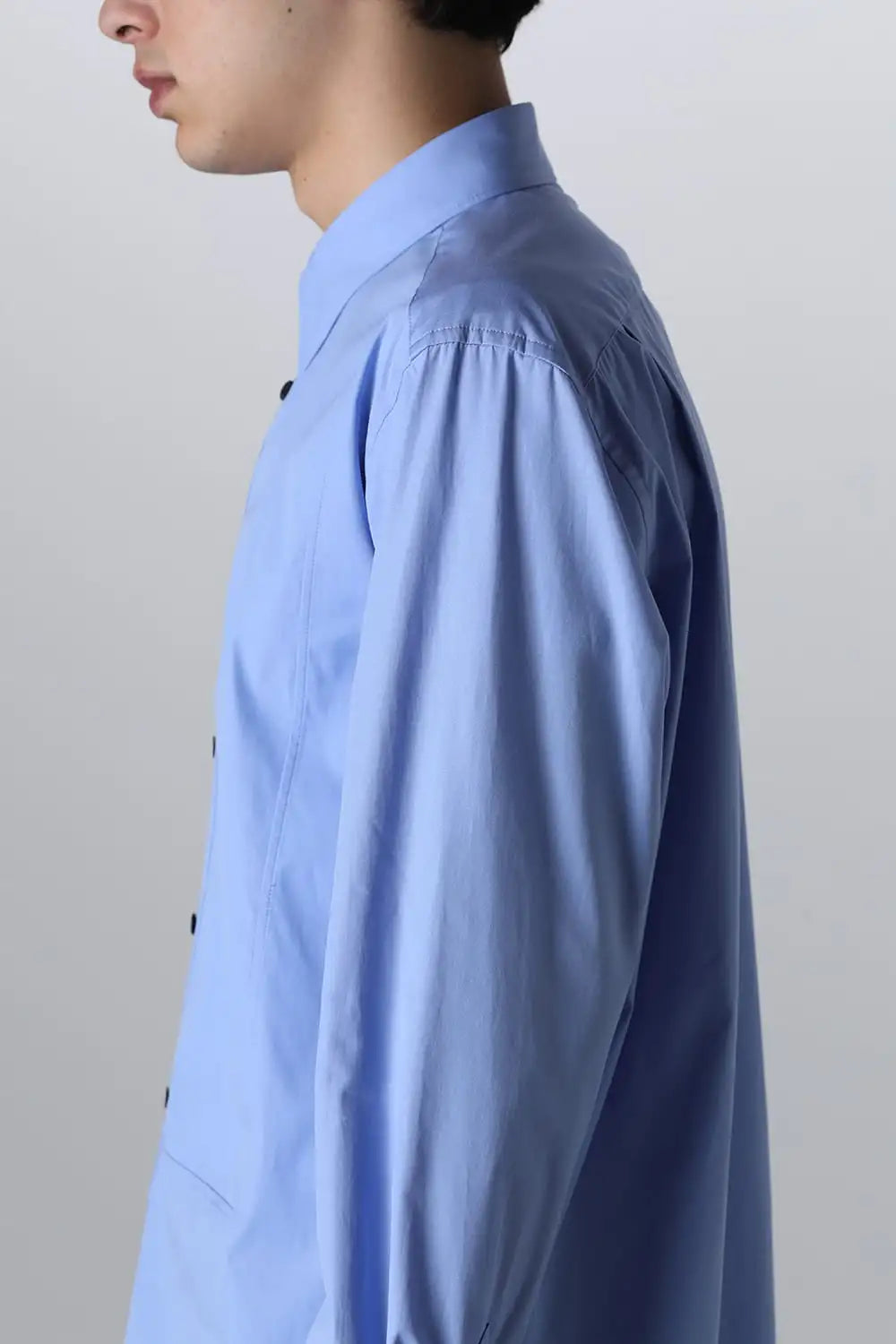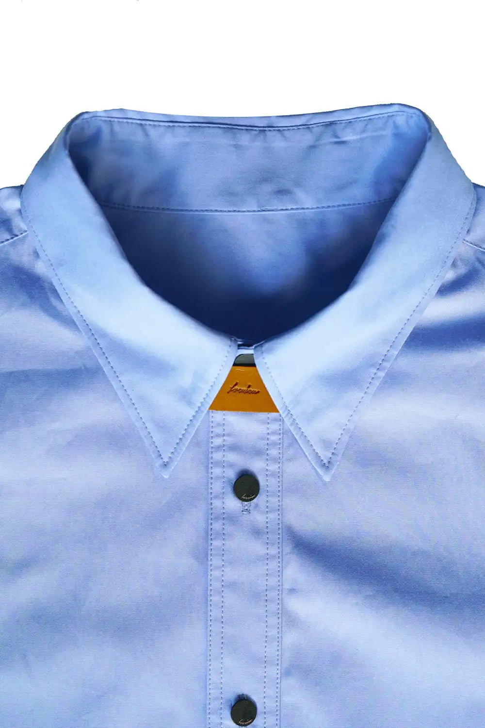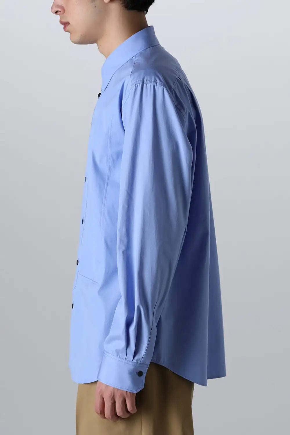 身頃はジャケットの中にも着用できるサイズ感で、ドレスシャツの様な前ヨーク切り替えが特徴で、衿元にはアクセントになる本革の取り外し可能な衿タブを配置しています