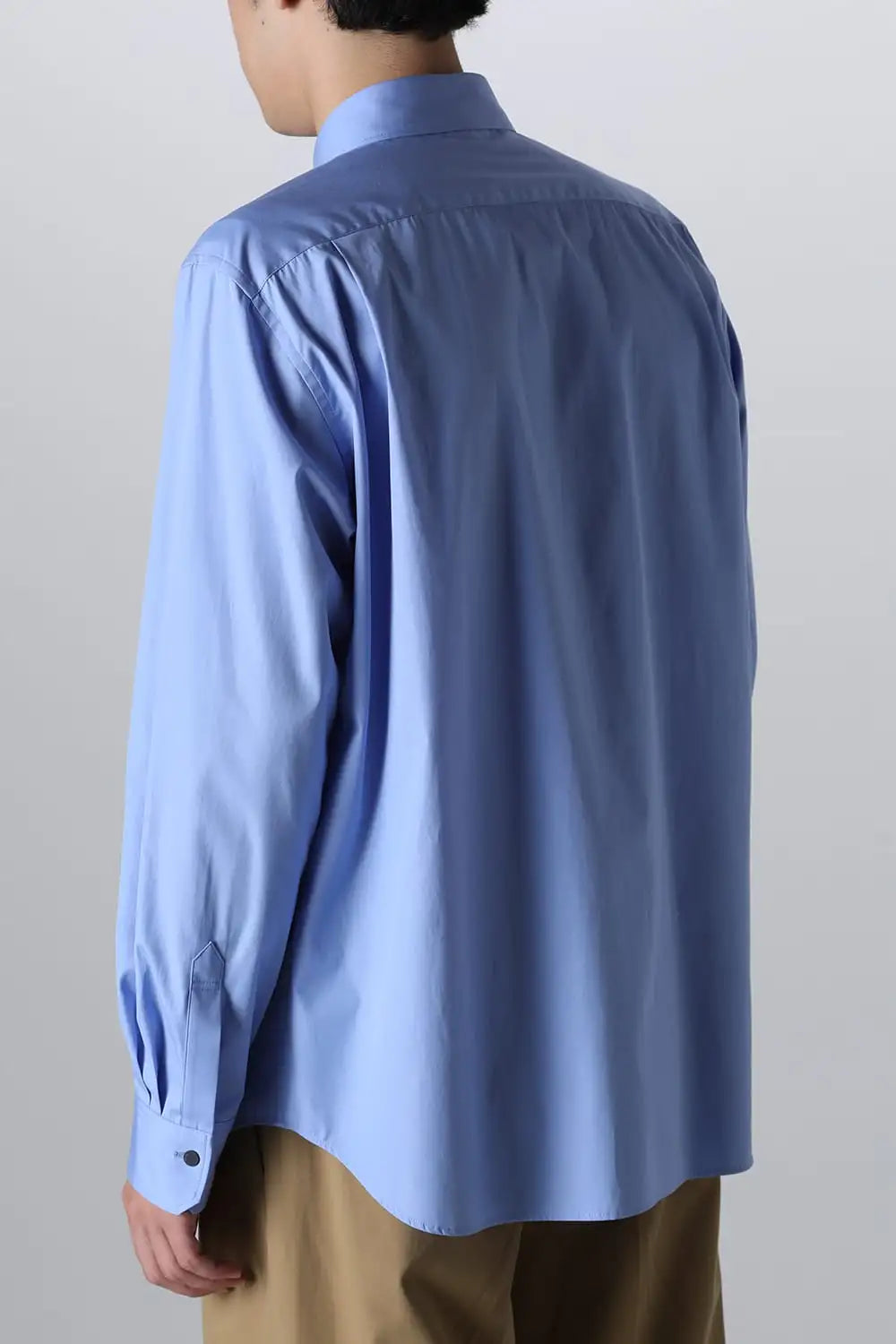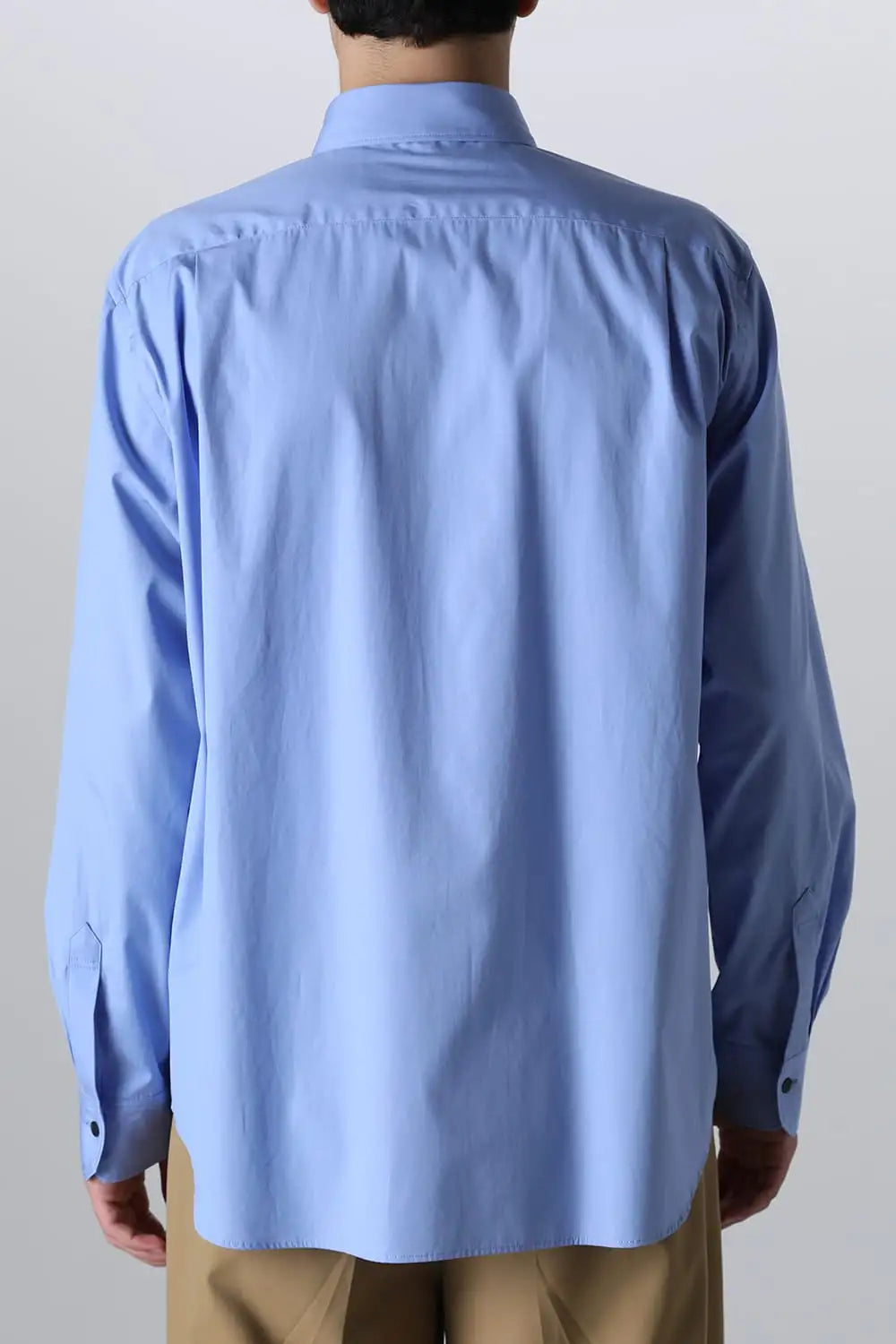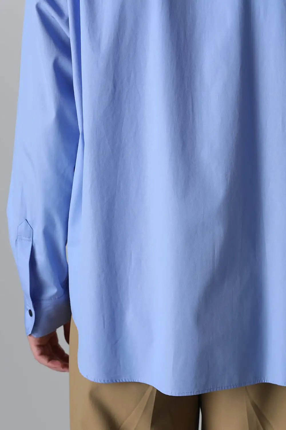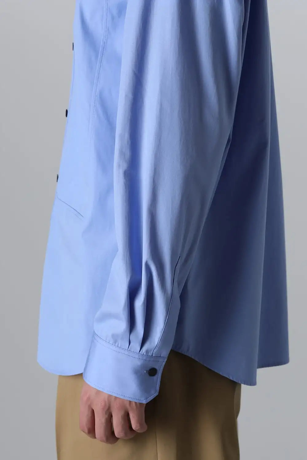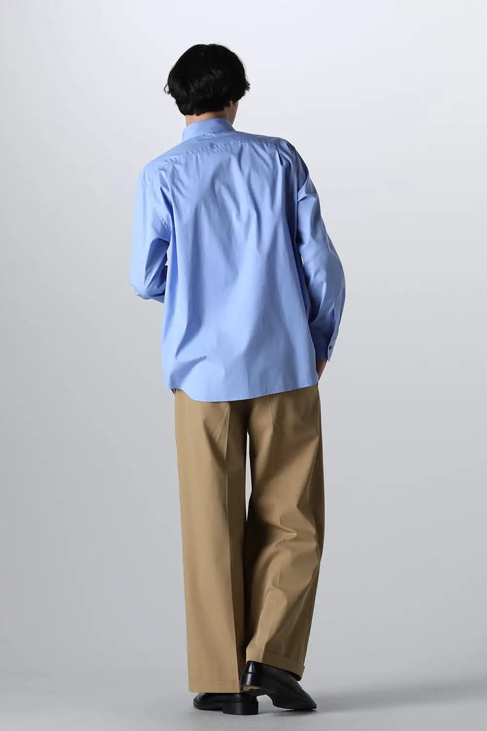 身頃はジャケットの中にも着用できるサイズ感で、ドレスシャツの様な前ヨーク切り替えが特徴で、衿元にはアクセントになる本革の取り外し可能な衿タブを配置しています