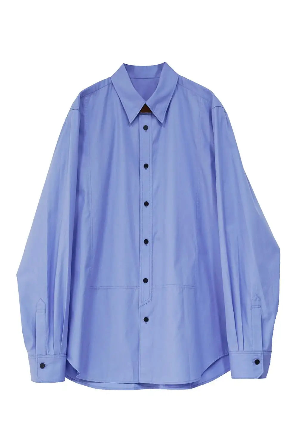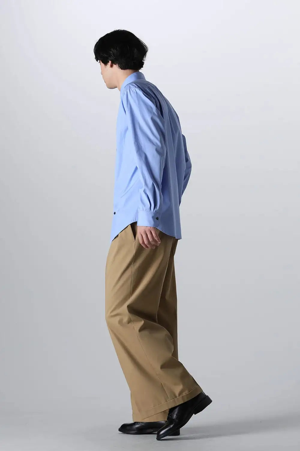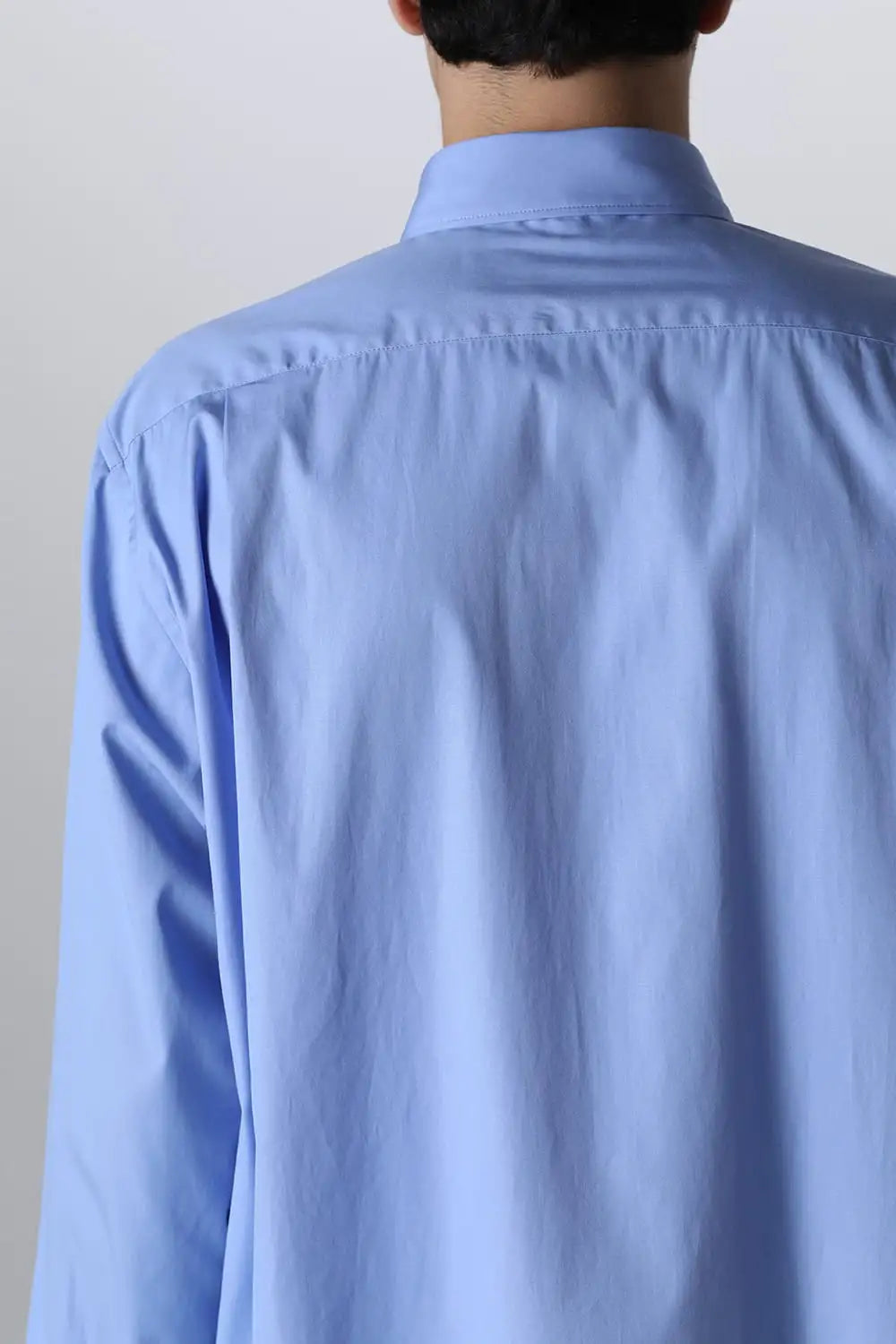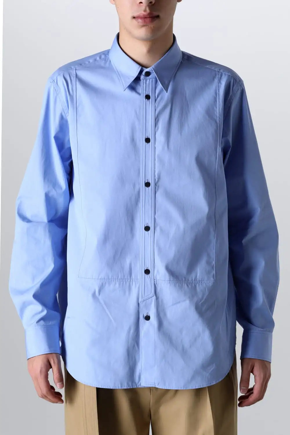身頃はジャケットの中にも着用できるサイズ感で、ドレスシャツの様な前ヨーク切り替えが特徴で、衿元にはアクセントになる本革の取り外し可能な衿タブを配置しています