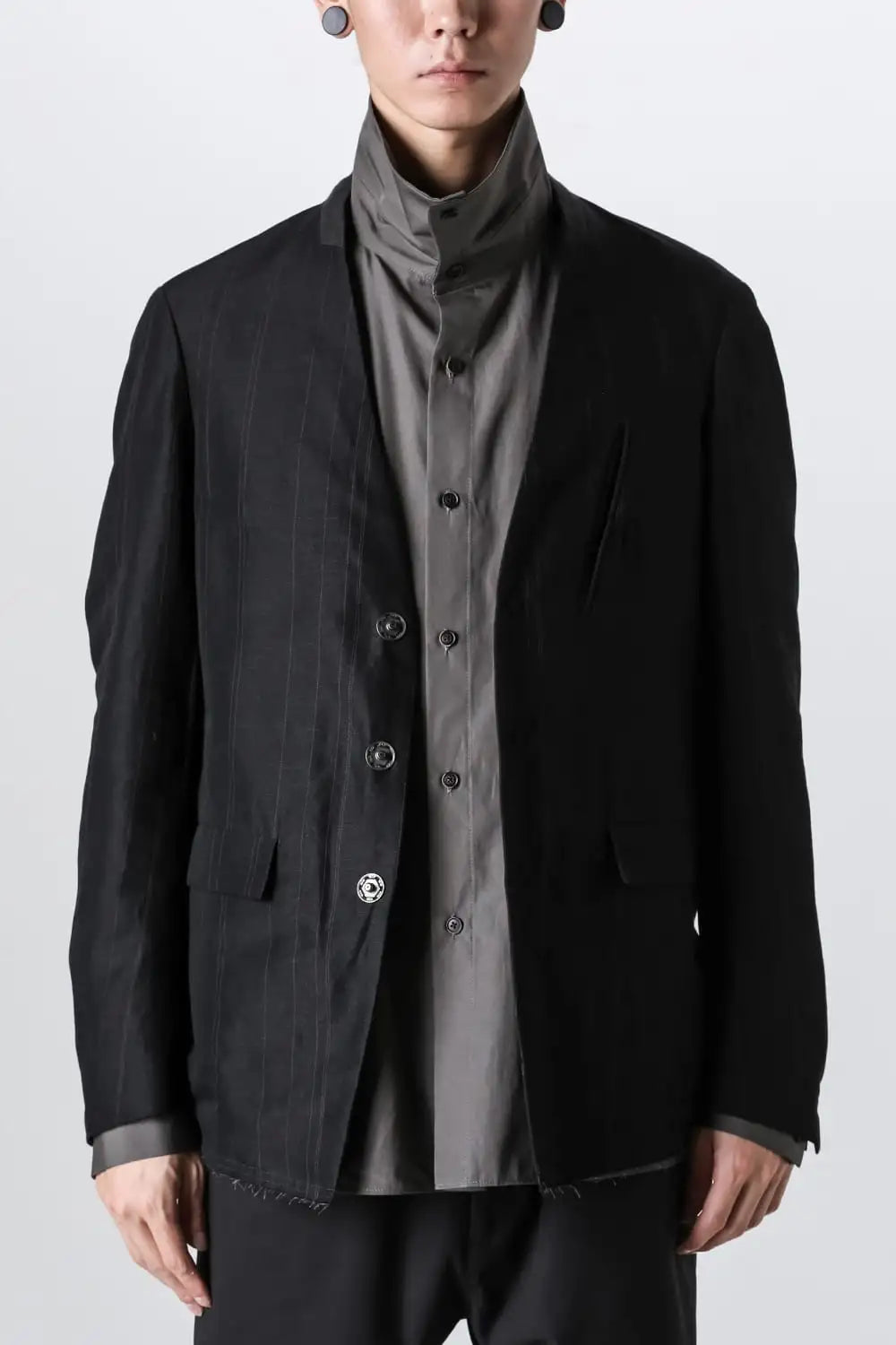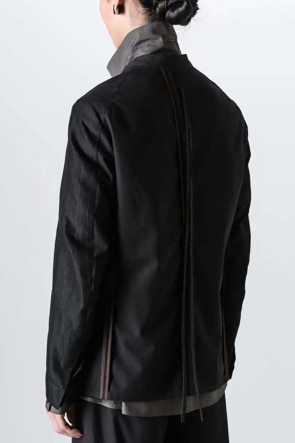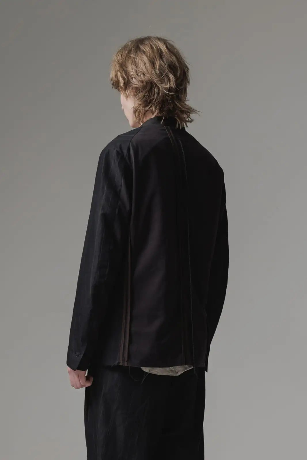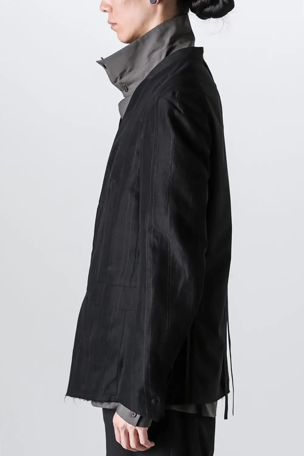 前身頃をコットンリネン、後ろ身頃と袖の一部をコットンギャバジンで切り替え、背中側の縫製面を表に出したデザインのノーカラージャケット。
