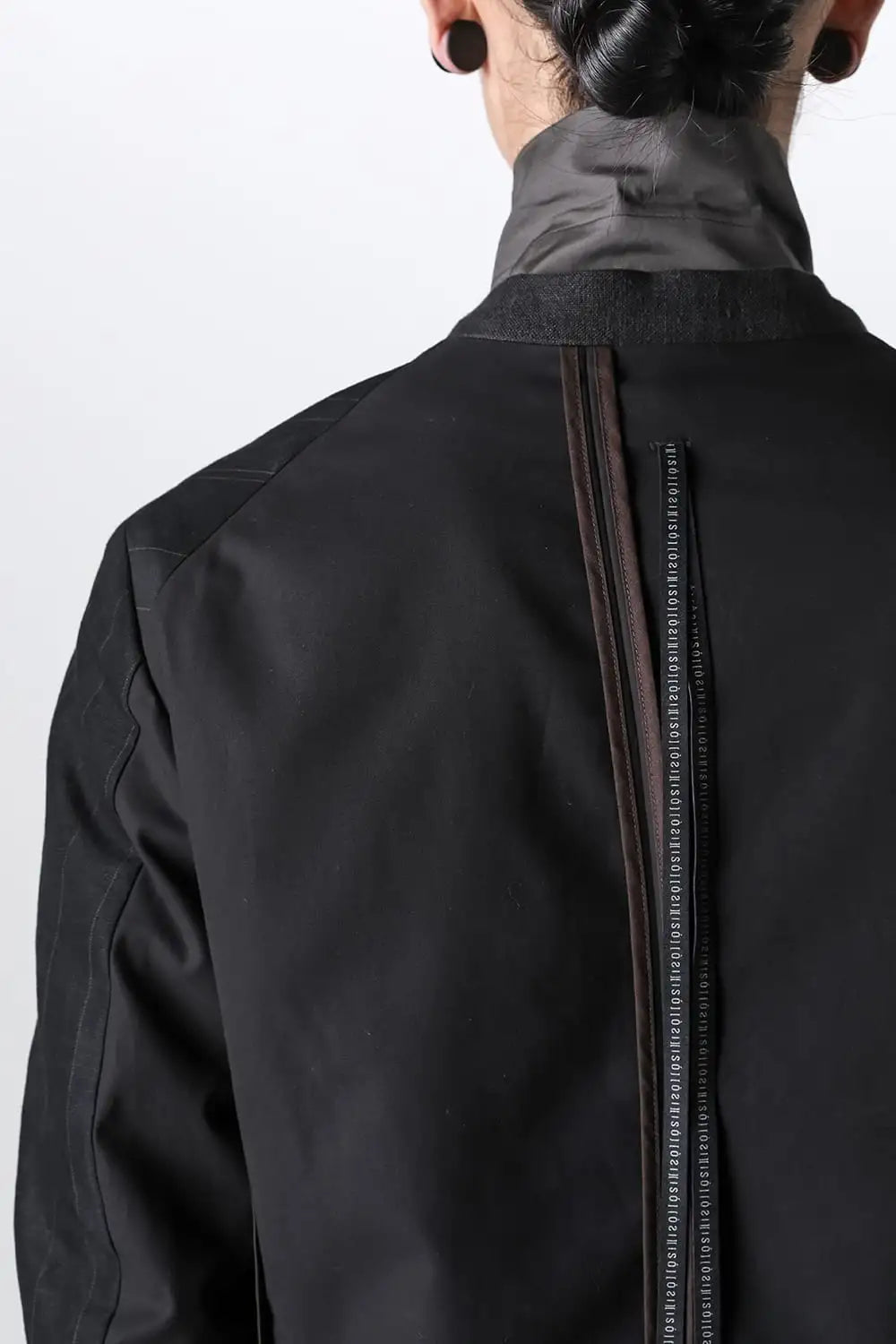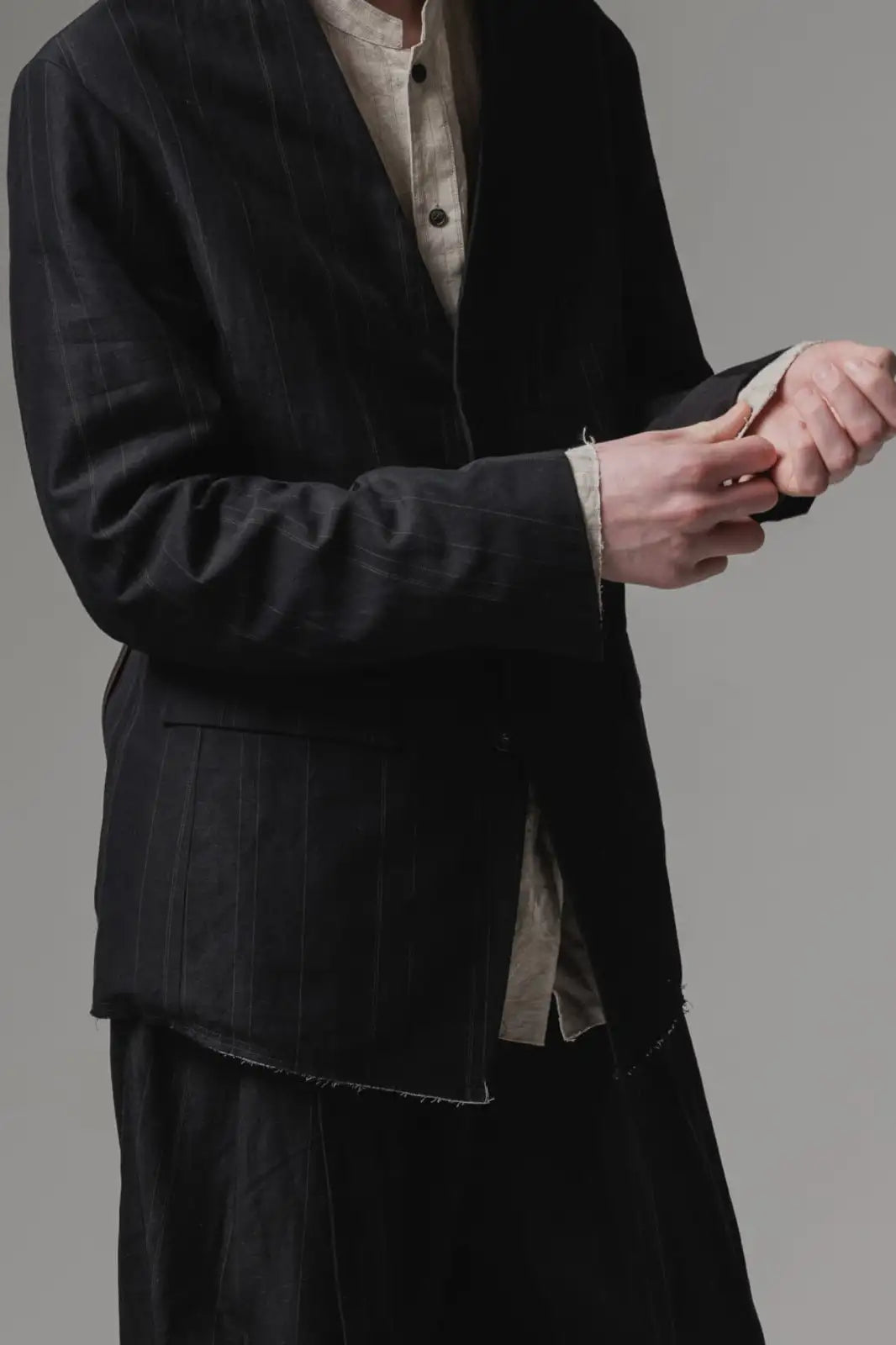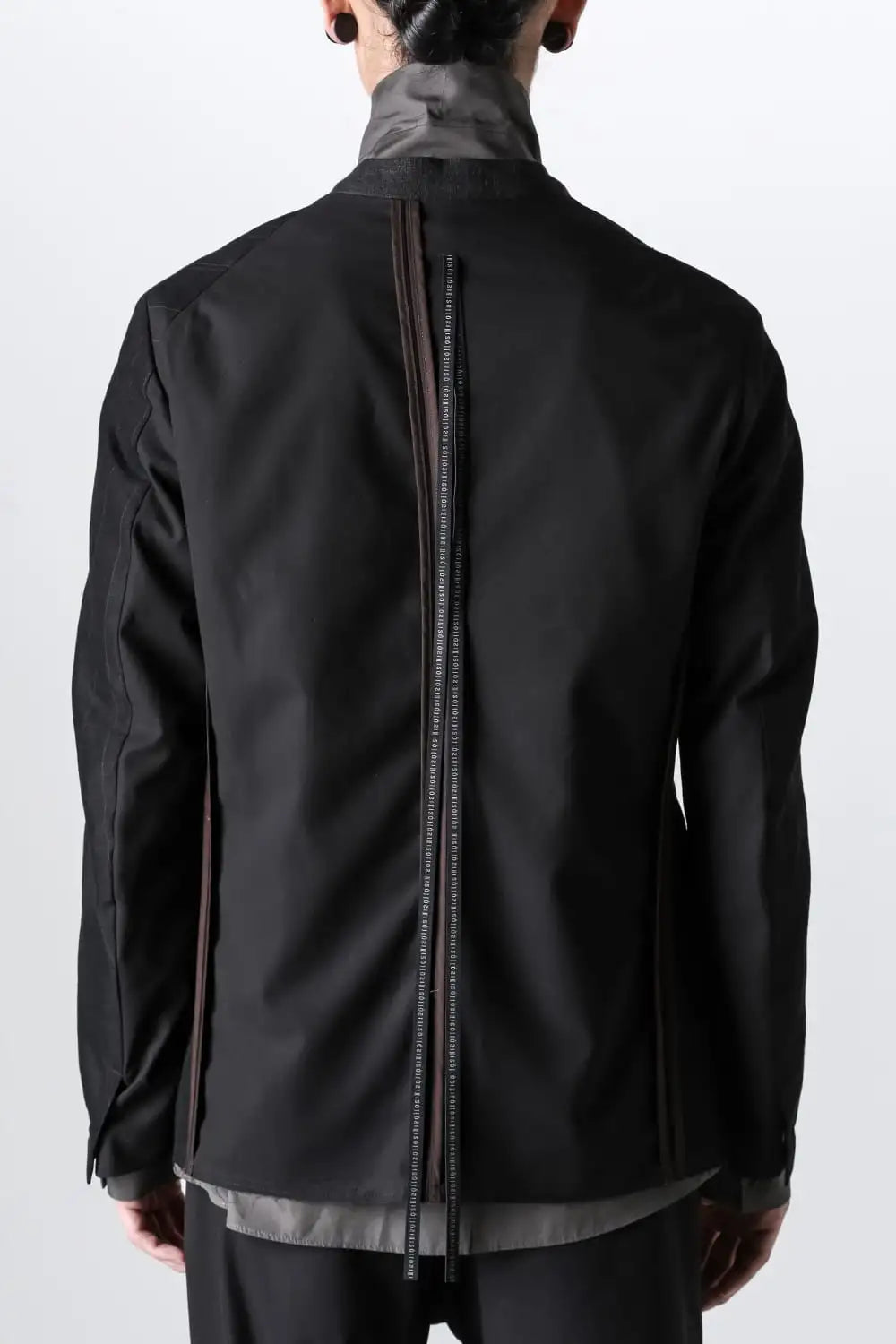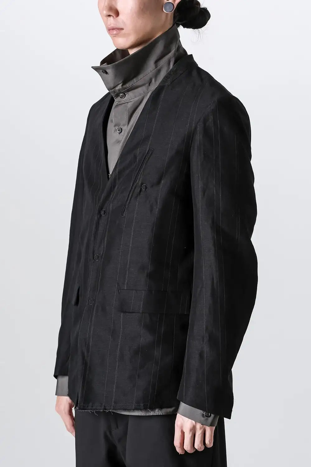 前身頃をコットンリネン、後ろ身頃と袖の一部をコットンギャバジンで切り替え、背中側の縫製面を表に出したデザインのノーカラージャケット。