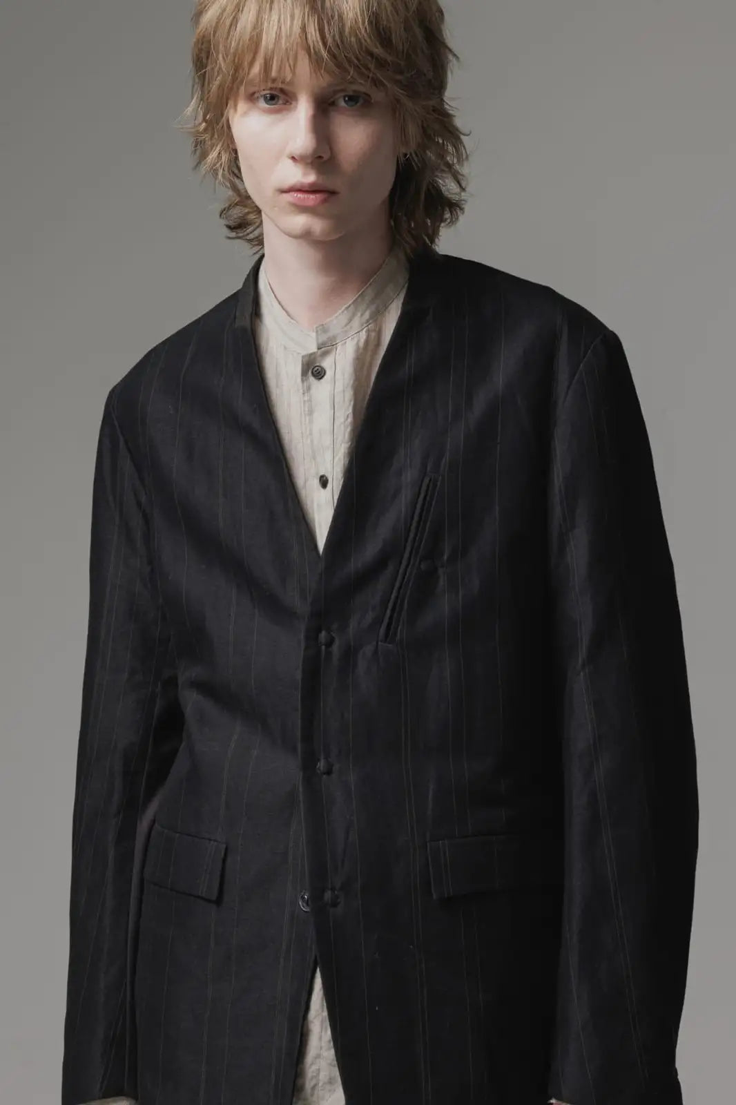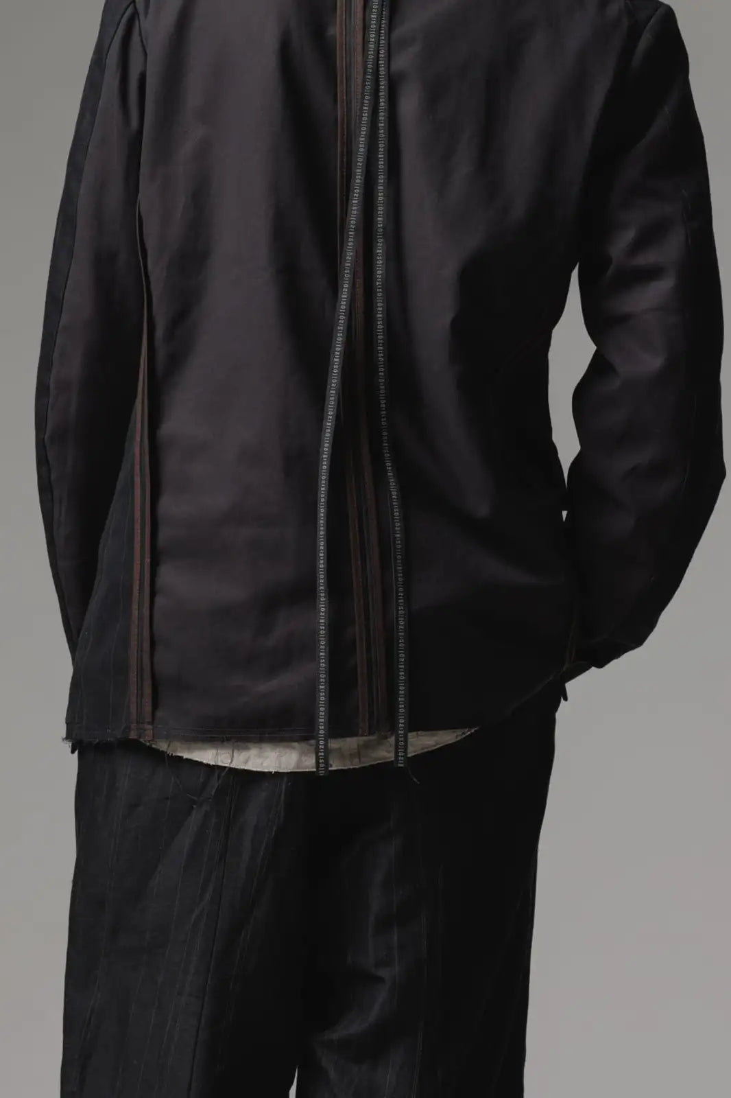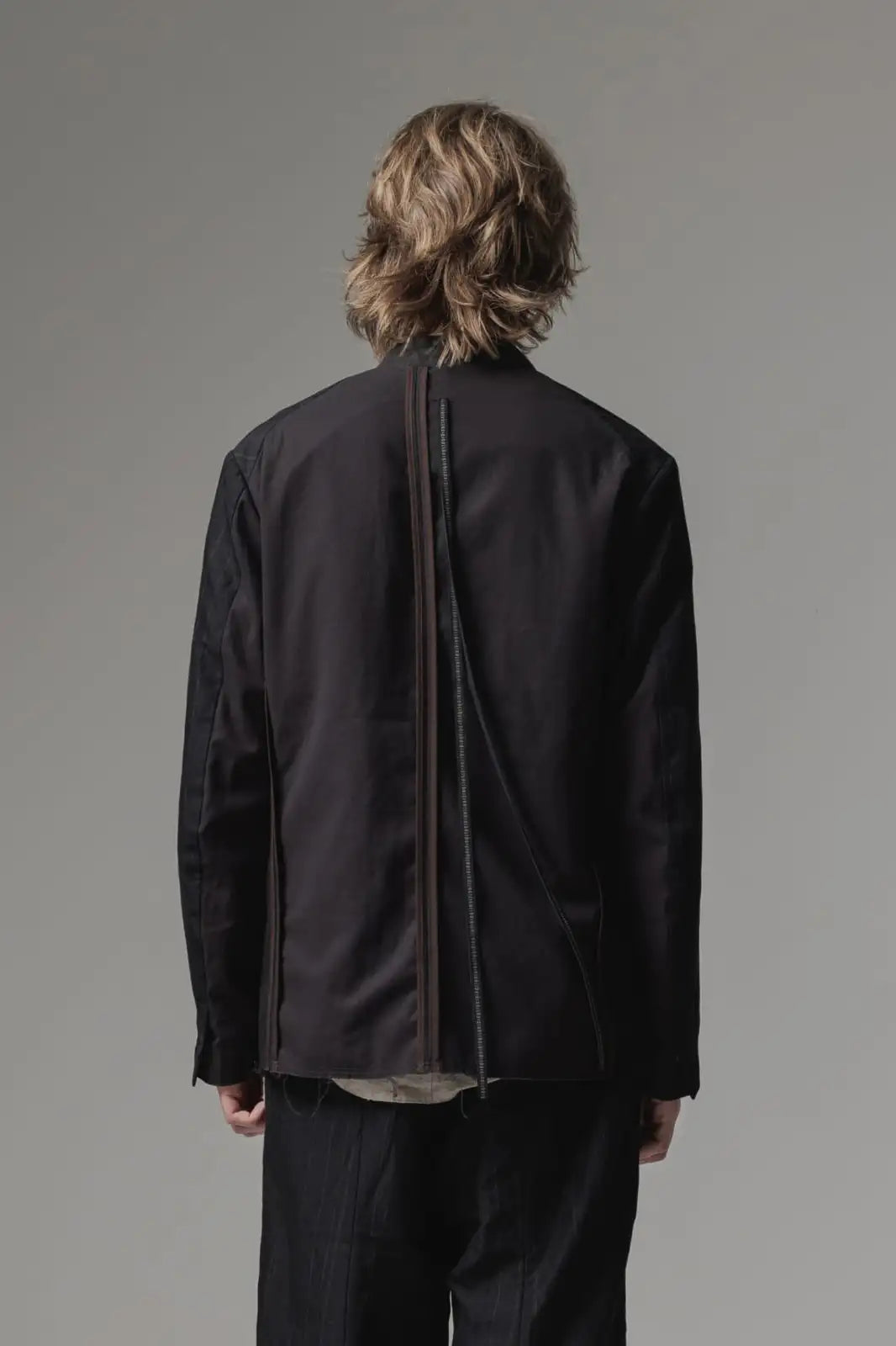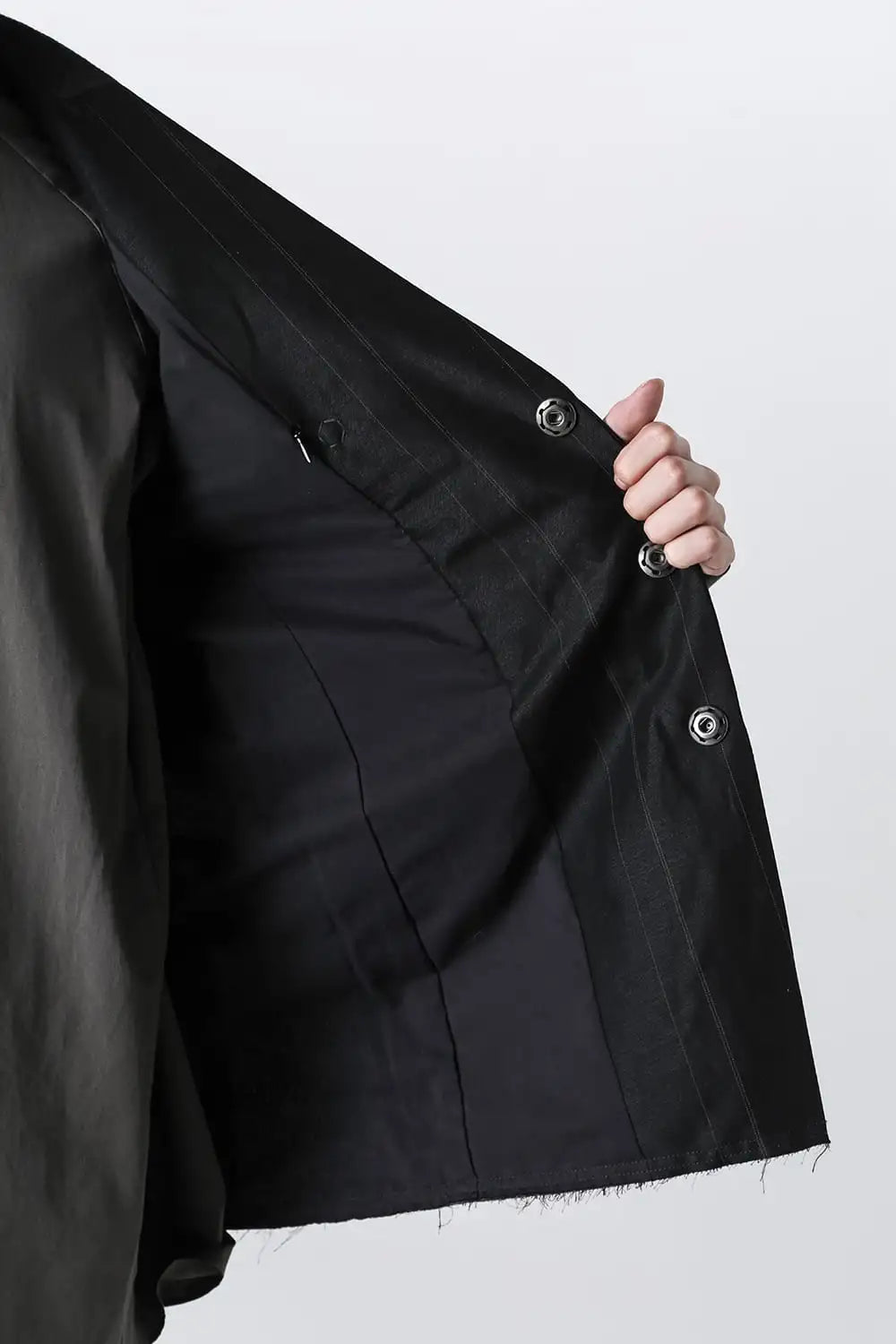 前身頃をコットンリネン、後ろ身頃と袖の一部をコットンギャバジンで切り替え、背中側の縫製面を表に出したデザインのノーカラージャケット。