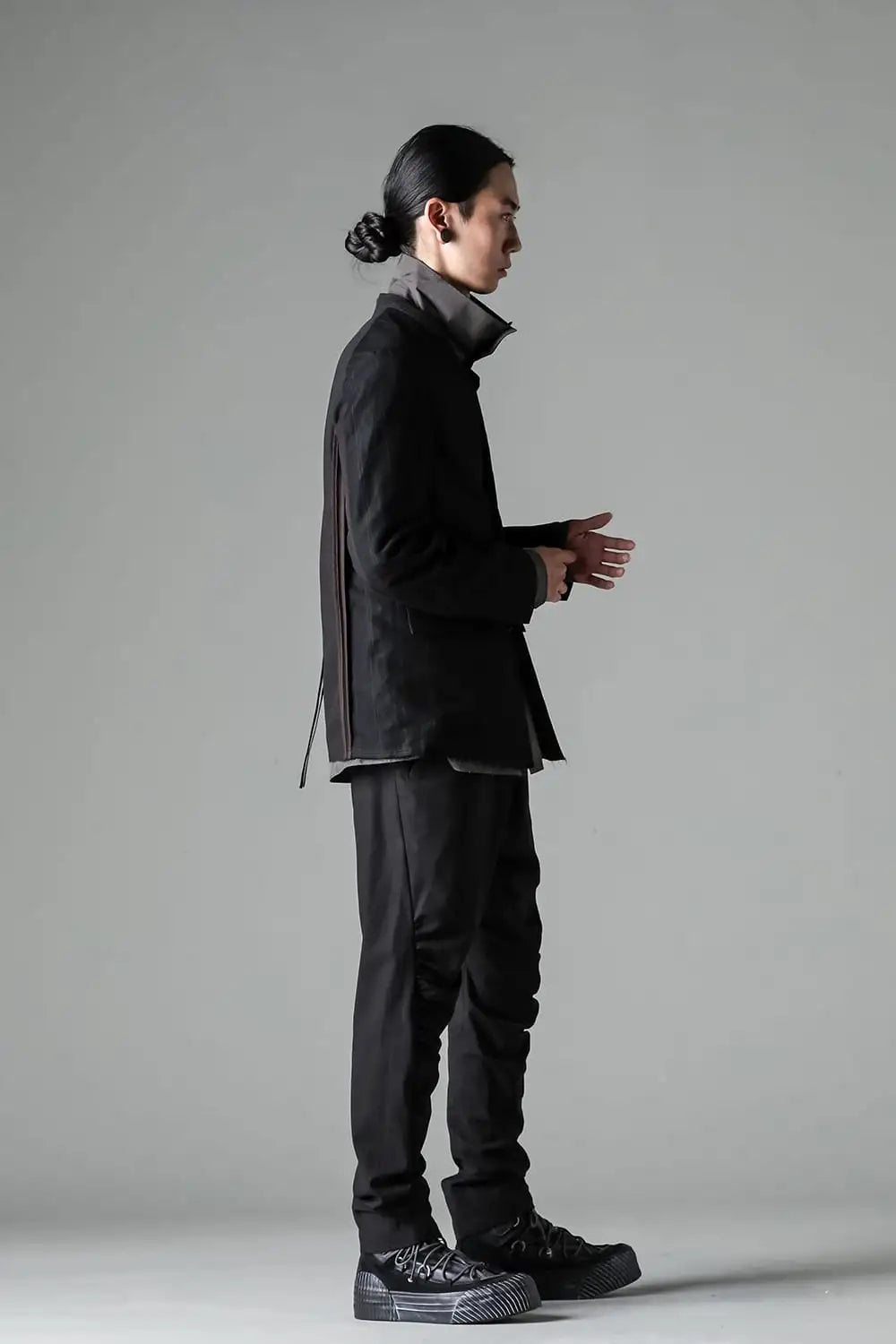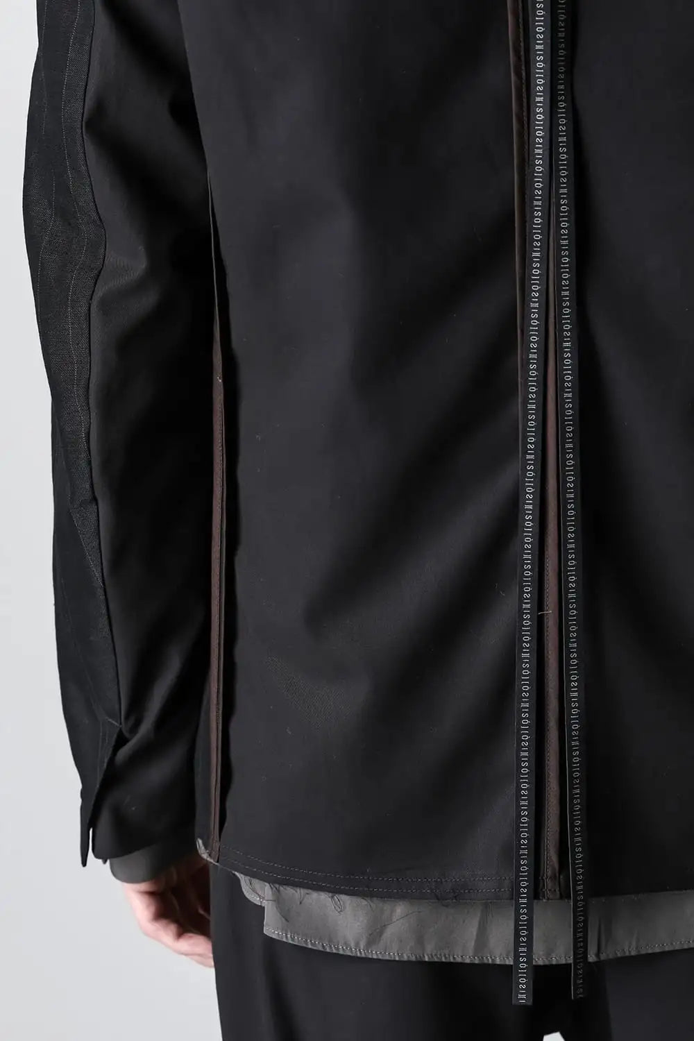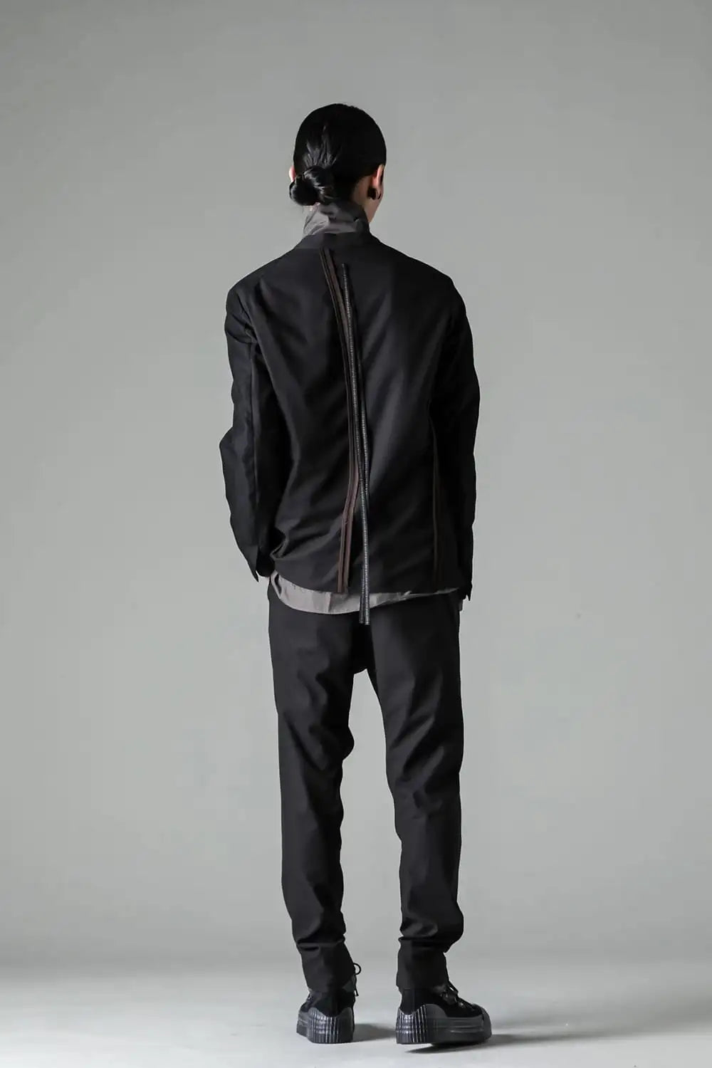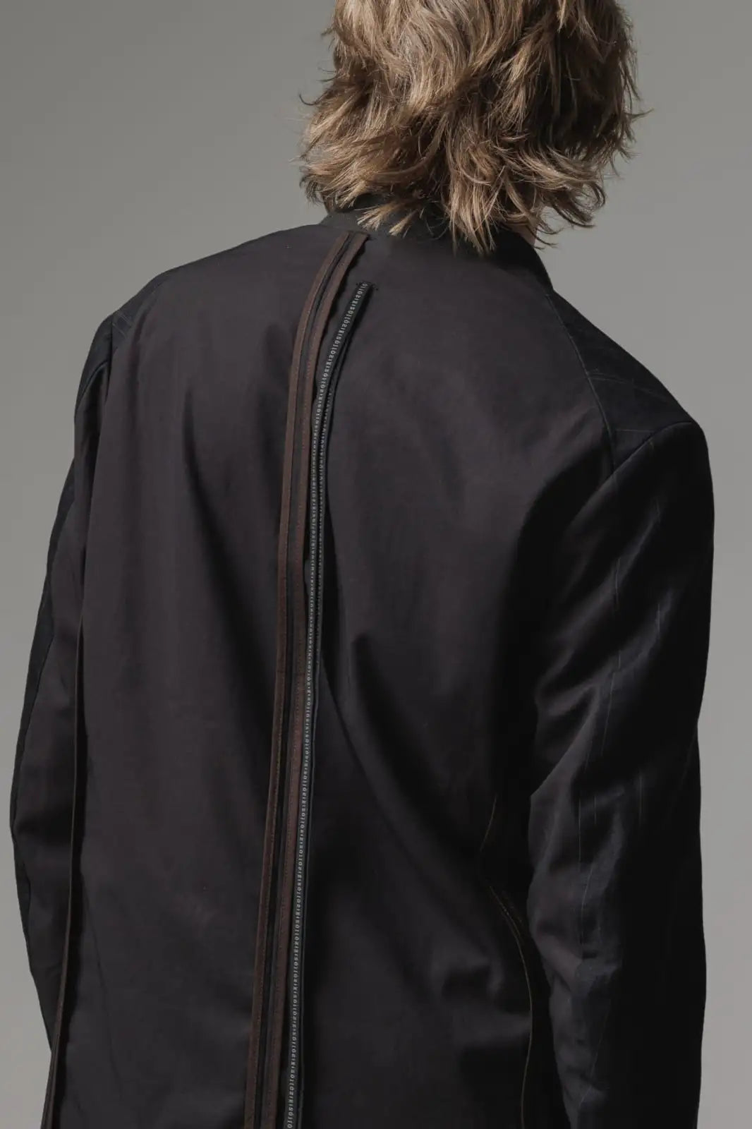 前身頃をコットンリネン、後ろ身頃と袖の一部をコットンギャバジンで切り替え、背中側の縫製面を表に出したデザインのノーカラージャケット。
