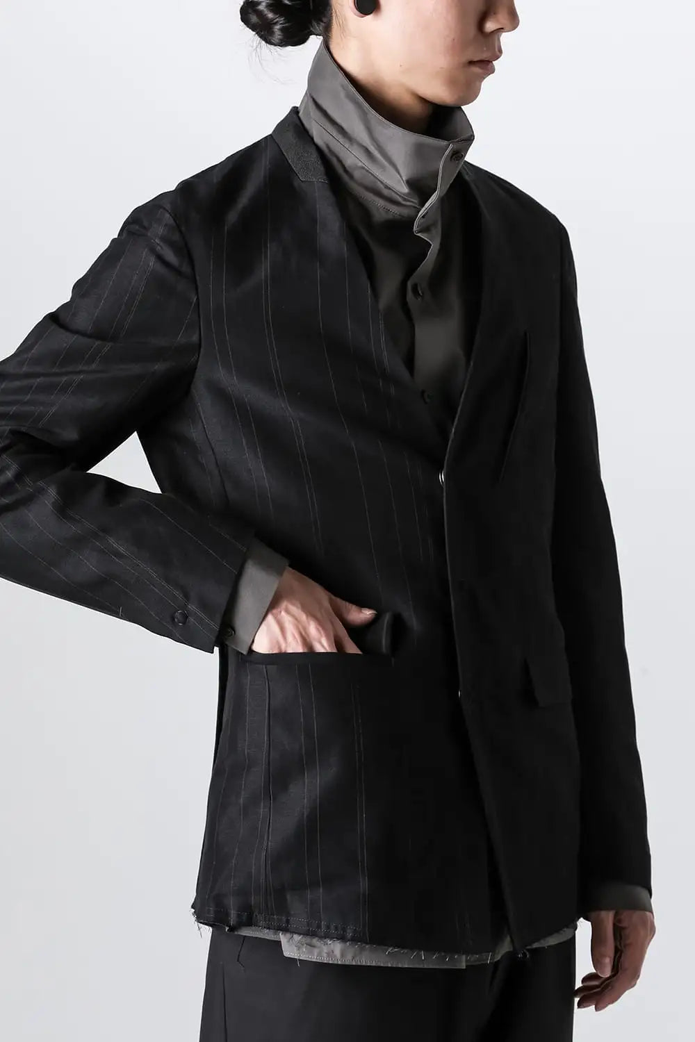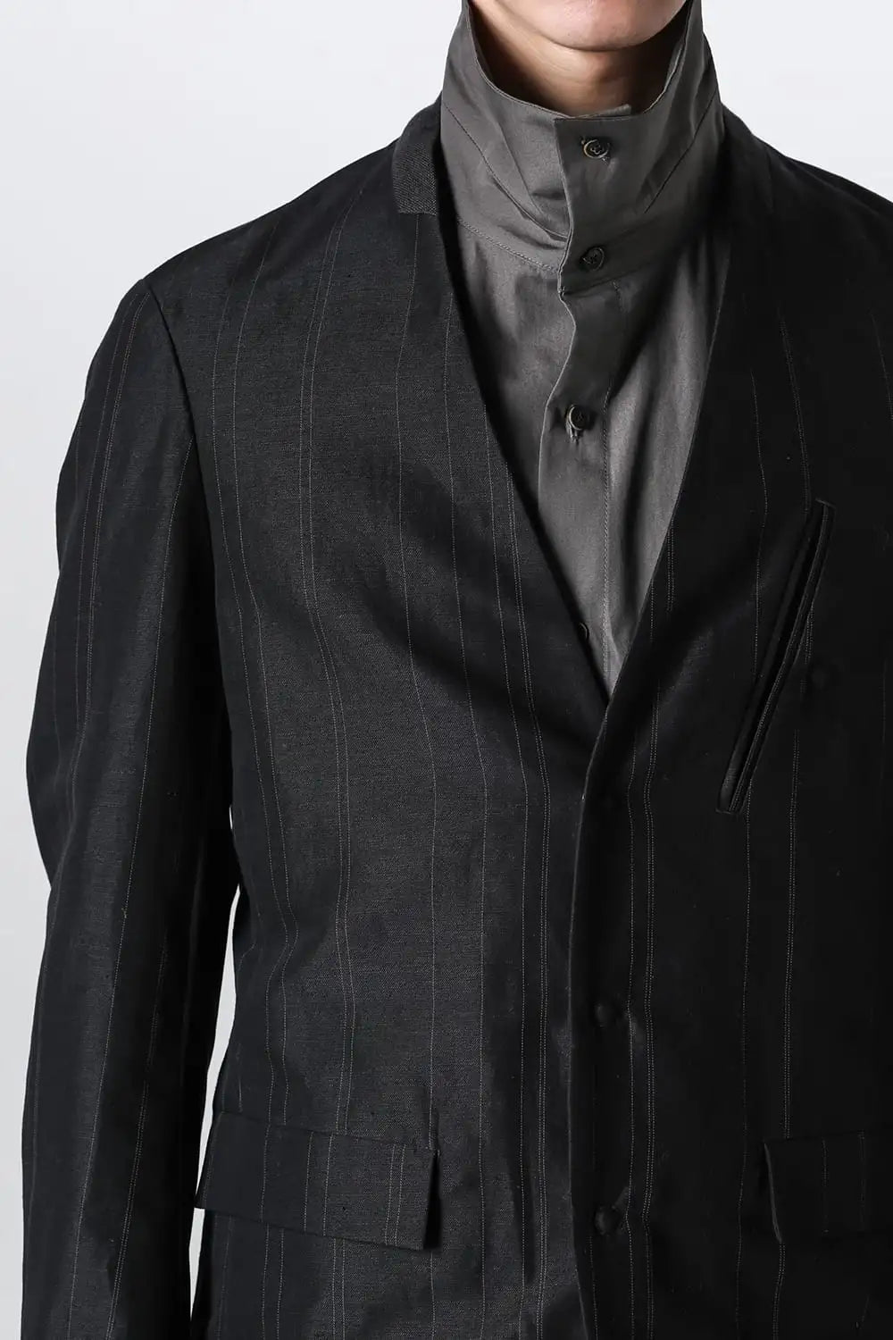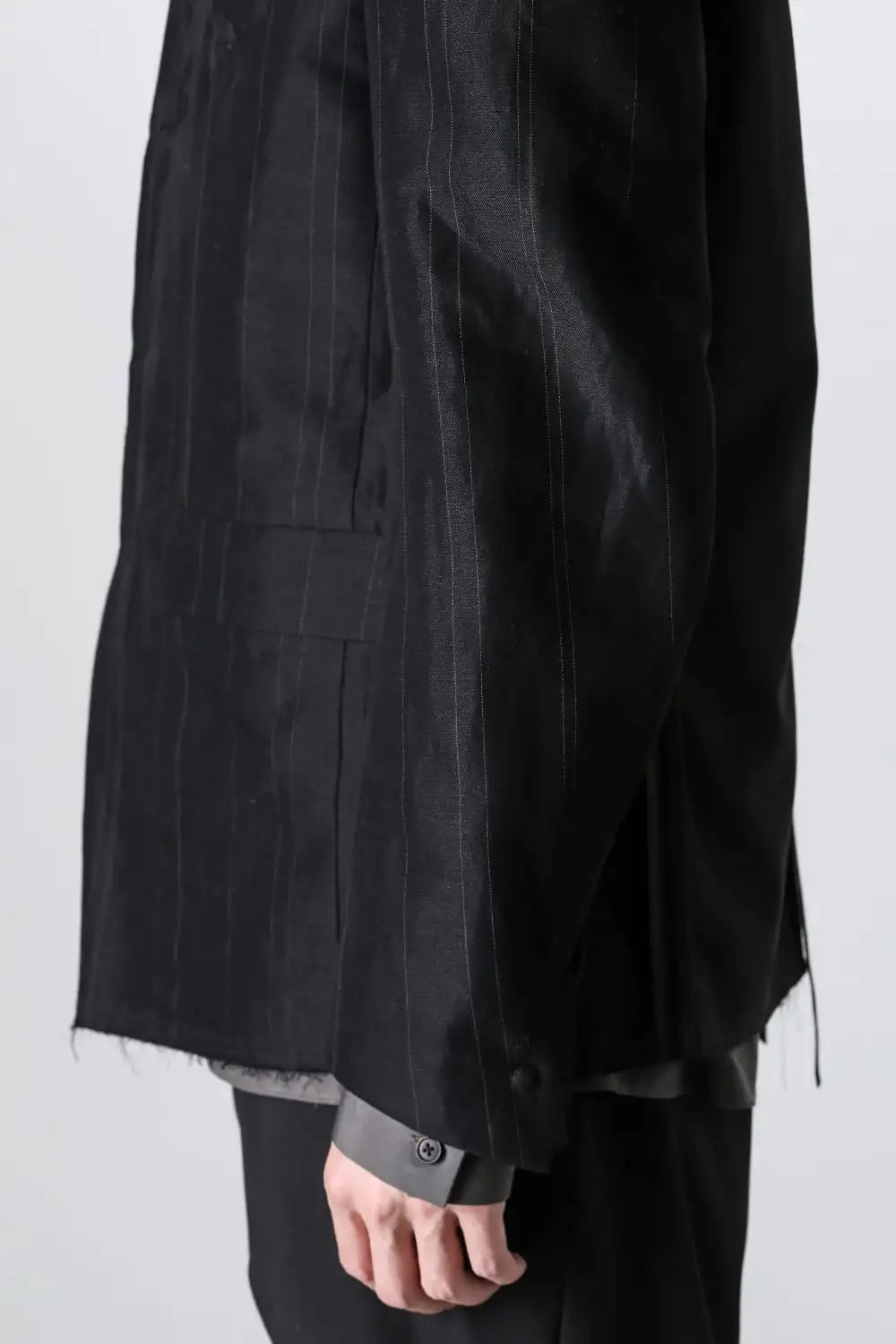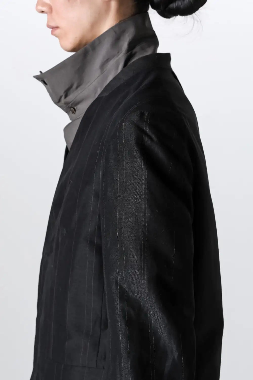 丈感はコンパクトで、身頃はゆったりとしたシルエット、前身頃はランダムなストライプ柄のコットンリネンでハリがある質感、後ろ身頃は柔かいコットンギャバジンで、いずれも厚みは控えめなので、ジャケットらしい表情をしておりますが羽織り感覚でも使えるような軽い着心地です。