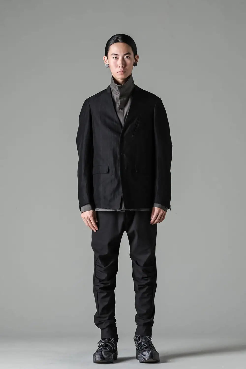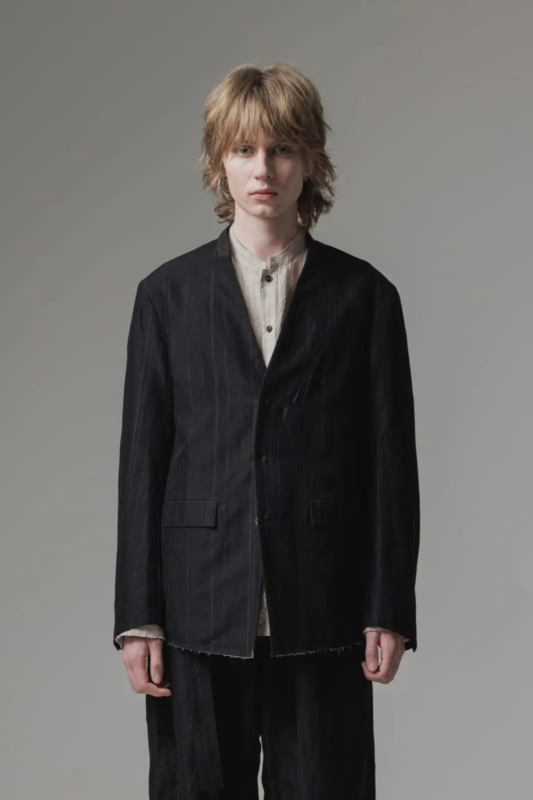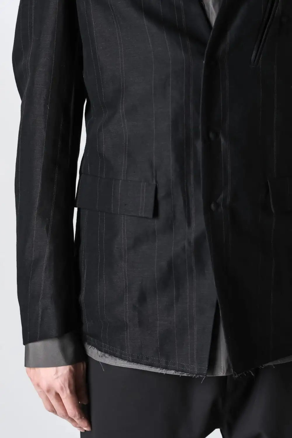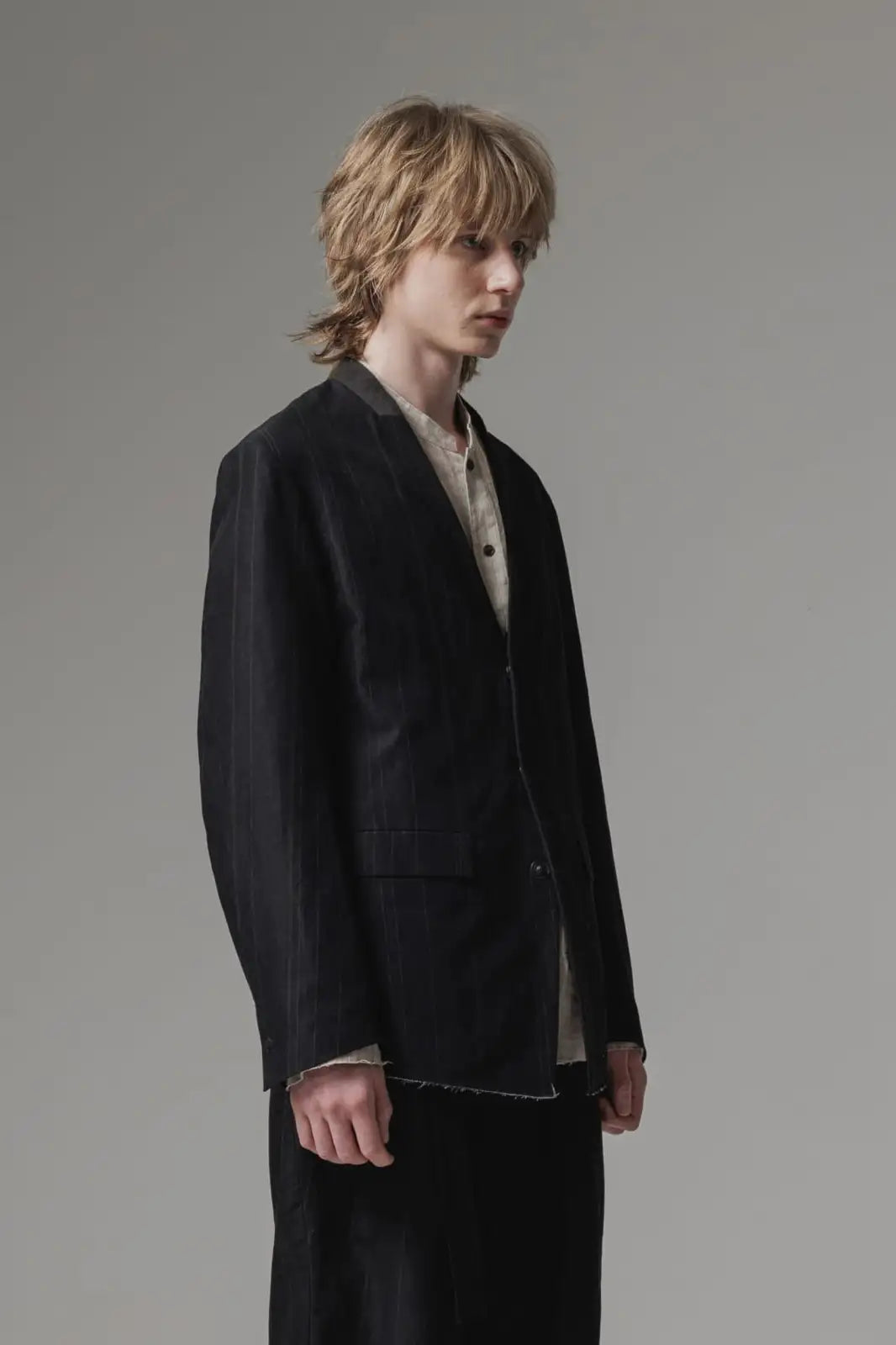 丈感はコンパクトで、身頃はゆったりとしたシルエット、前身頃はランダムなストライプ柄のコットンリネンでハリがある質感、後ろ身頃は柔かいコットンギャバジンで、いずれも厚みは控えめなので、ジャケットらしい表情をしておりますが羽織り感覚でも使えるような軽い着心地です。