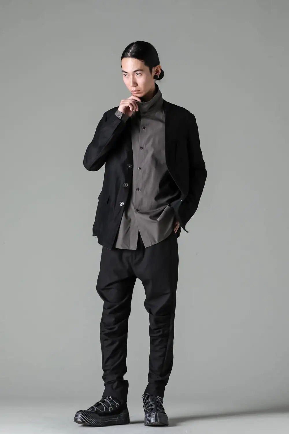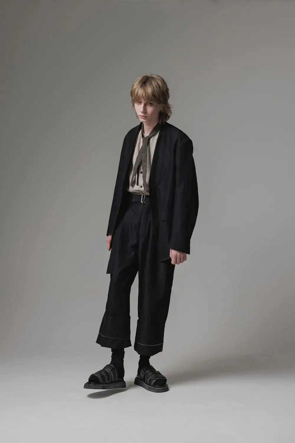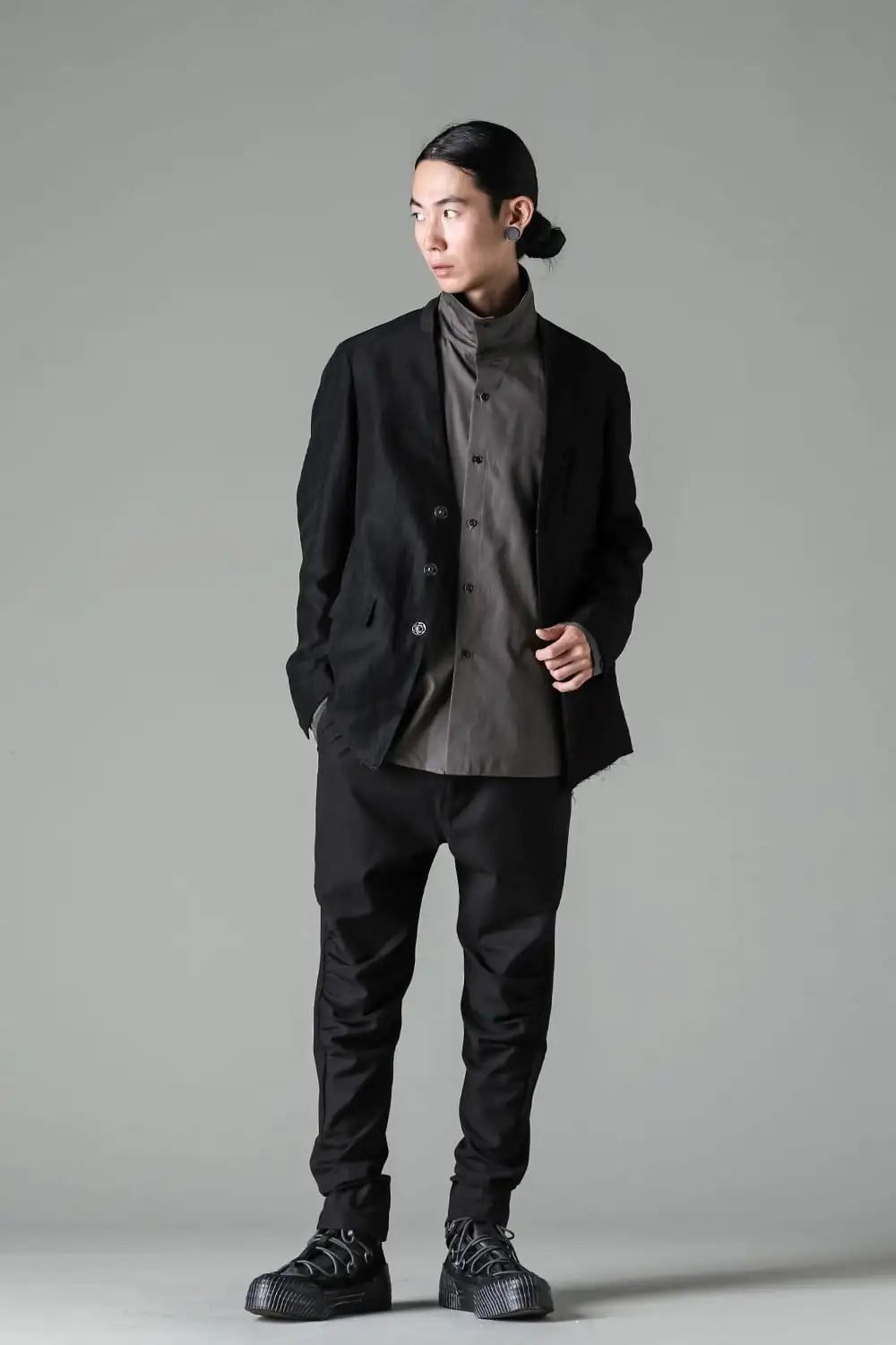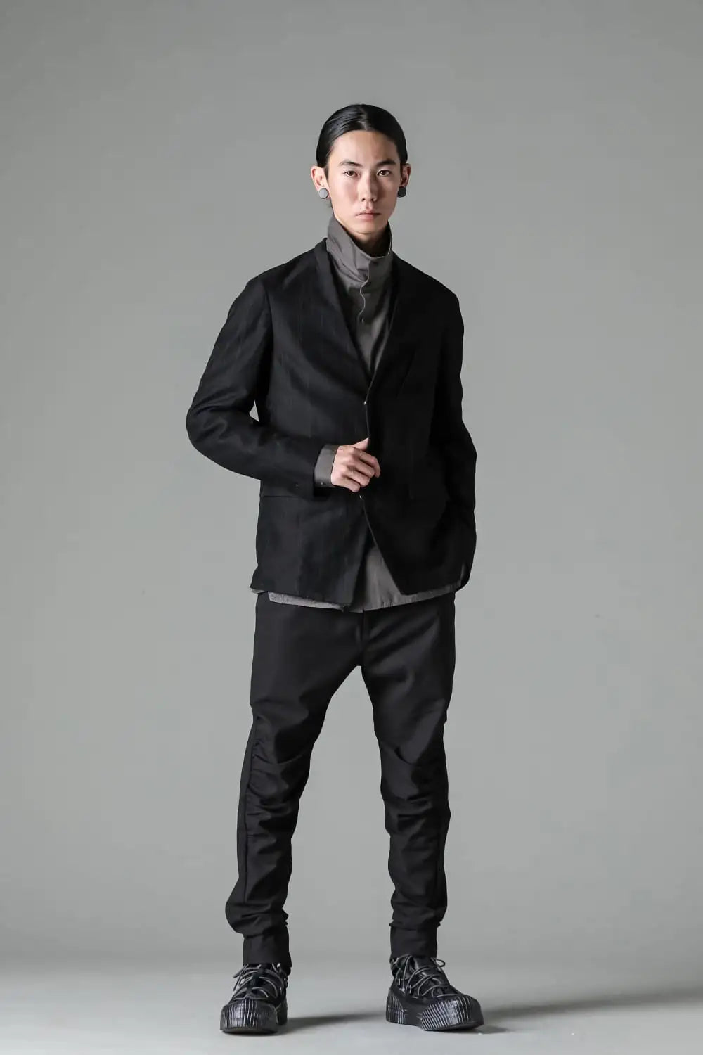 丈感はコンパクトで、身頃はゆったりとしたシルエット、前身頃はランダムなストライプ柄のコットンリネンでハリがある質感、後ろ身頃は柔かいコットンギャバジンで、いずれも厚みは控えめなので、ジャケットらしい表情をしておりますが羽織り感覚でも使えるような軽い着心地です。