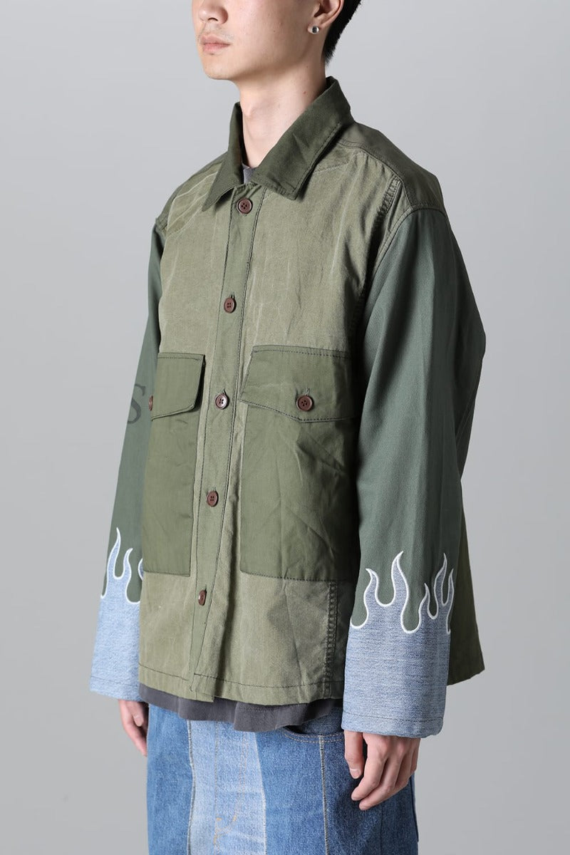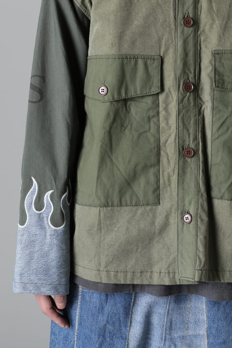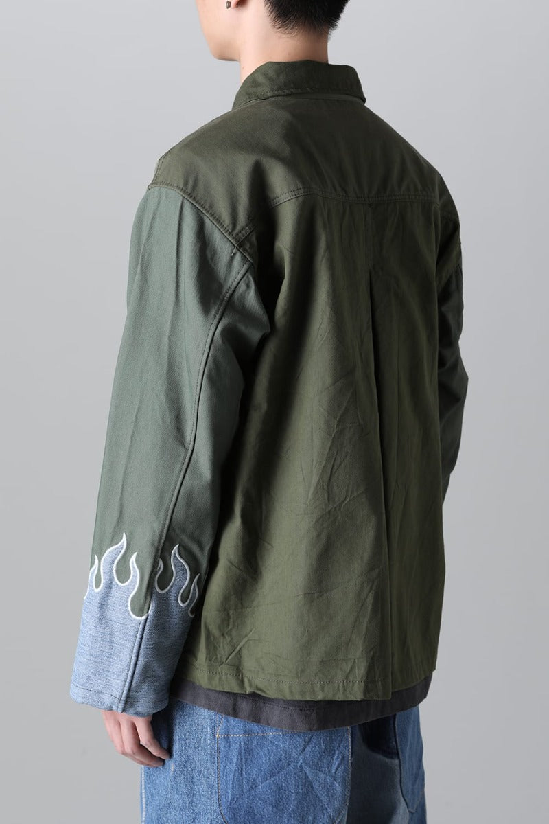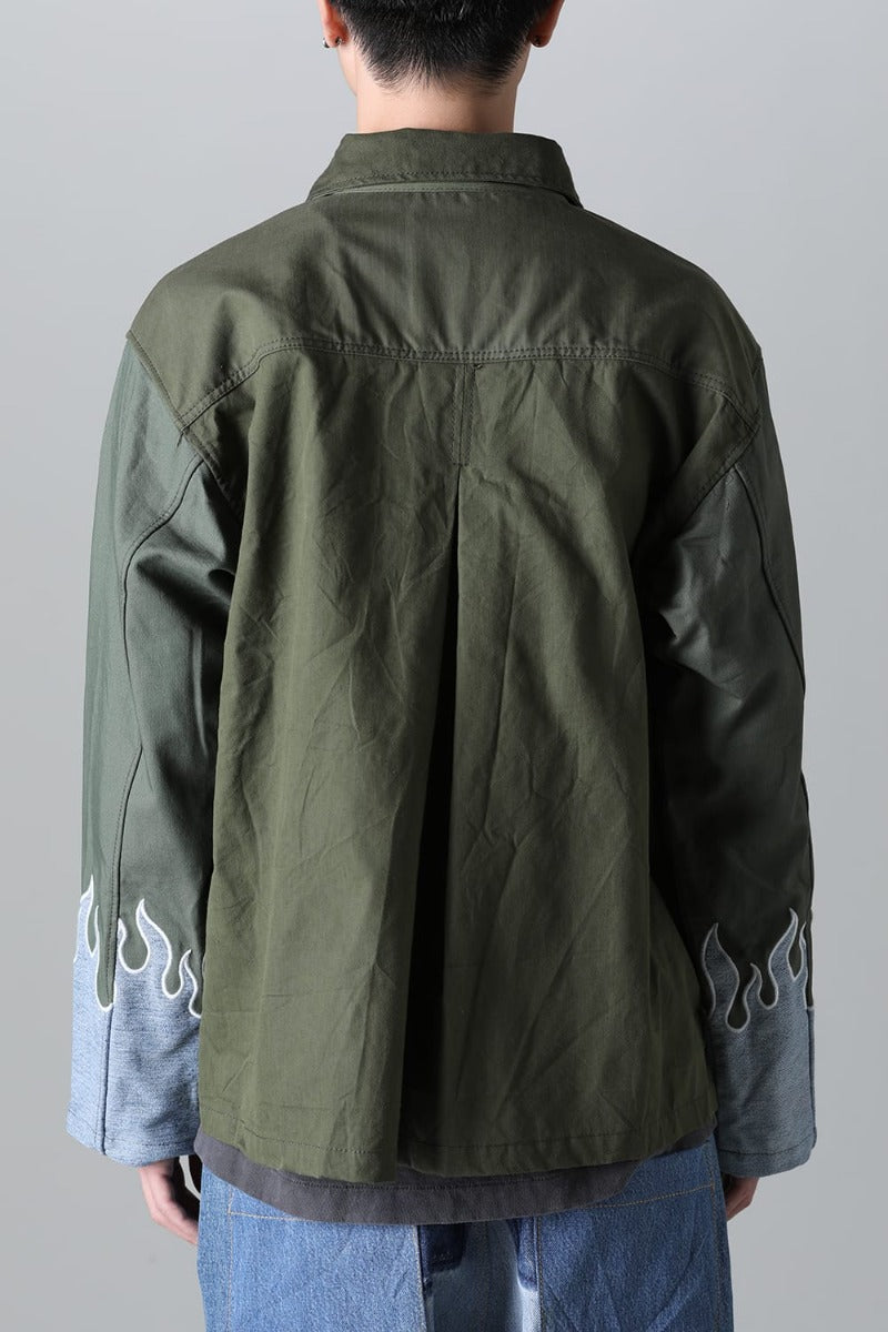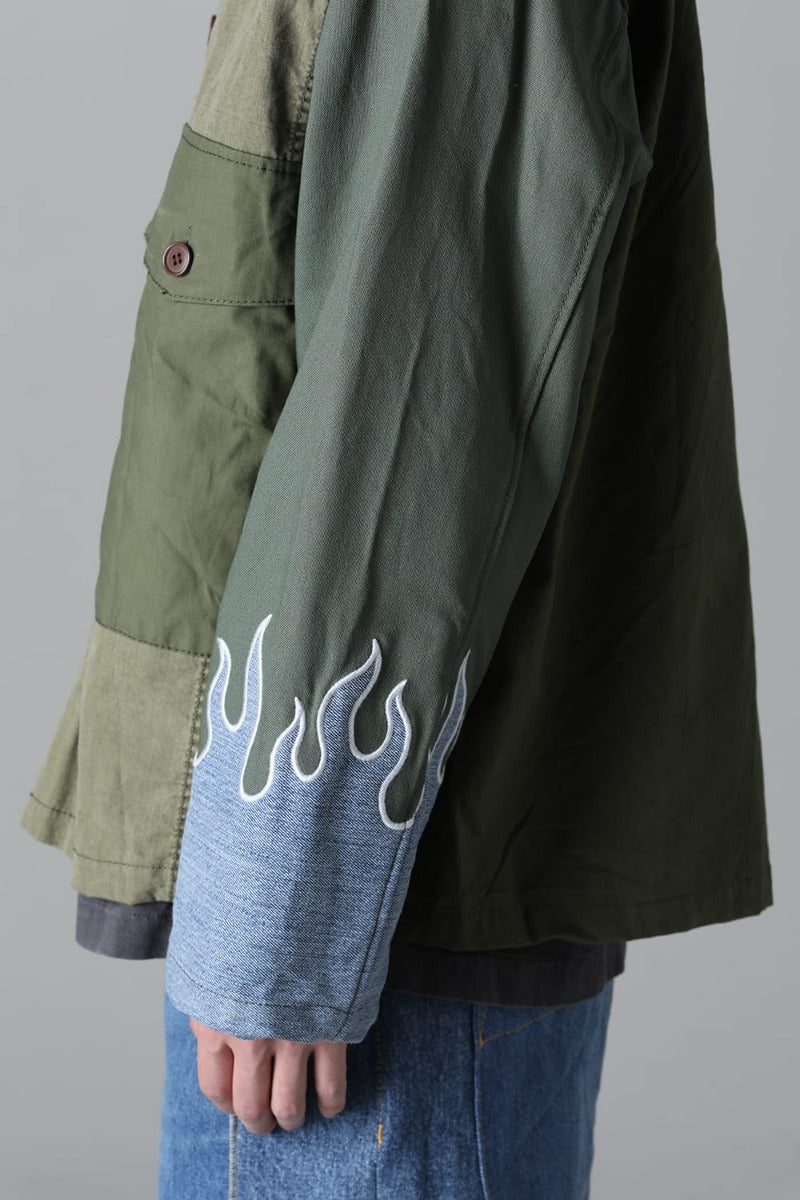 レーザーカットでファイヤーパターンをカットし、刺繍で止めたオリジナルファブリックを製作し袖に配備しています。