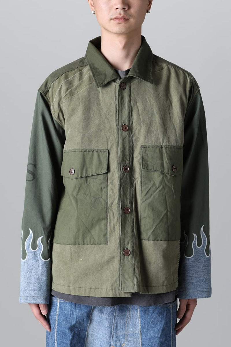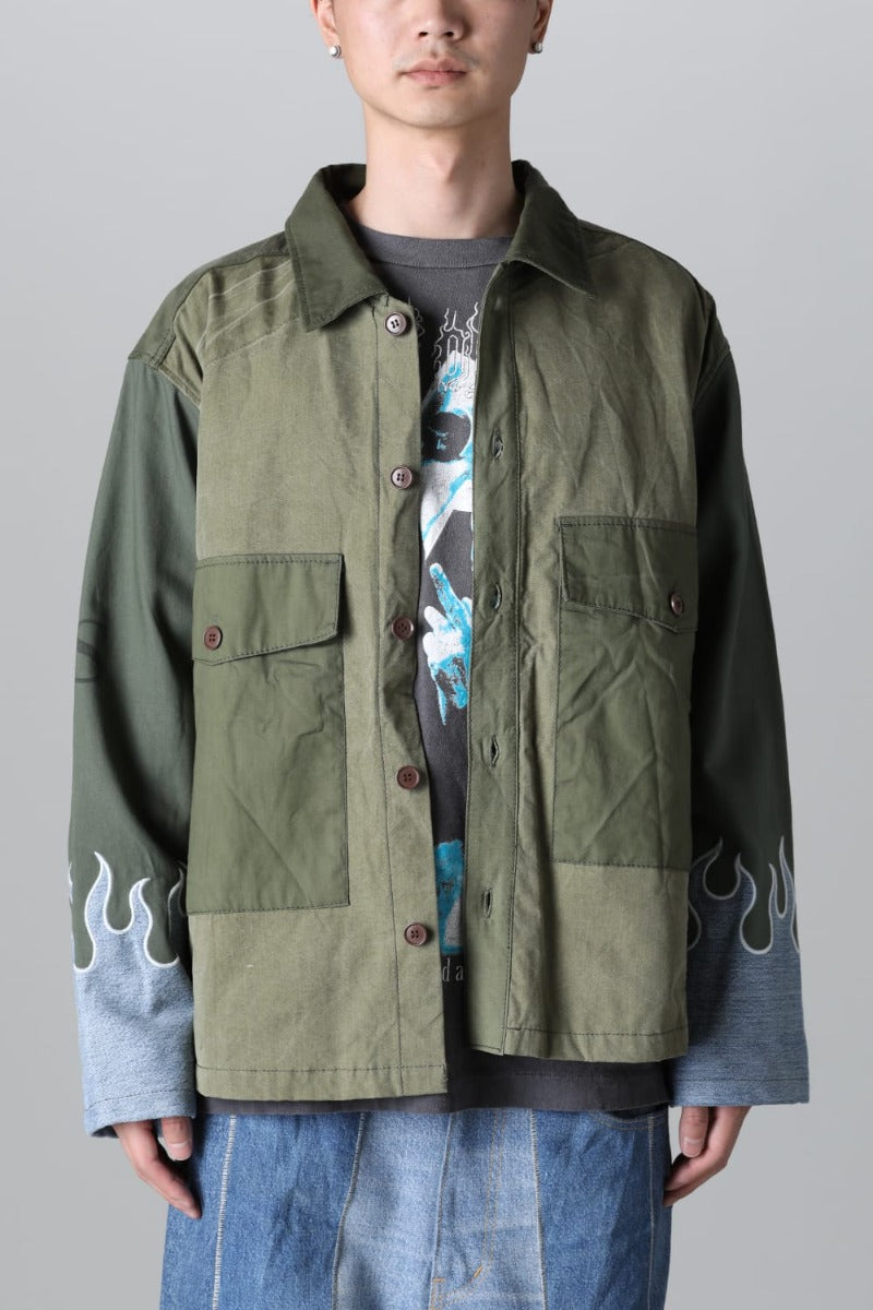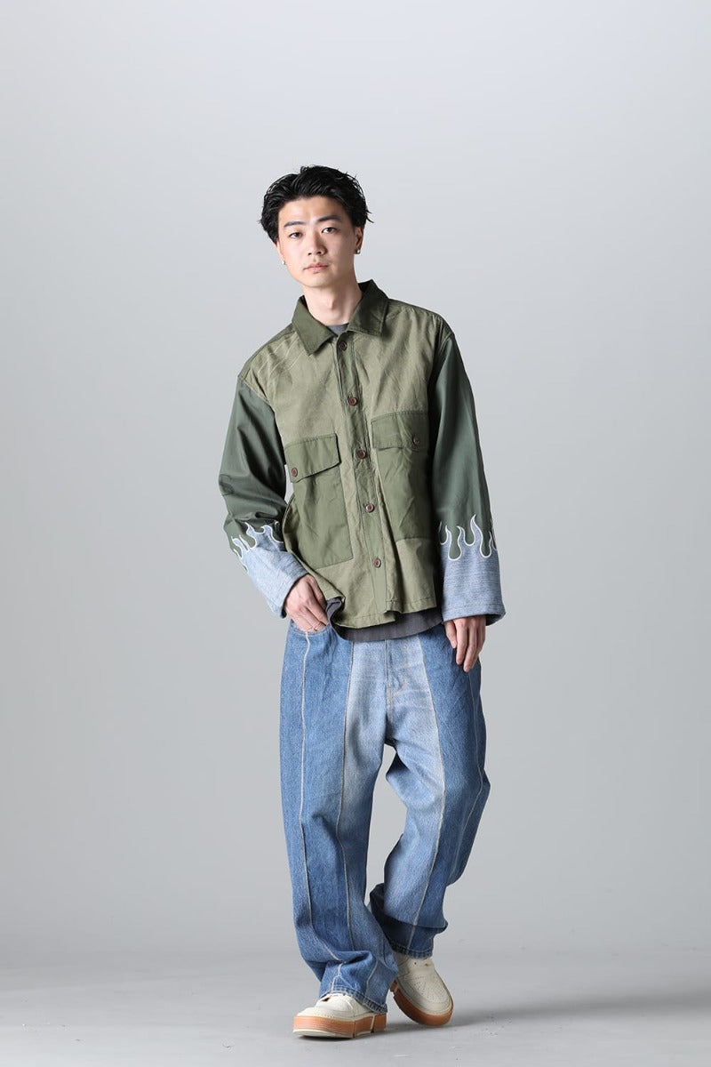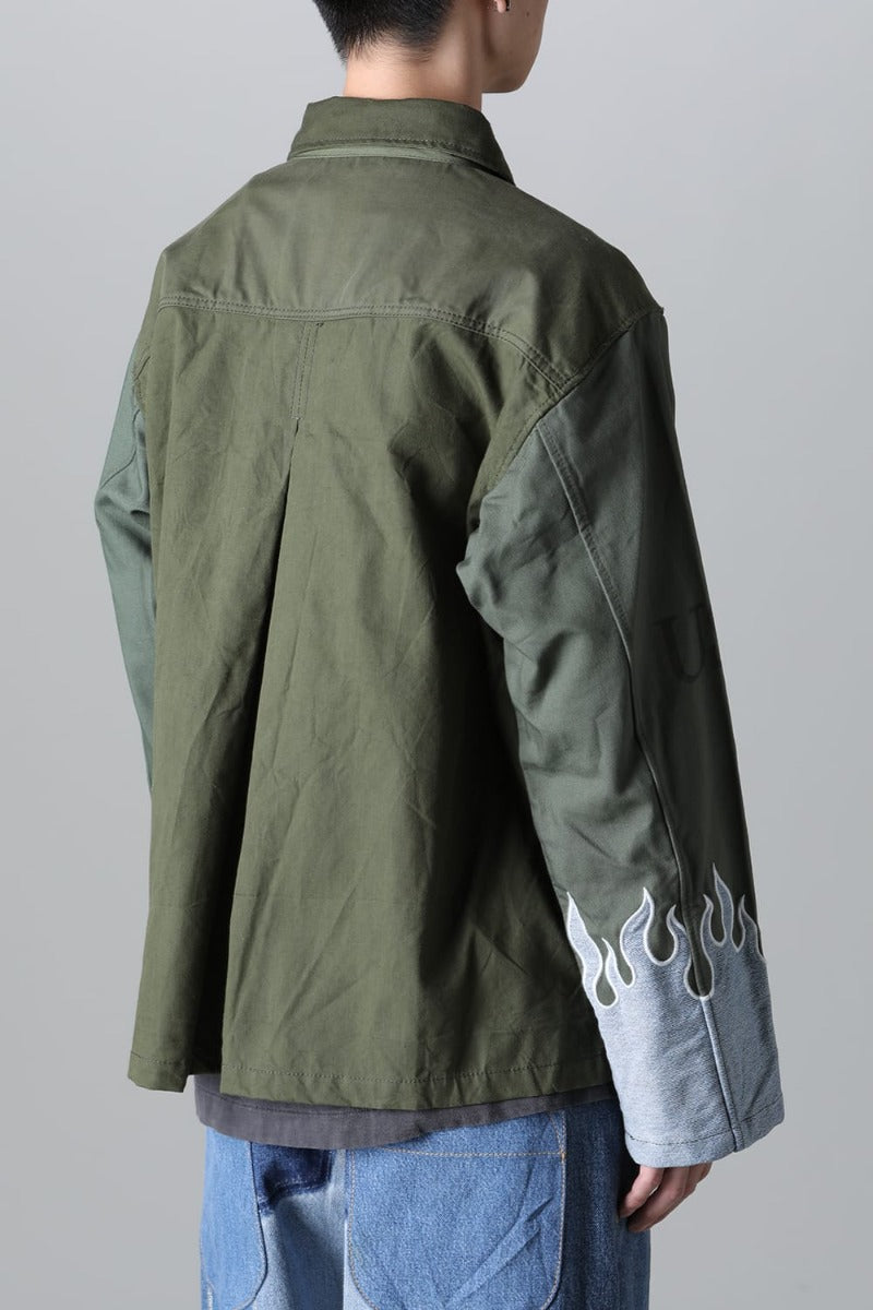 レーザーカットでファイヤーパターンをカットし、刺繍で止めたオリジナルファブリックを製作し袖に配備しています。