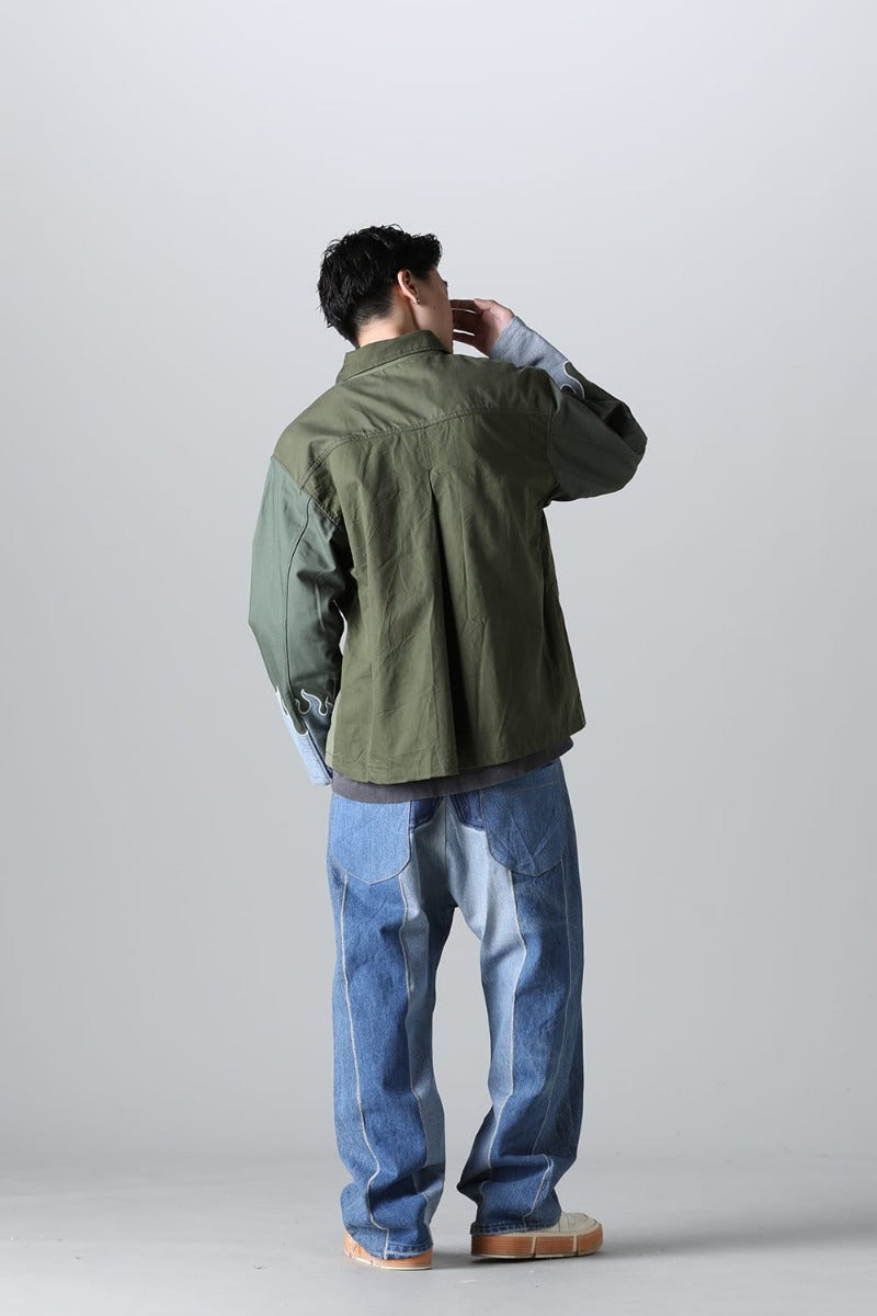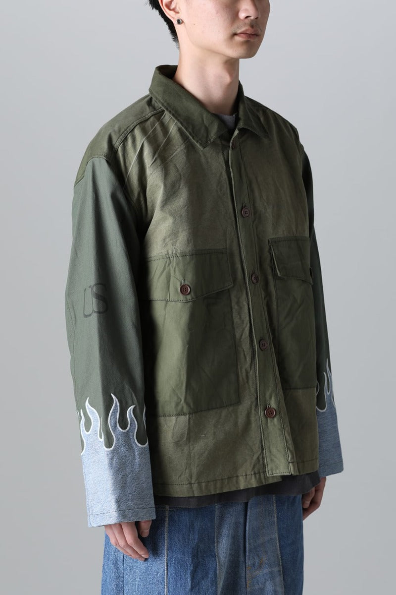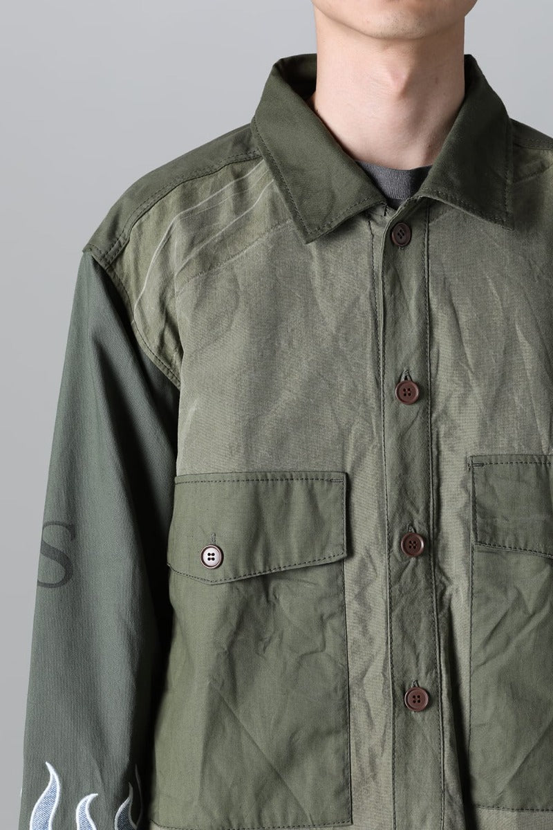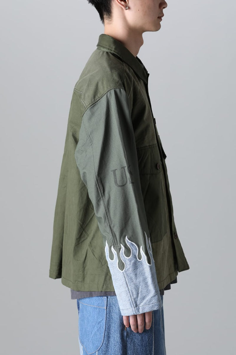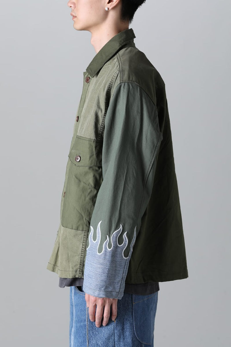 レーザーカットでファイヤーパターンをカットし、刺繍で止めたオリジナルファブリックを製作し袖に配備しています。