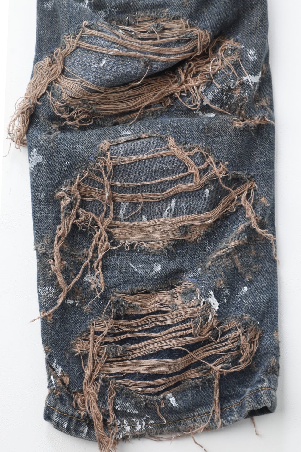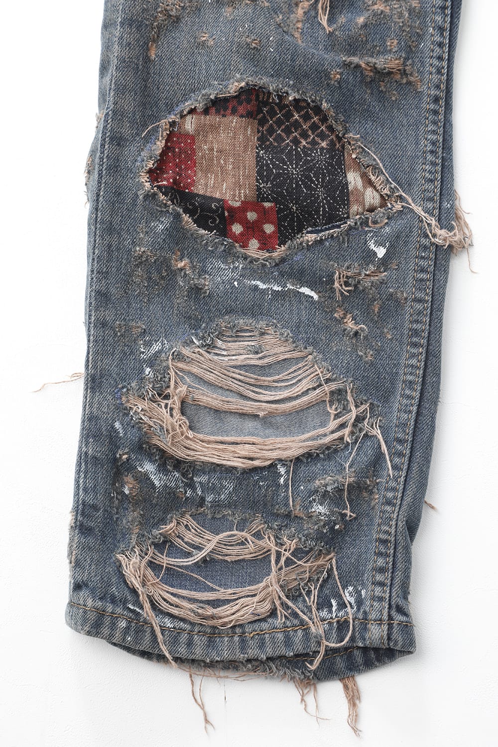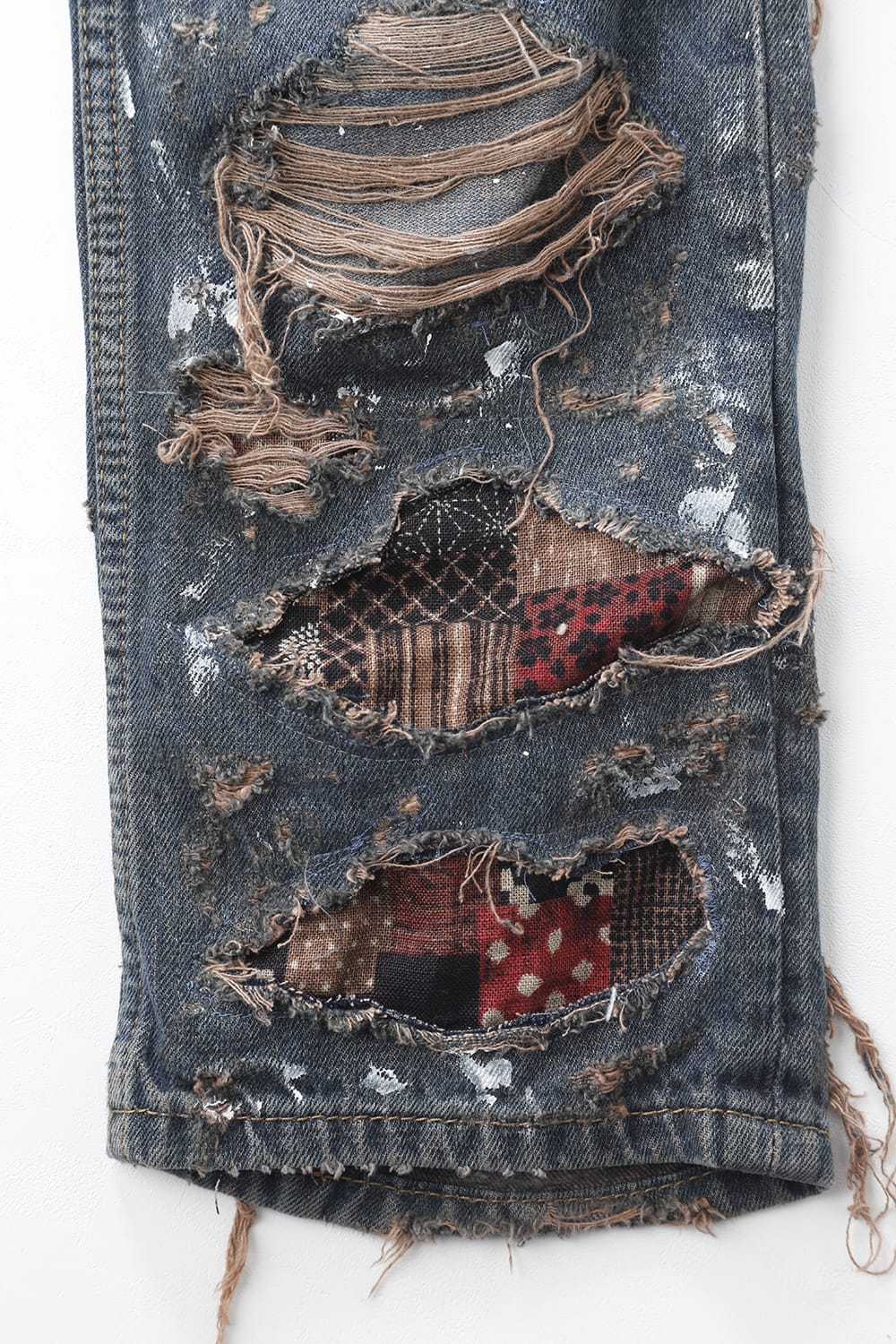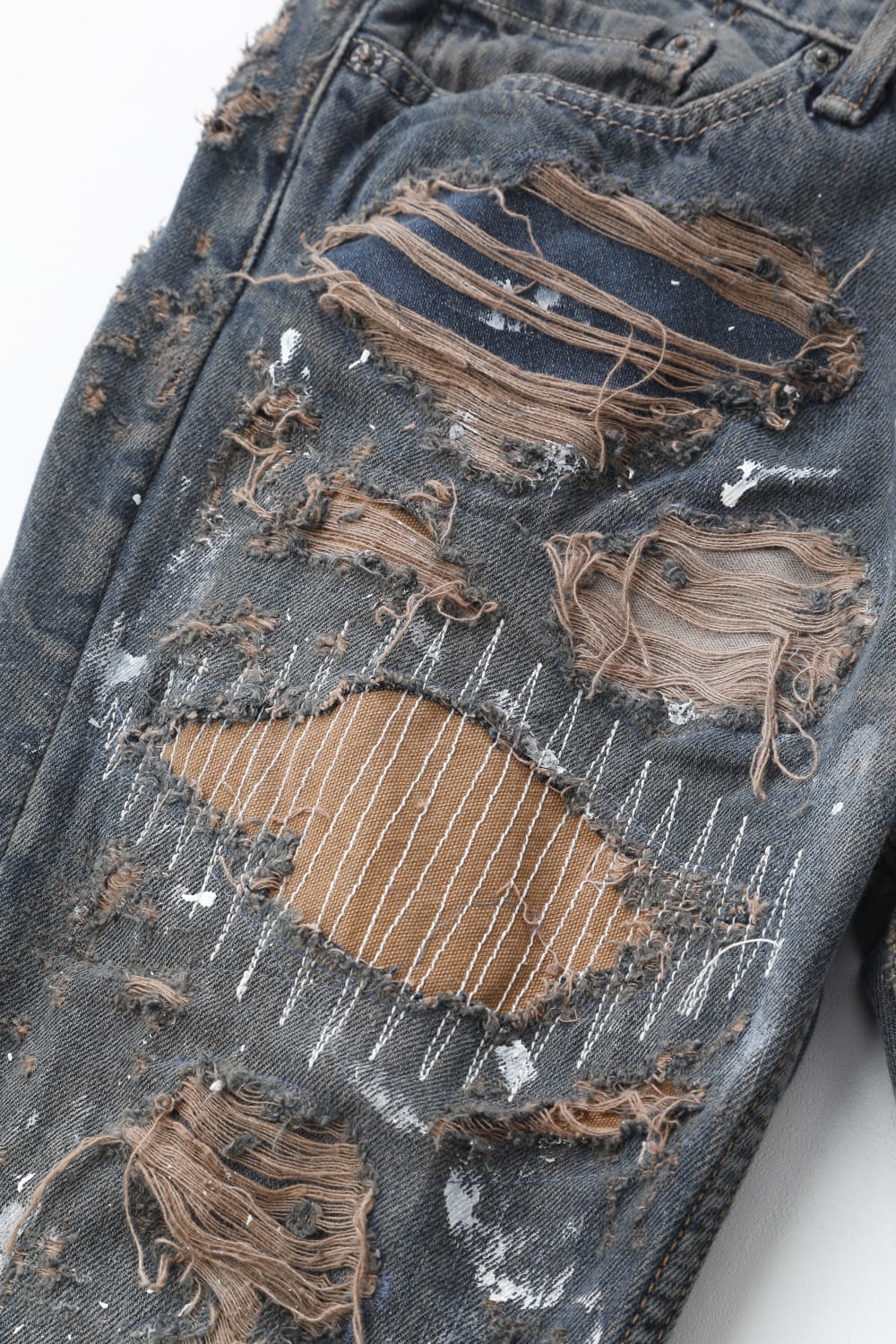 ハードなデストロイ加工とペイント加工、ダメージ部分には全体的に当て布を施し1点1点違う表情に仕上げられています。