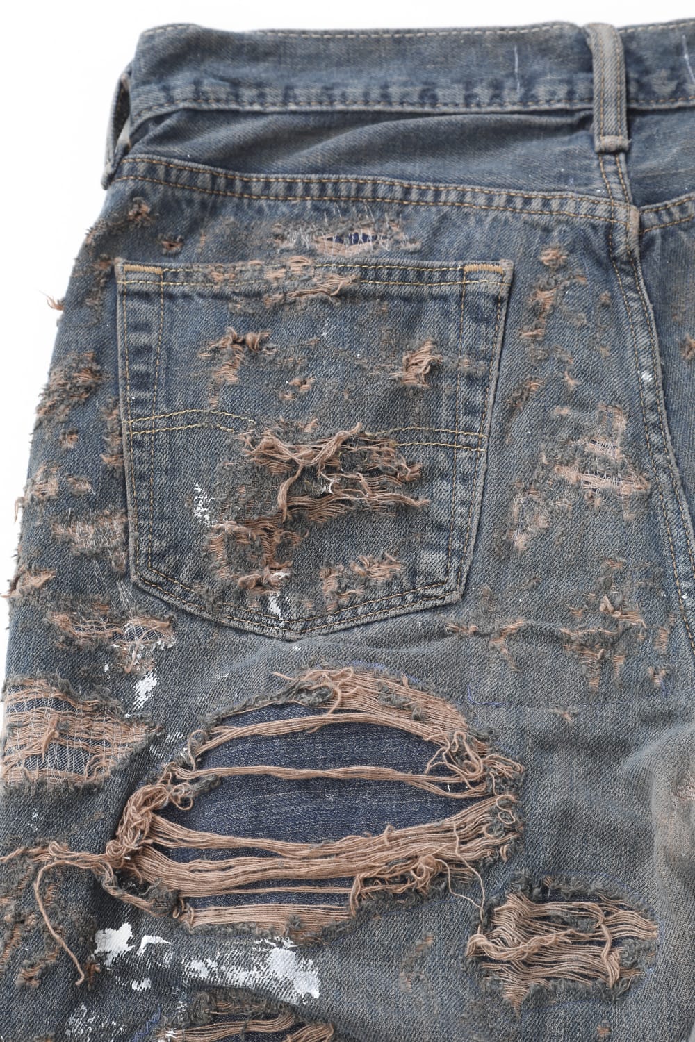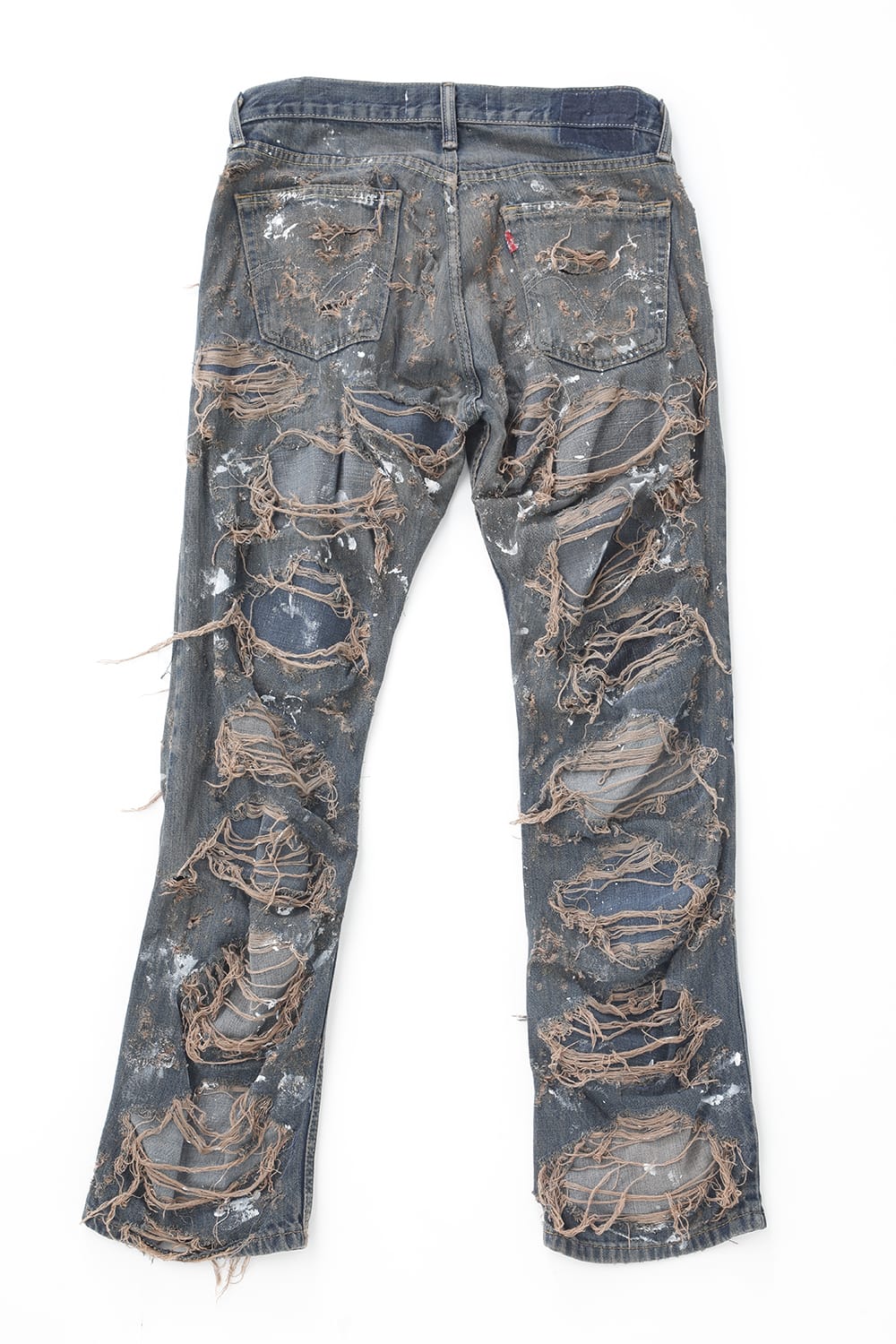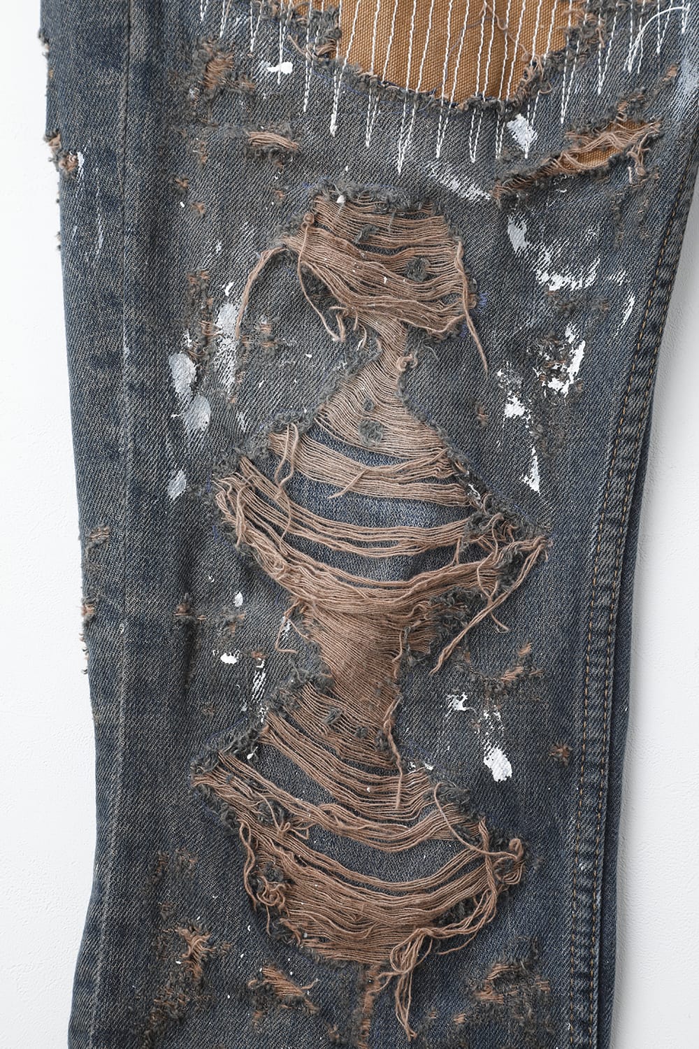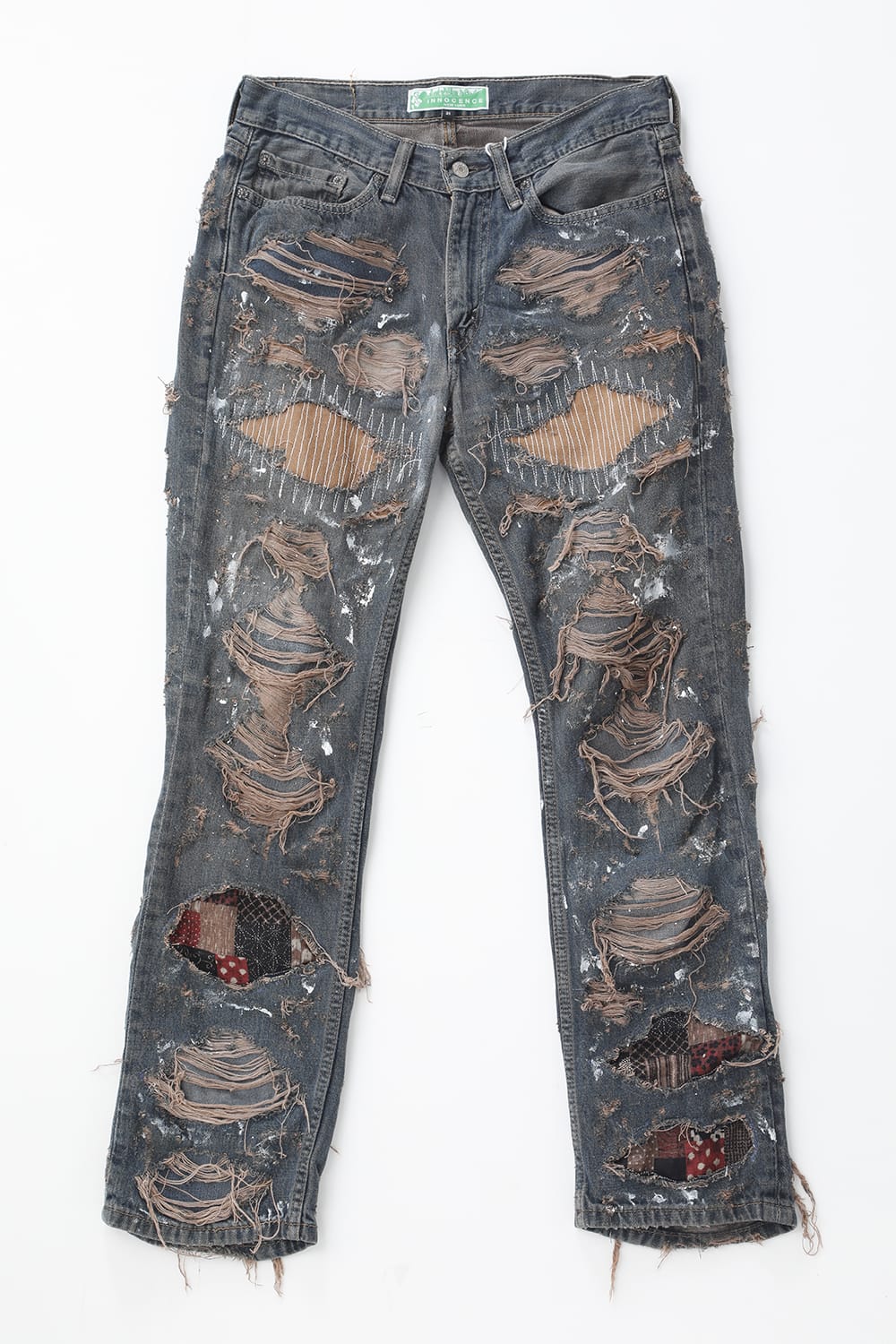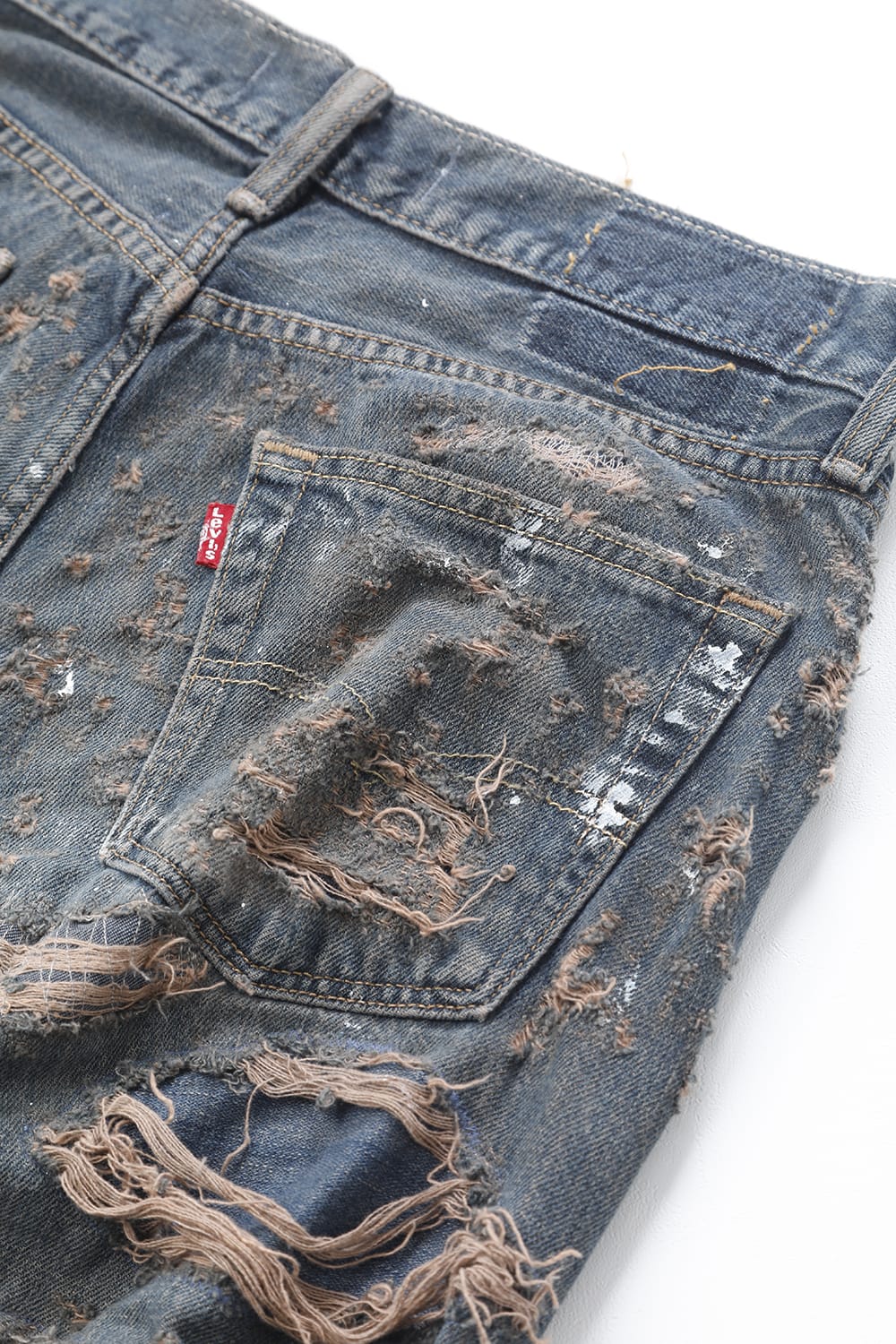 ハードなデストロイ加工とペイント加工、ダメージ部分には全体的に当て布を施し1点1点違う表情に仕上げられています。