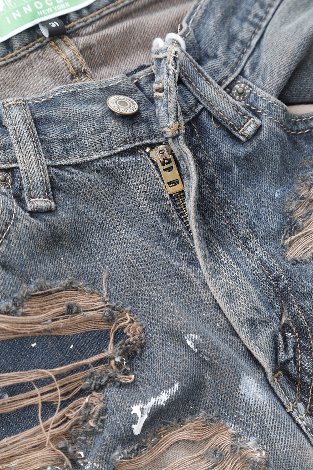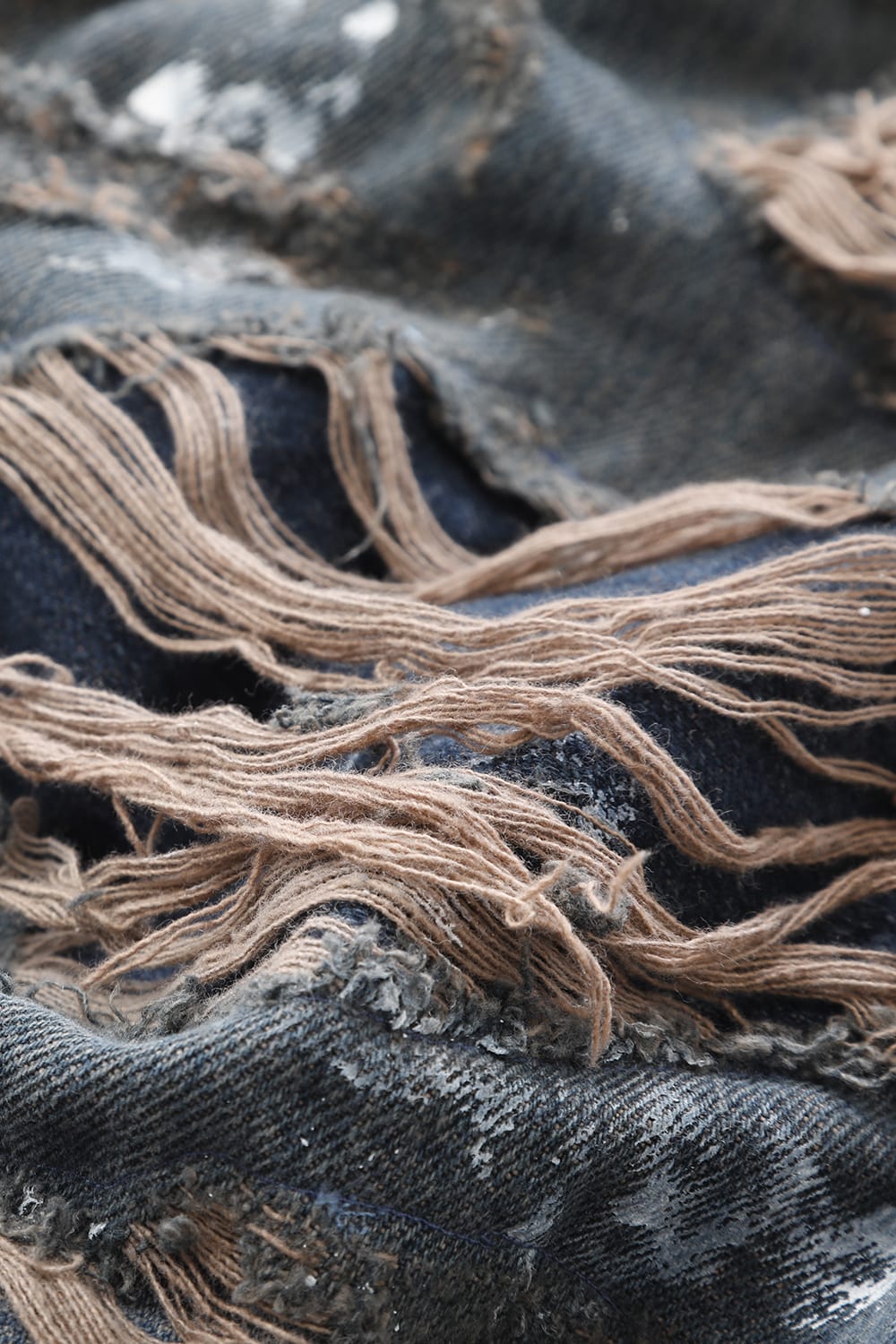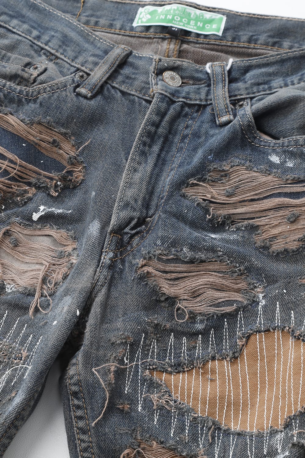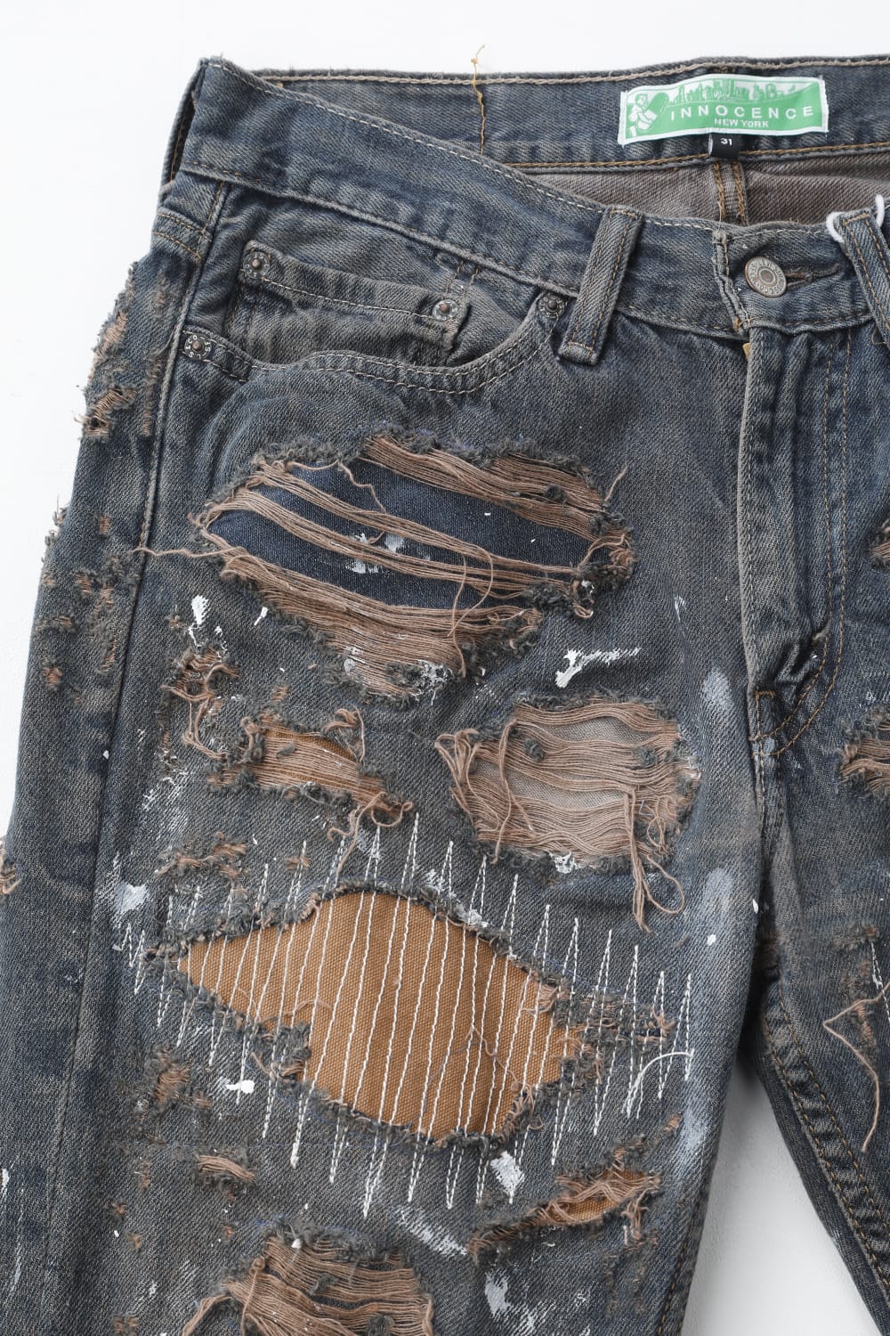 ハードなデストロイ加工とペイント加工、ダメージ部分には全体的に当て布を施し1点1点違う表情に仕上げられています。