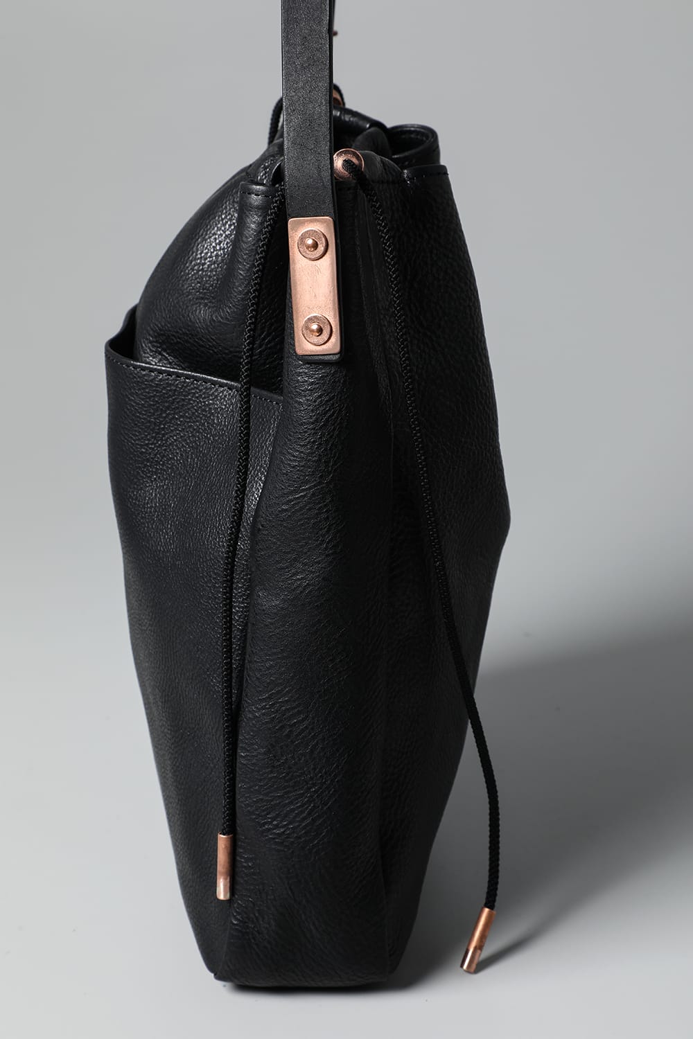 紐の途中にある銅の円柱で出来たビーズを滑らせて位置を調整することにより、バッグの巾着口を固定したり、金具の位置を変えることによって変化するバッグの見え方の違いをお楽しみいただけるようにしております。