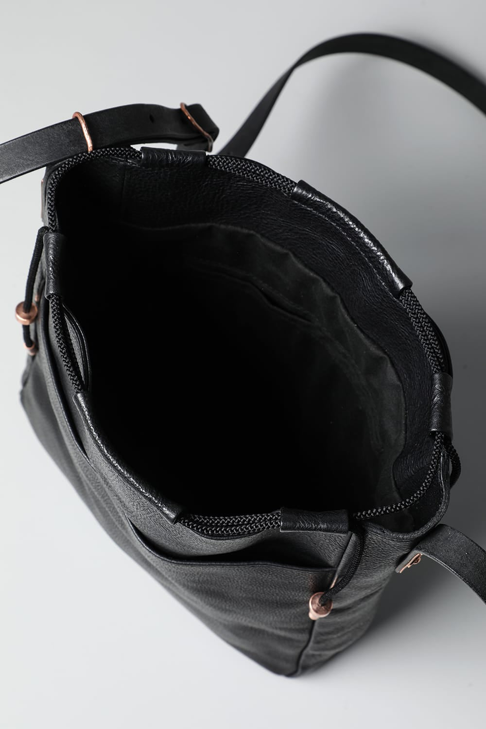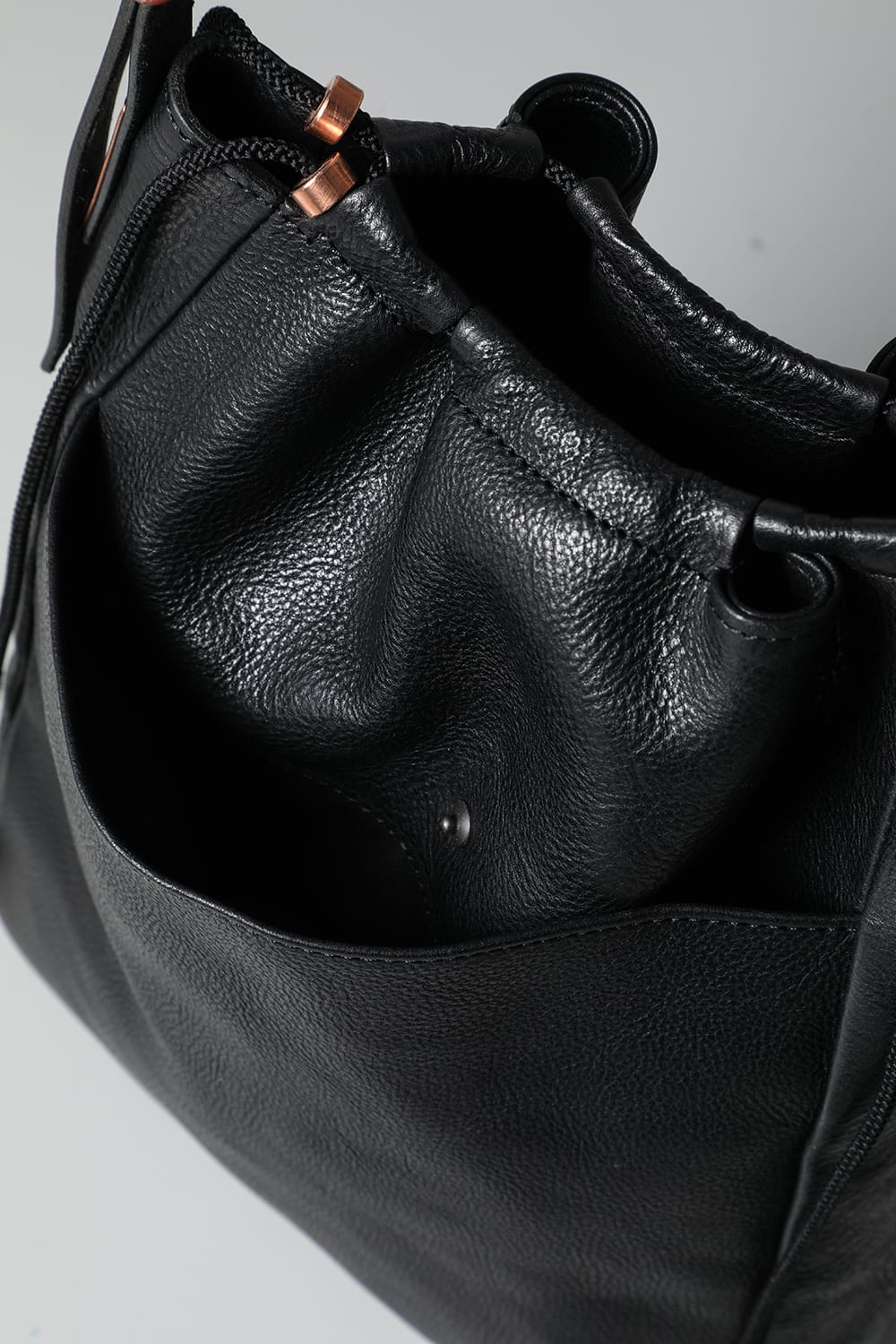 バッグの口を紐で搾ることによって、巾着の形状に近づきます 搾る事による形状の変化もお楽しみいただけます。