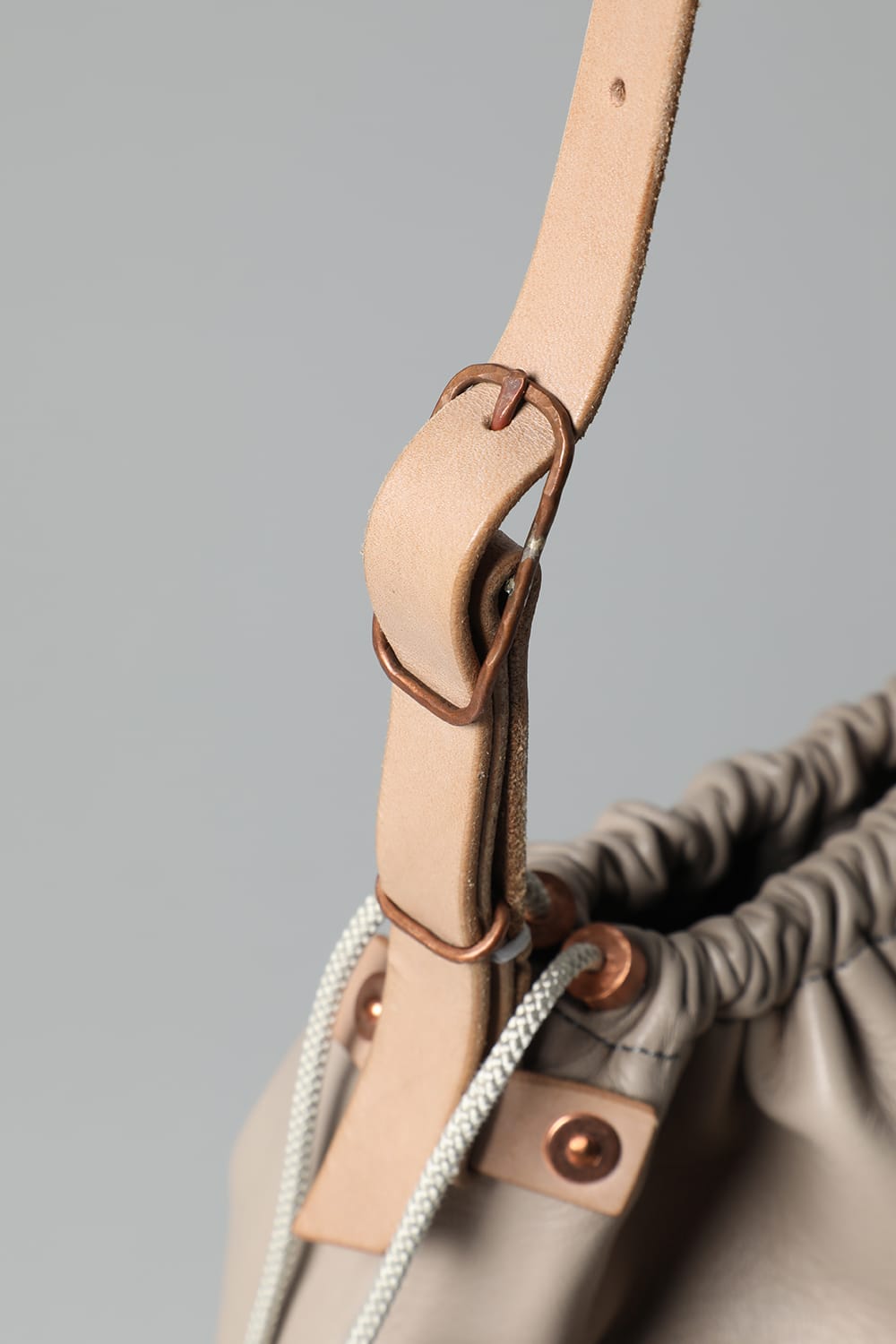 紐の途中にある銅の円柱で出来たビーズを滑らせて位置を調整することにより、バッグの巾着口を固定したり、金具の位置を変えることによって変化するバッグの見え方の違いをお楽しみいただけるようにしております。