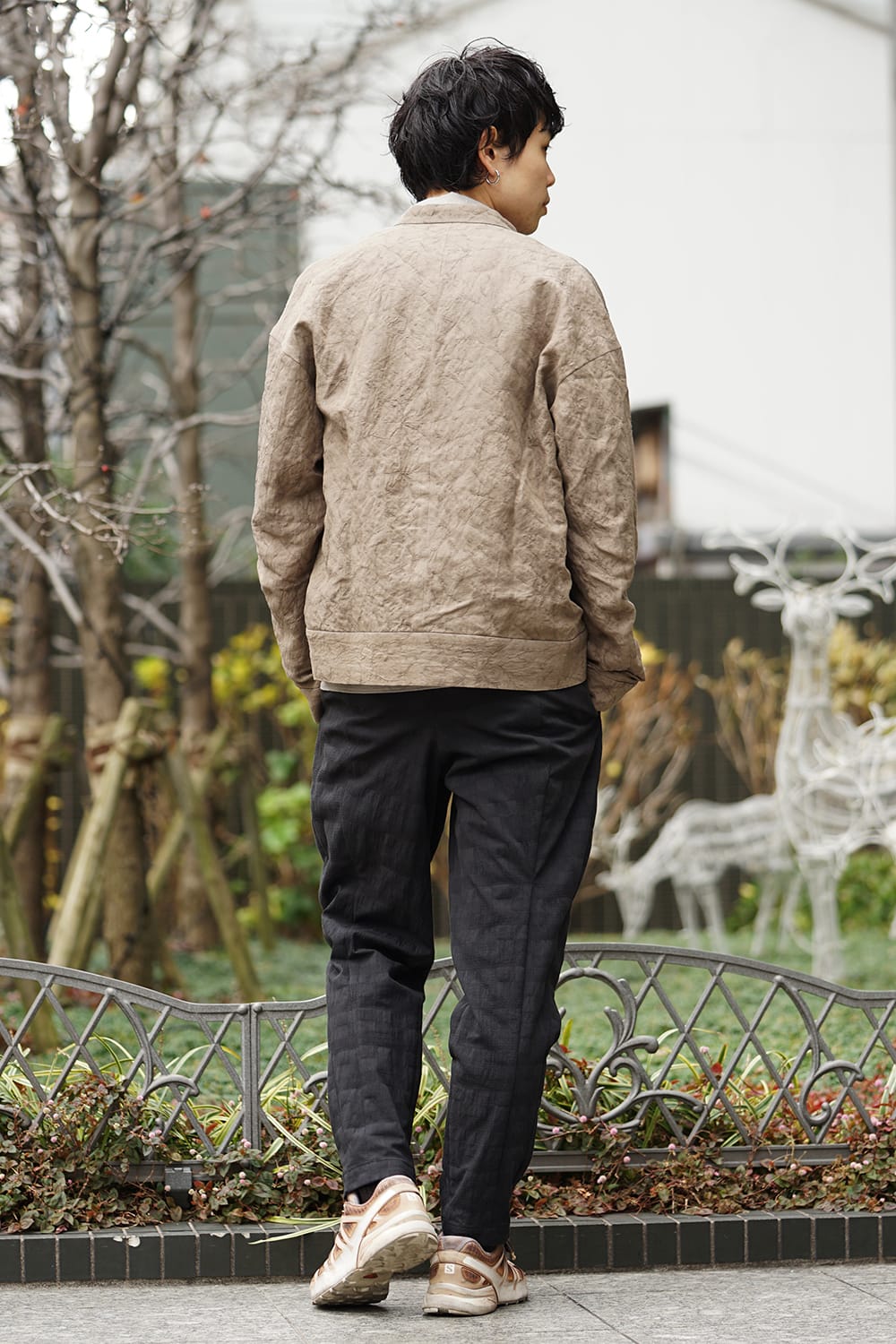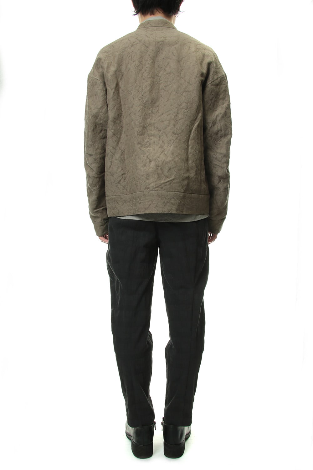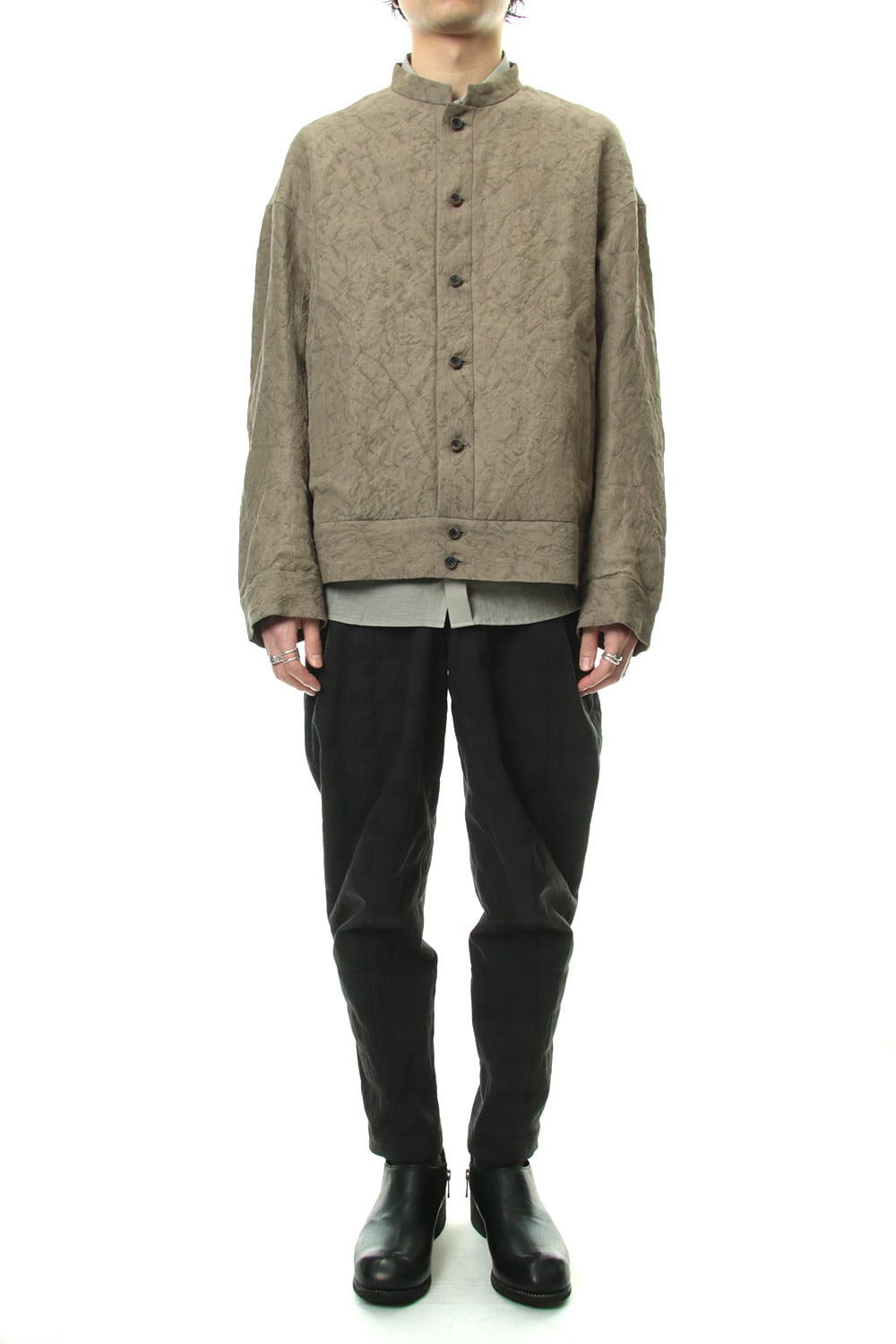 オリエンタルな雰囲気のシンプルなノーカラージャケットです。 サイズ感はゆったりとしたドロップショルダー。 着丈が短めに設定されているので、ブルゾンのような感覚でも着ることができます。