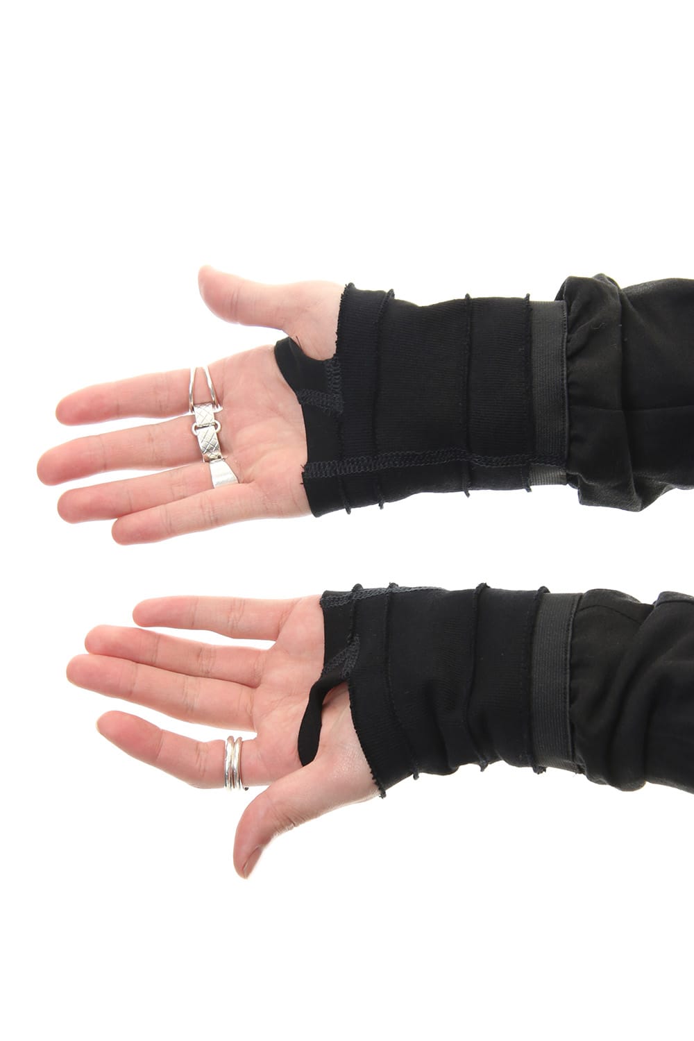 背中に大きくタックを取る事で背面にボリュームをつけたパターンバランスで制作しています。袖口はバンテージ風のデザインサムホール仕様。