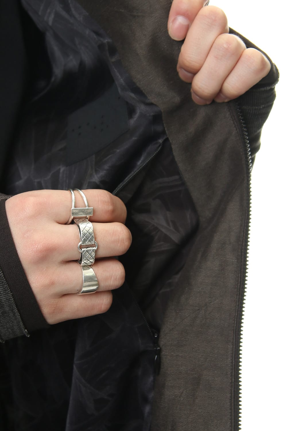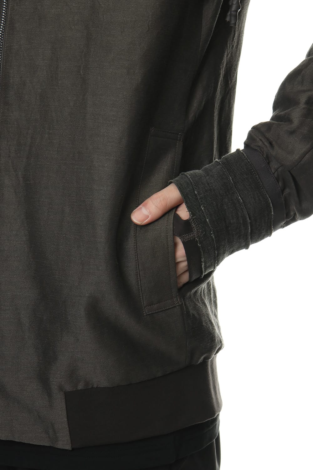 シルクとリネンでボイル組織を制作し、サンドブラスト加工によって独特の柔らかさを作りだした水洗い可能な生地を使用したボマージャケット。